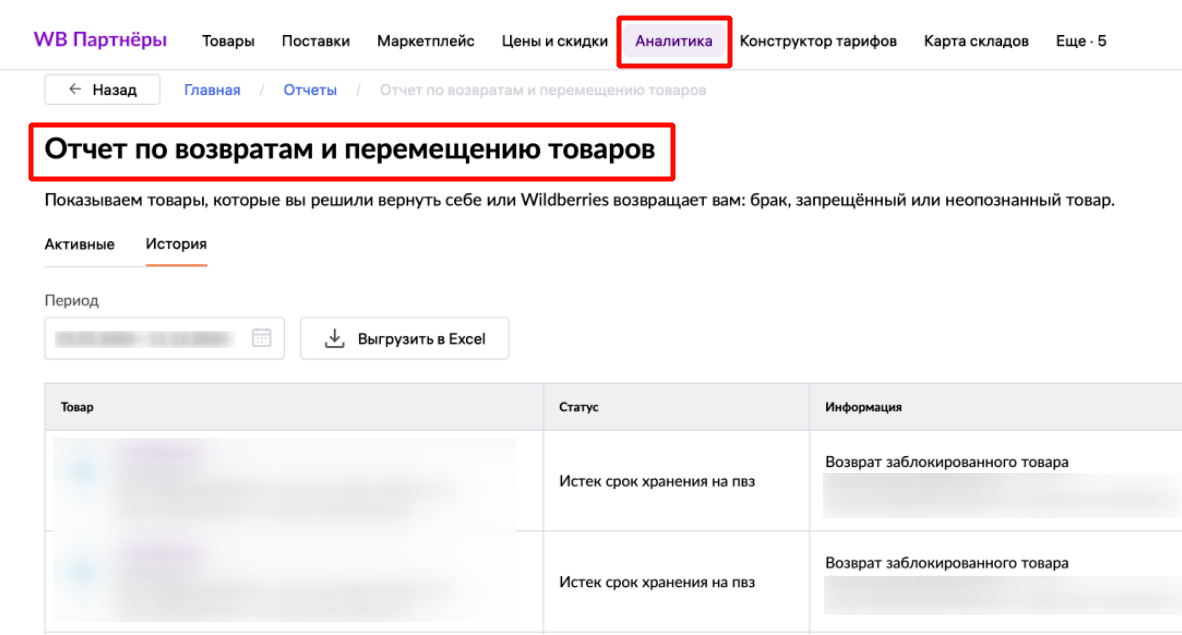 - Следите за возвратами, особенно с причиной «брак». Для этого «Отчет по возвратам и перемещению товаров» в личном кабинете.