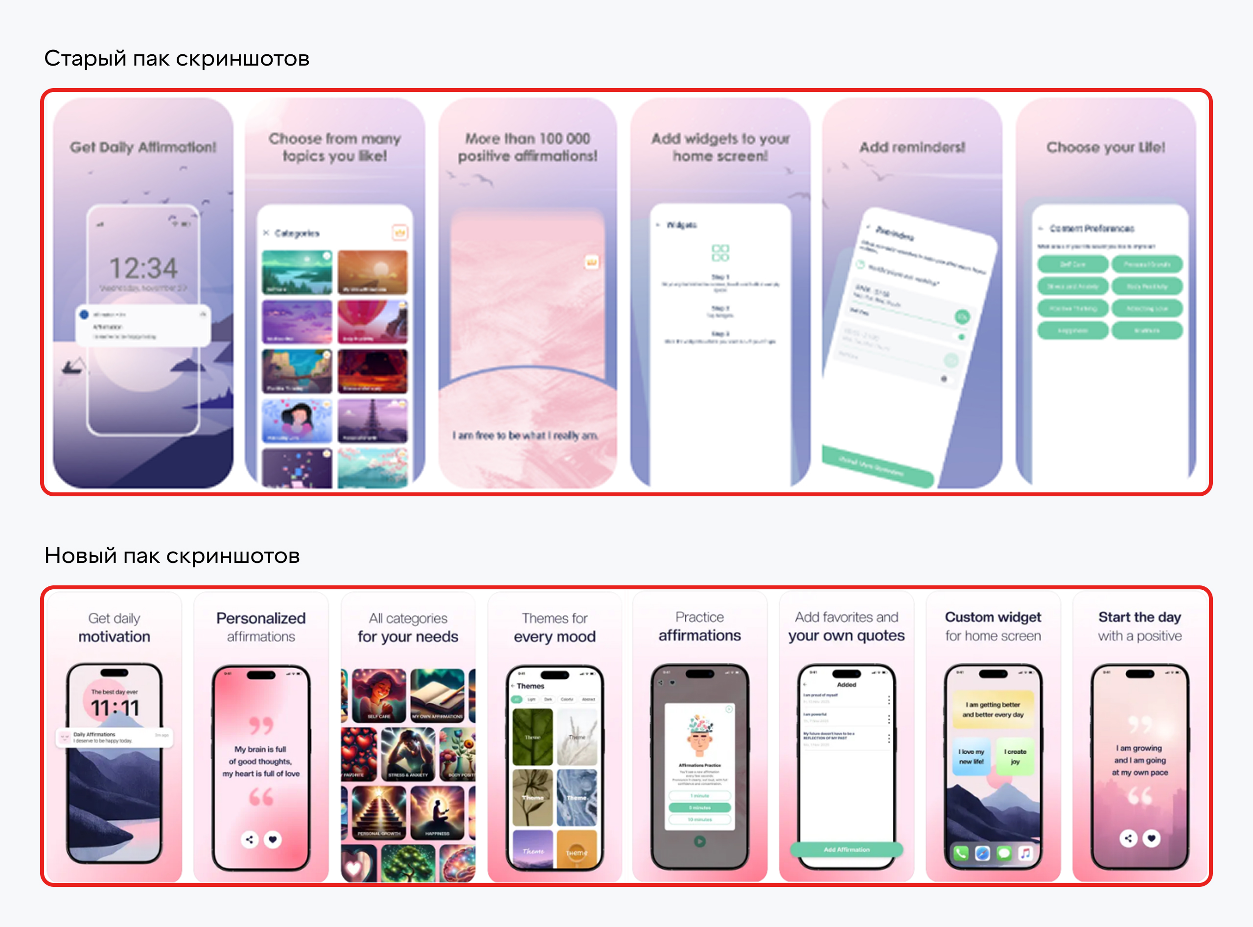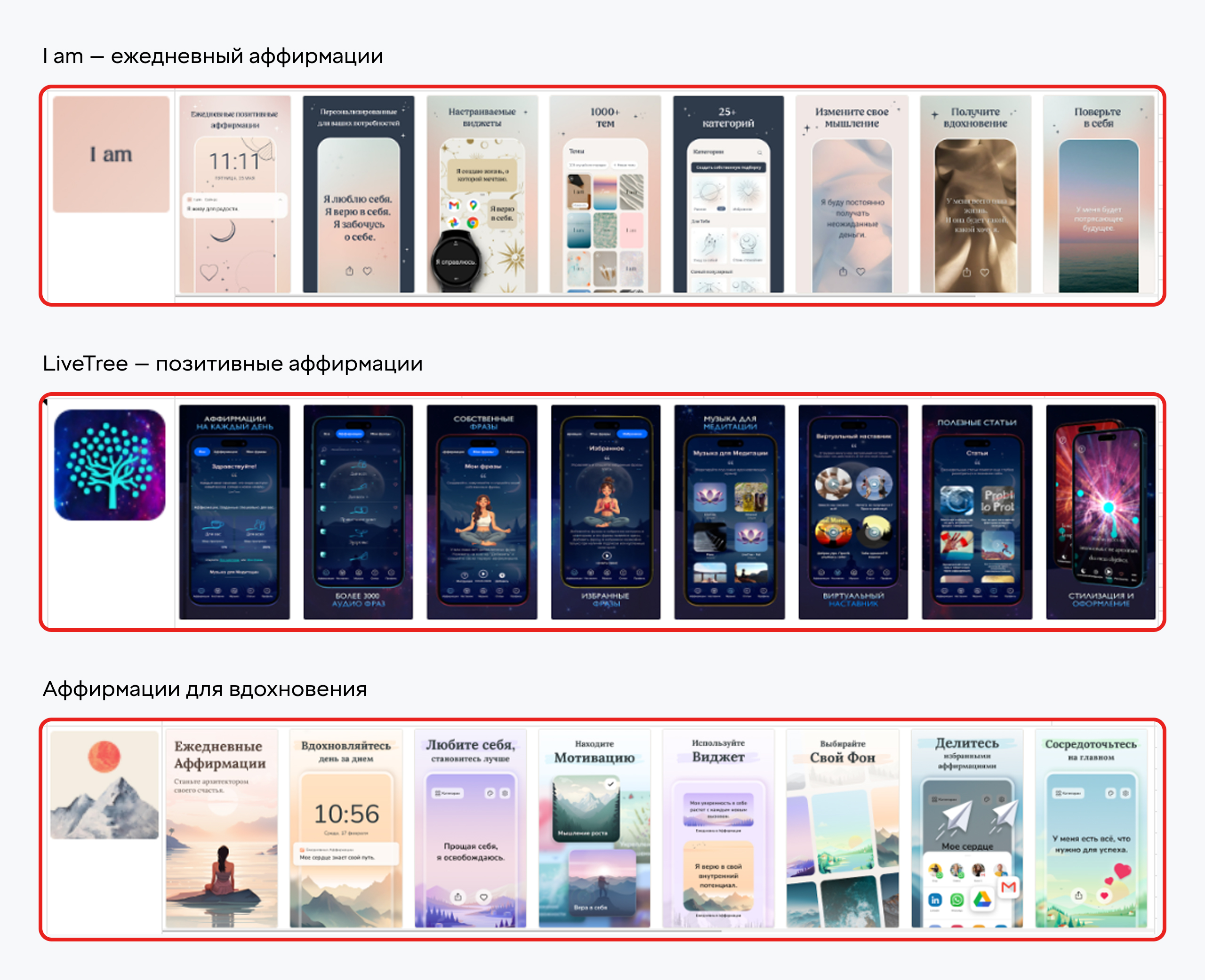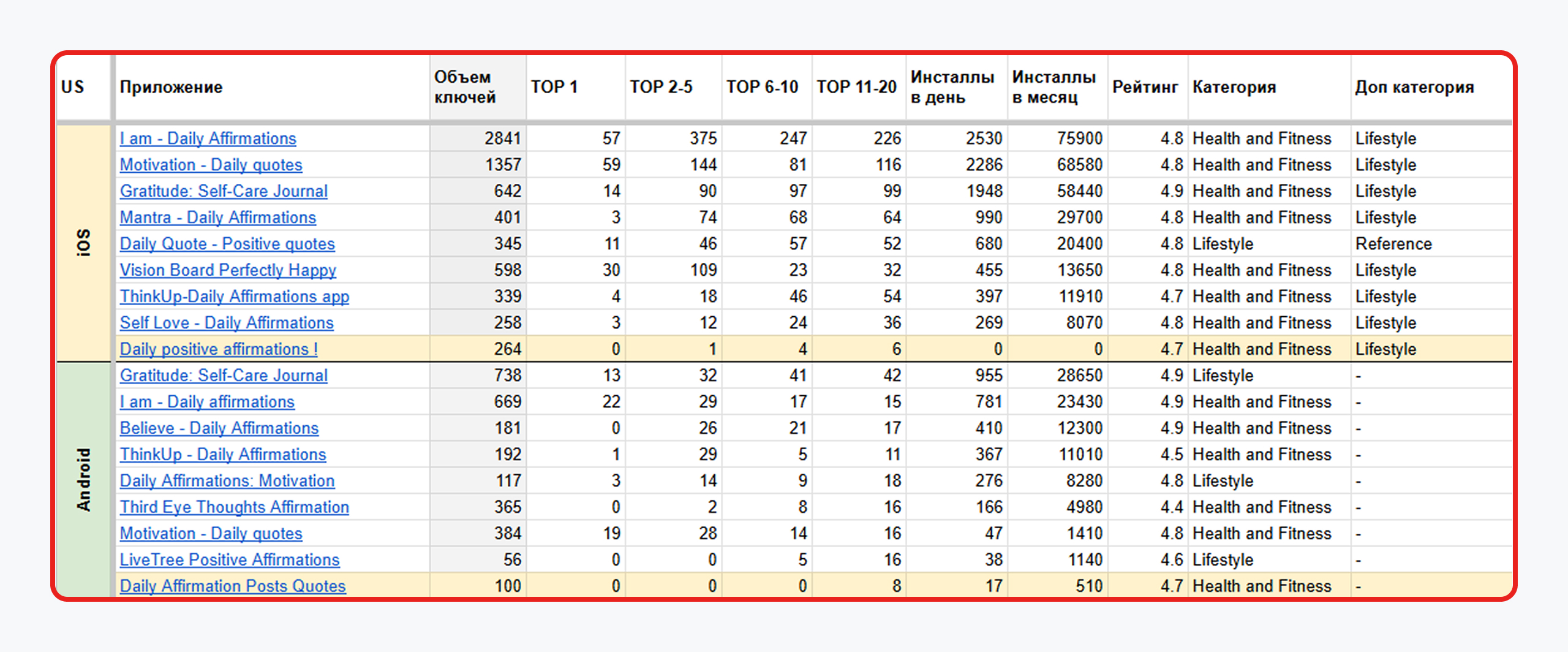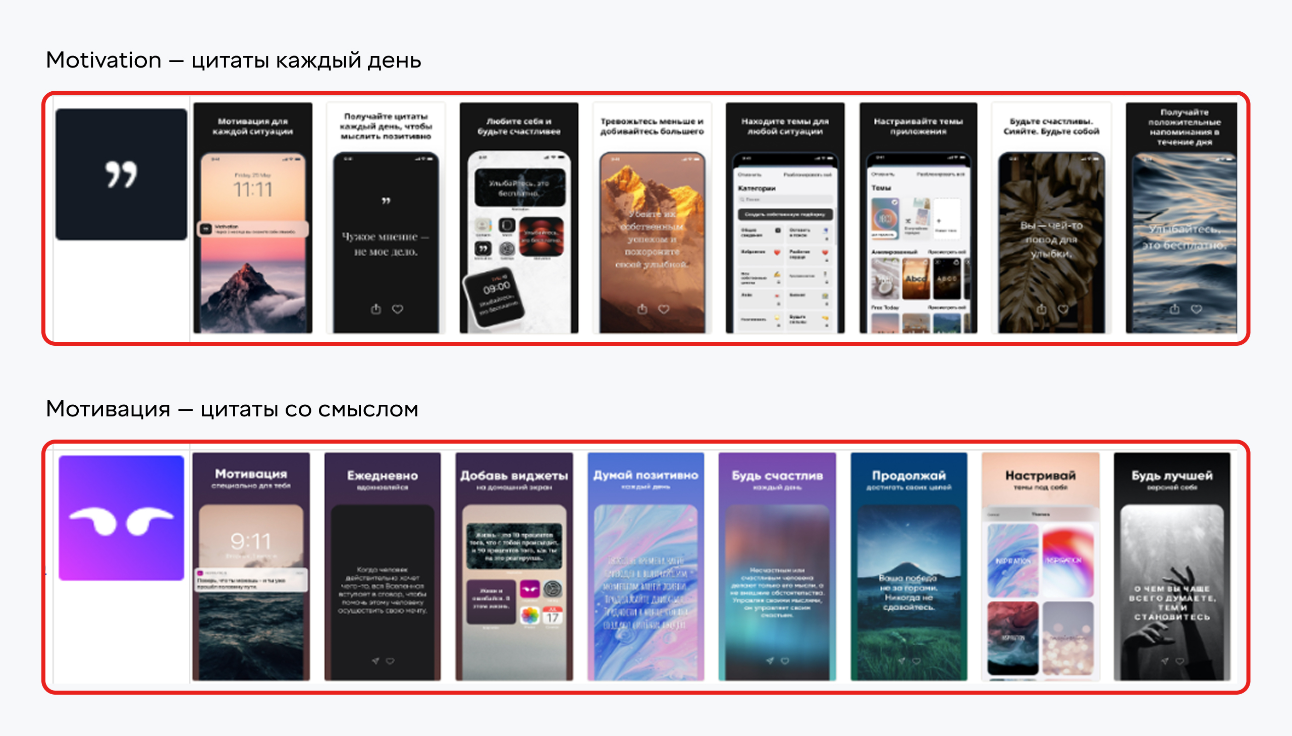Ниша мотивационных приложений и аффирмаций перенасыщена крупными игроками, которые активно занимают топовые позиции, обновляют контент и закупают трафик. Это значительно усложнило нашу задачу.