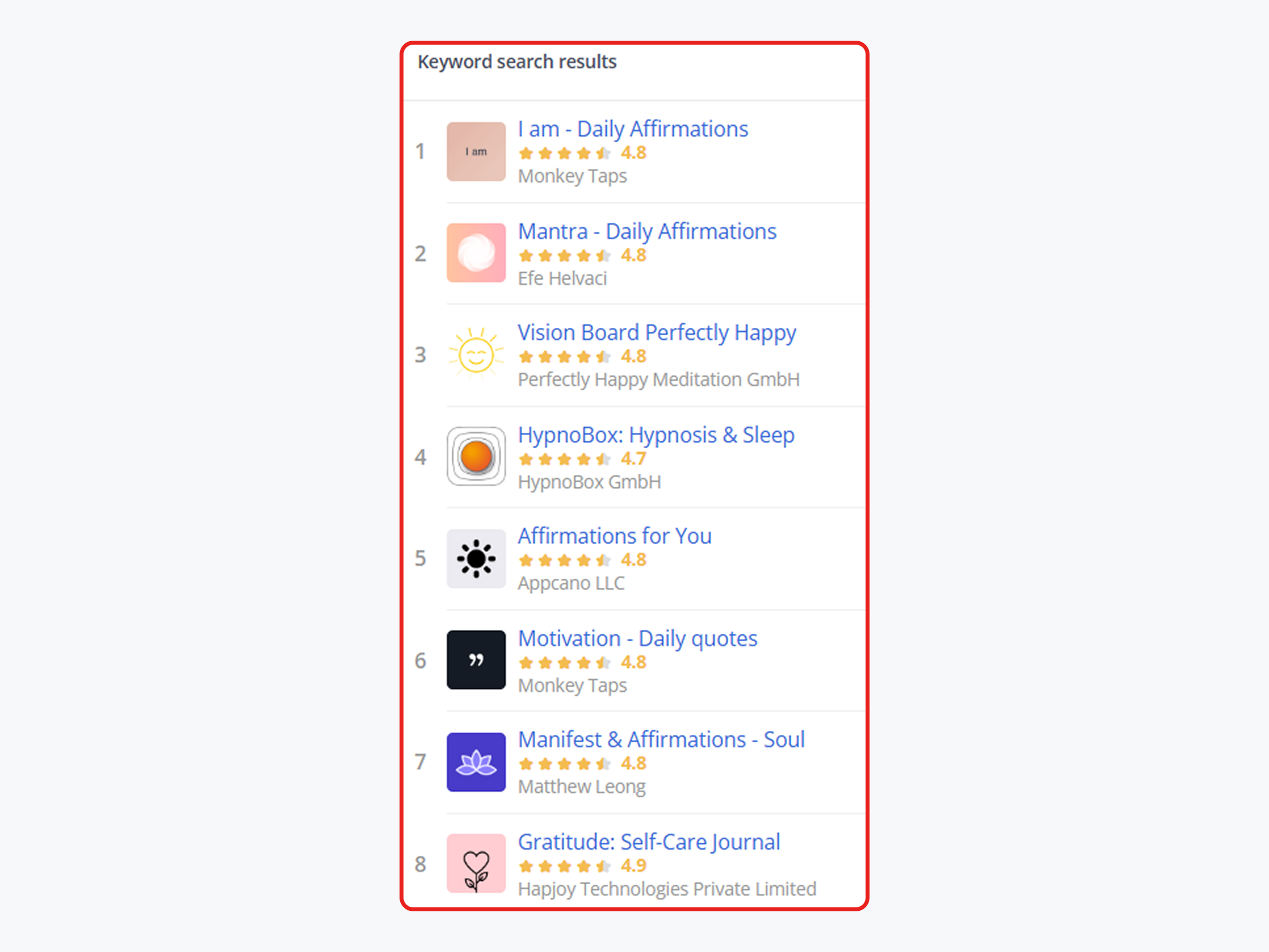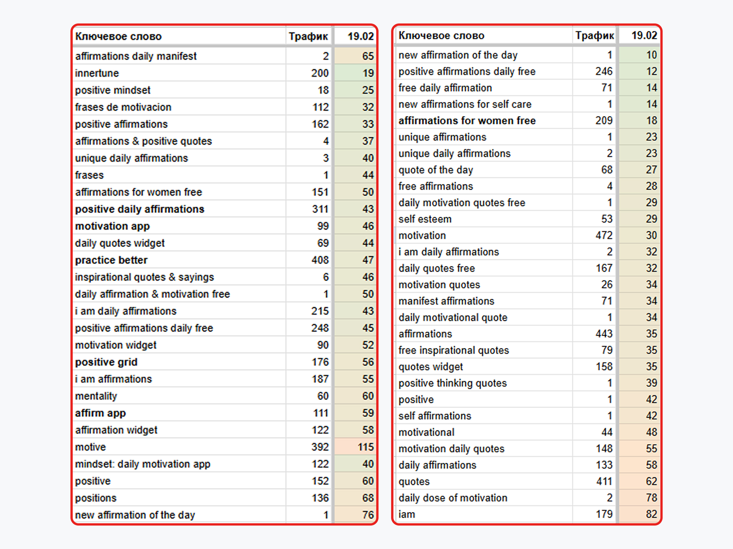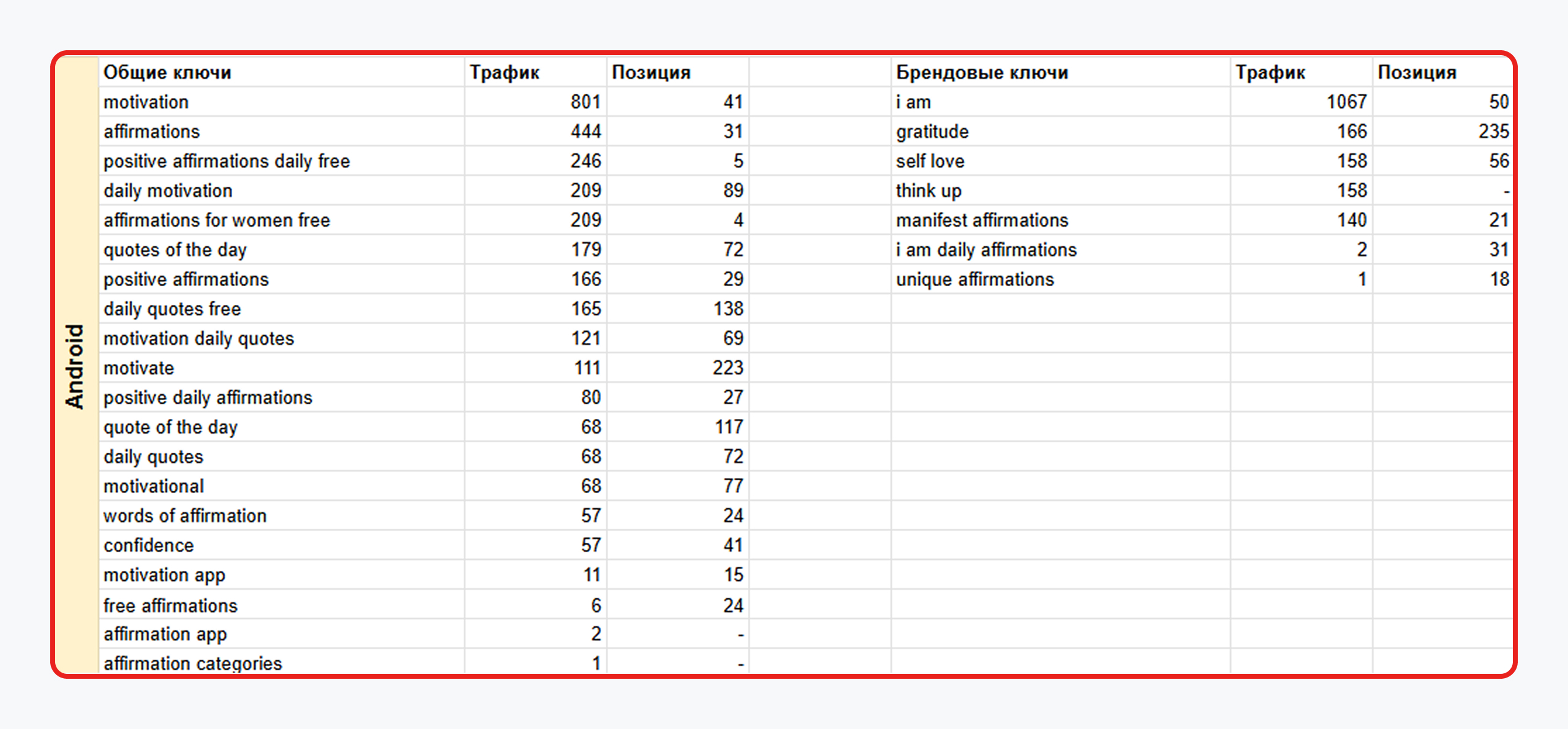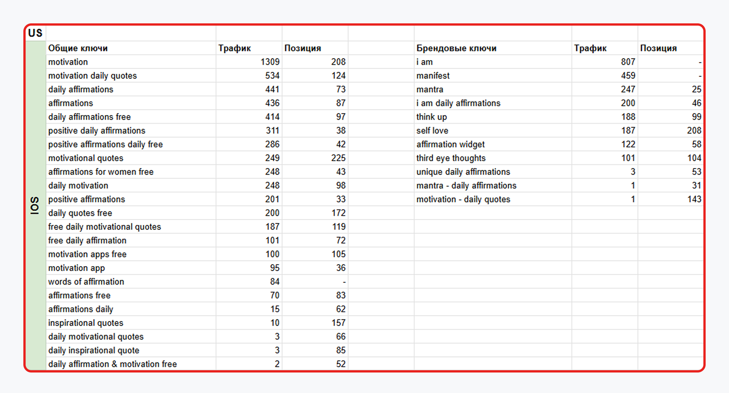 Ниша мотивационных приложений и аффирмаций перенасыщена крупными игроками, которые активно занимают топовые позиции, обновляют контент и закупают трафик. Это значительно усложнило нашу задачу.