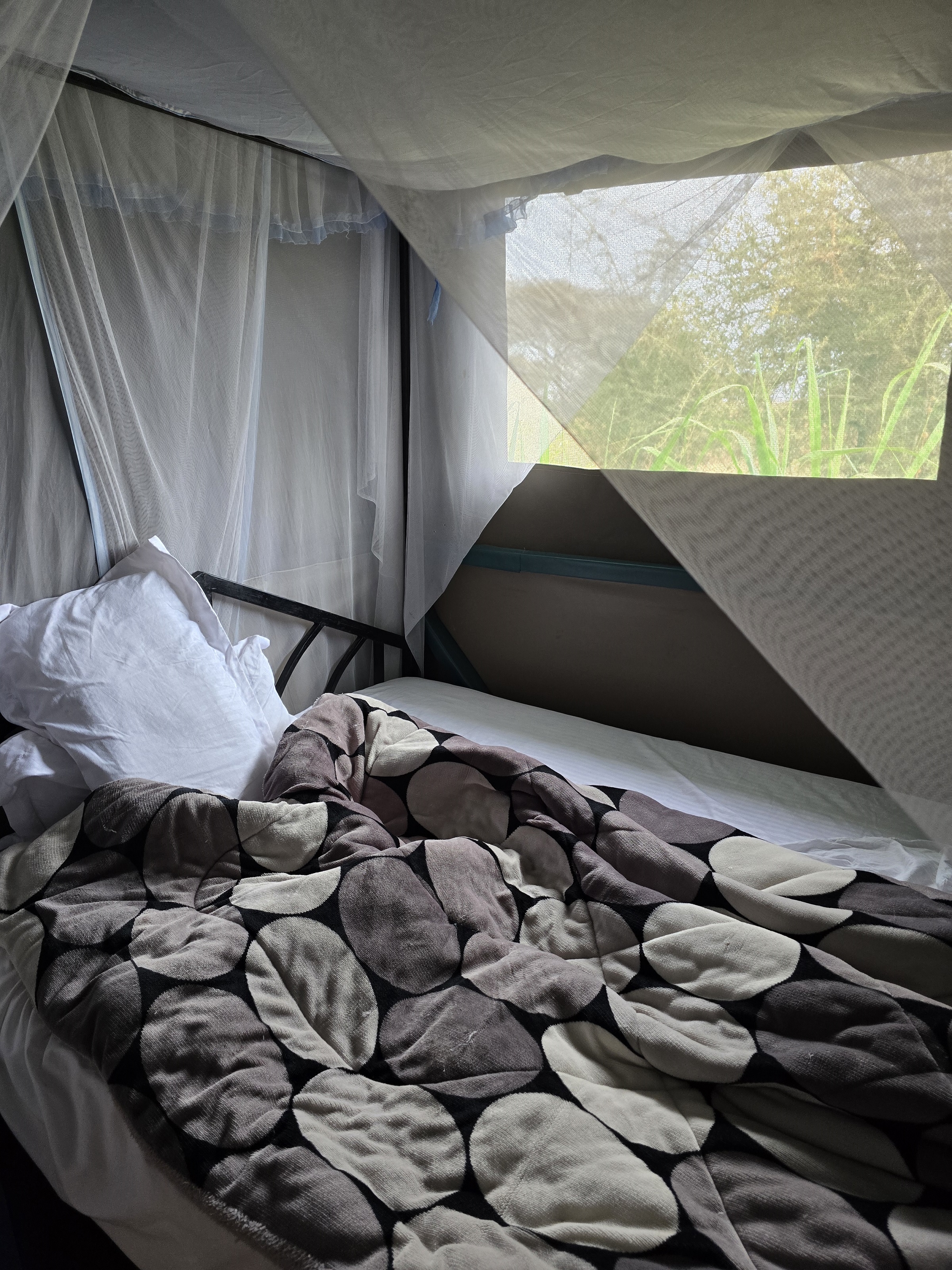 Мы жили в палатках, а на озере Накуру в гостинице. Палатки стоят на помосте, внутри кровати, ванна и туалет есть, но горячую воду нужно ждать и напор слабый. В целом после game drive это уже не так важно, я падала на кровать, разбирала фото и спала детским сном, просыпаясь от будильника. Соседей хорошо слышно, но все были примерно такими же. Гостиница на озере Накуру с тёплым номером, хорошей кроватью и душем воспринималась как роскошь. Но честно говоря, рядом с парками жить в палатках даже органичнее.
