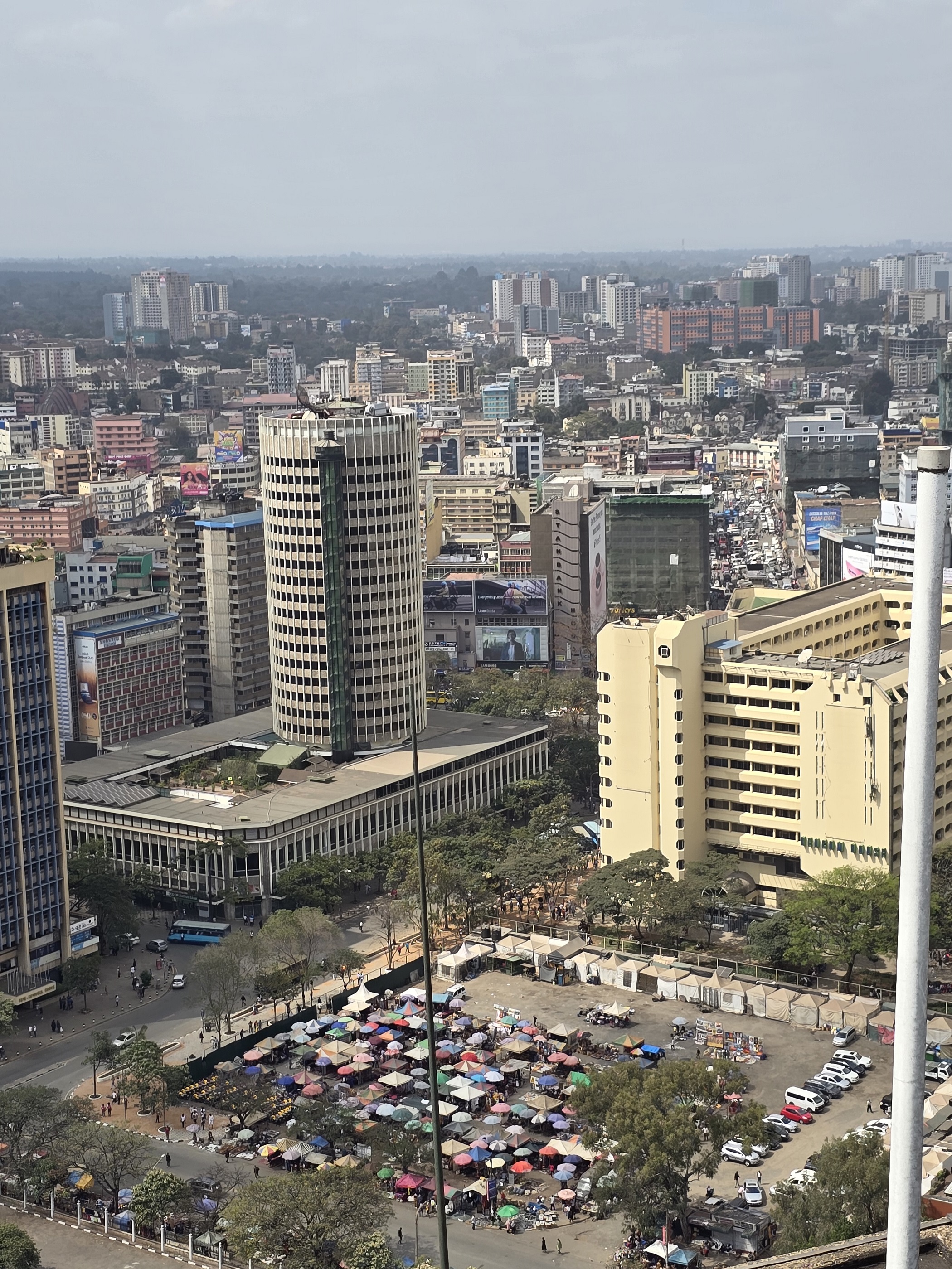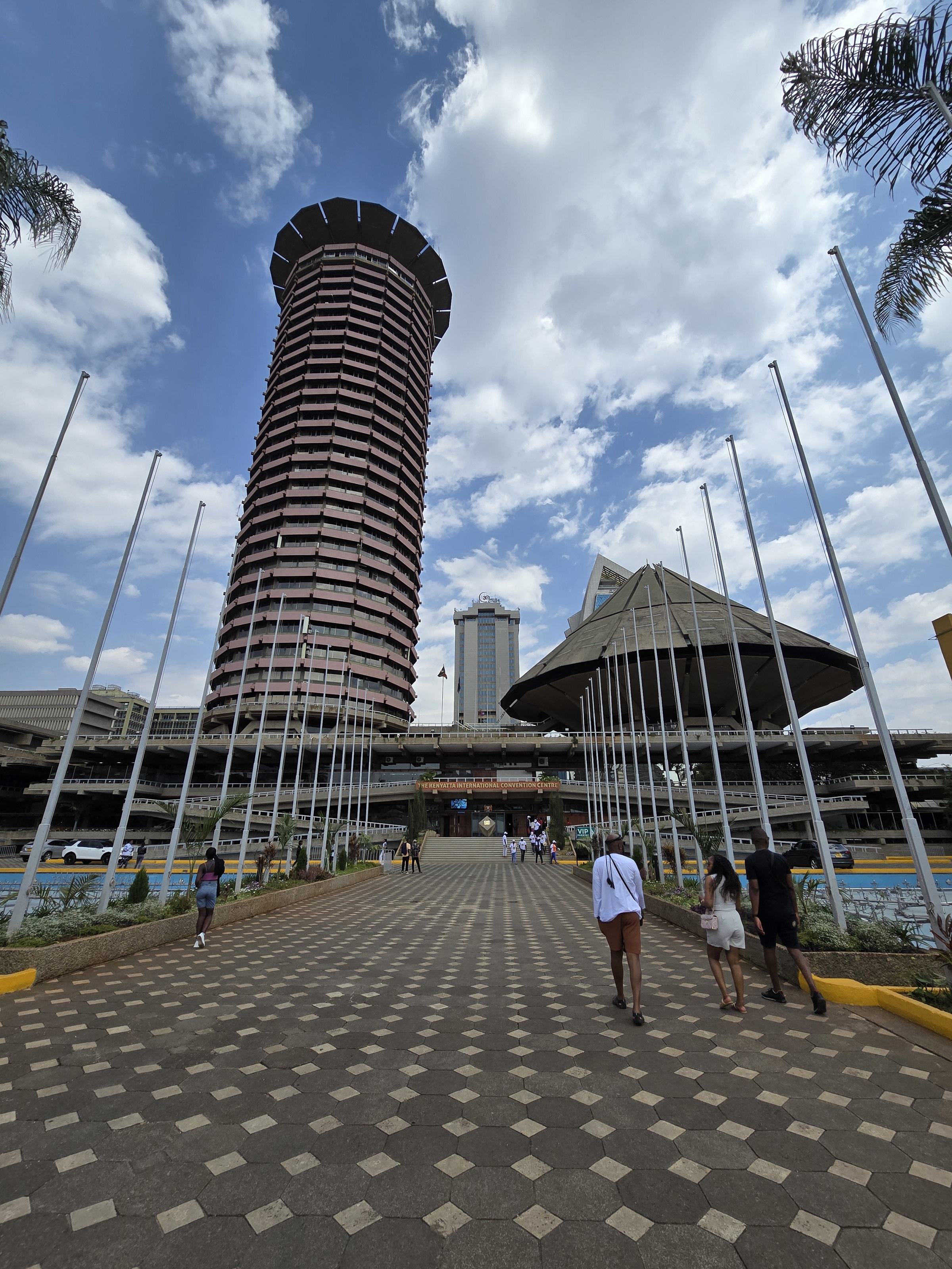 Лучший вид на Найроби открывается в Keniatta International Centre, это круглая башня в 32 этажа, построенная в стиле брутализма 70х, открыта в 1973 году. Башня является частью большого конференс — центра, рядом здания парламента, Верховного суда, банки, гостиницы., Территория центра охраняется и на ней проводятся мероприятия, мы запарковались на стоянке и прошли через охрану.