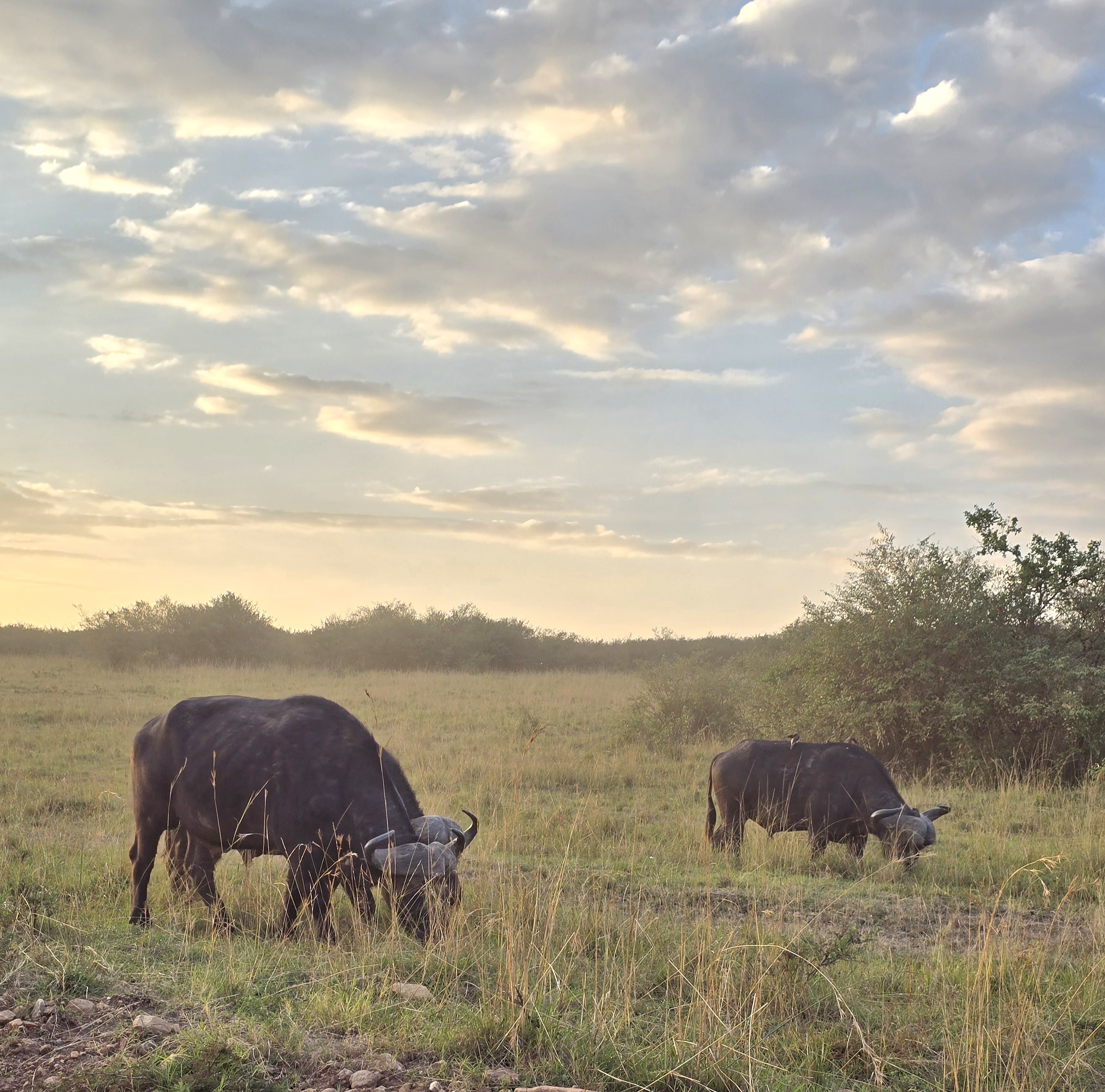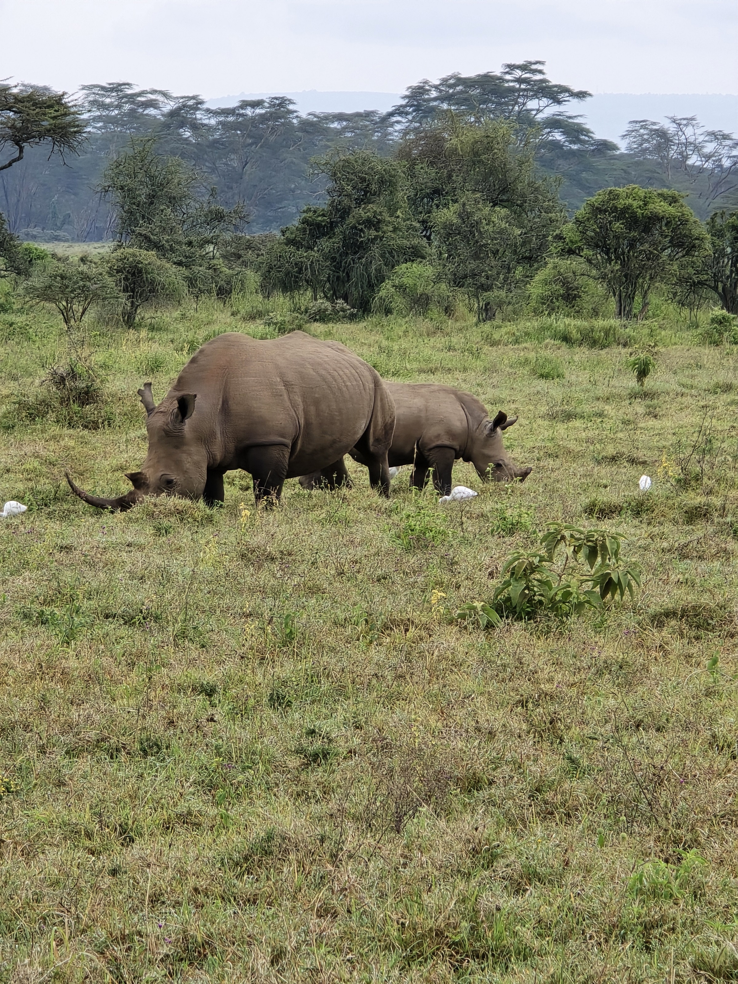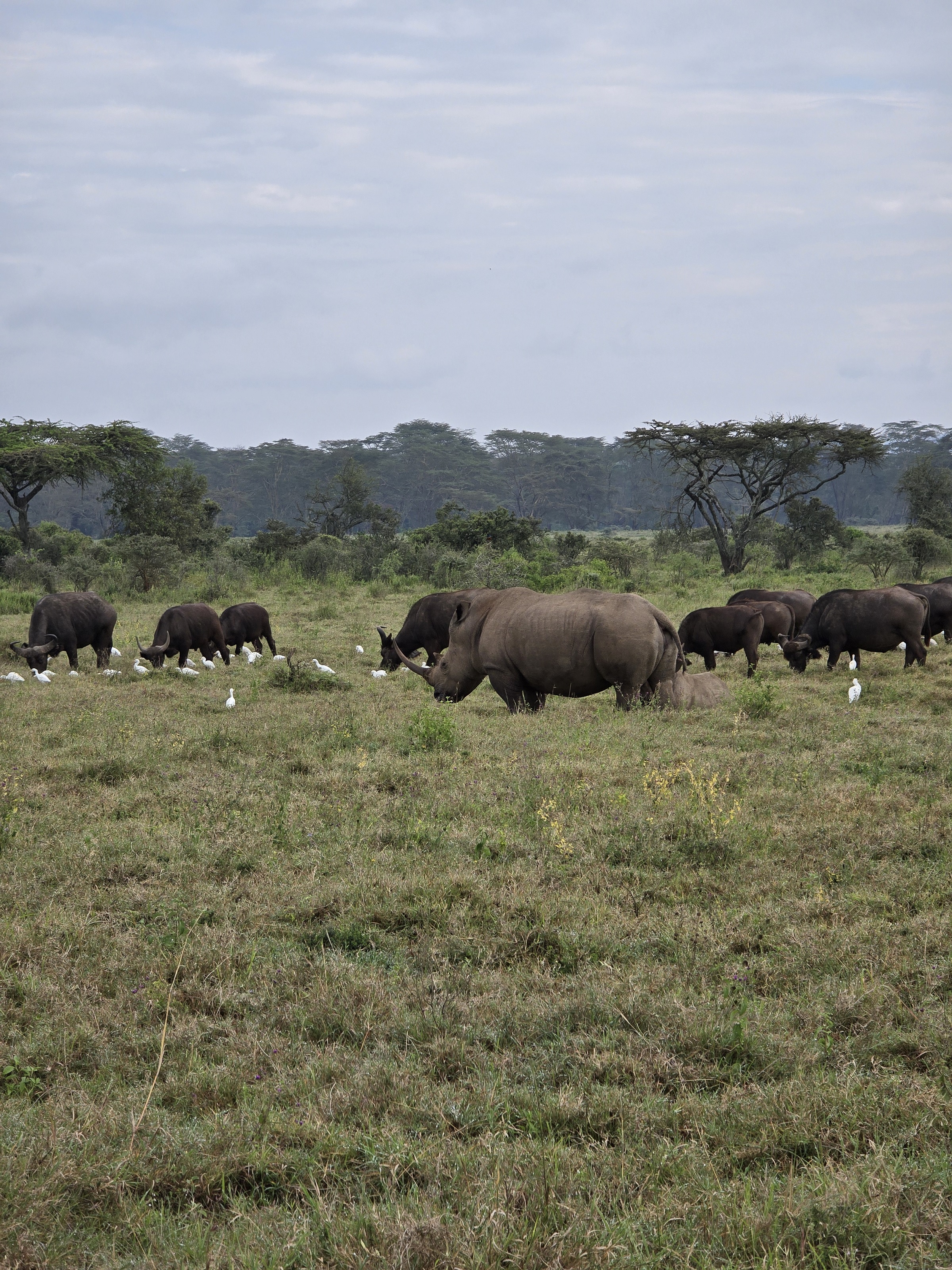 Нас встретила пасторальная сцена: на большой поляне паслись самка носорога с детёнышем и большое стадо буйволов. Они медленно сходились на встречных курсах, вокруг буйволов кружили белые птицы, которые кормятся насекомыми. Маленький телёнок носорога не отходил от матери. Наконец, все эти крупные животные сошлись и продолжали мирно паслись в высокой сочной траве, а самый близкий к джипу буйвол иногда поглядывал на нас. Отъехав, мы встретили одинокого самца носорога.
