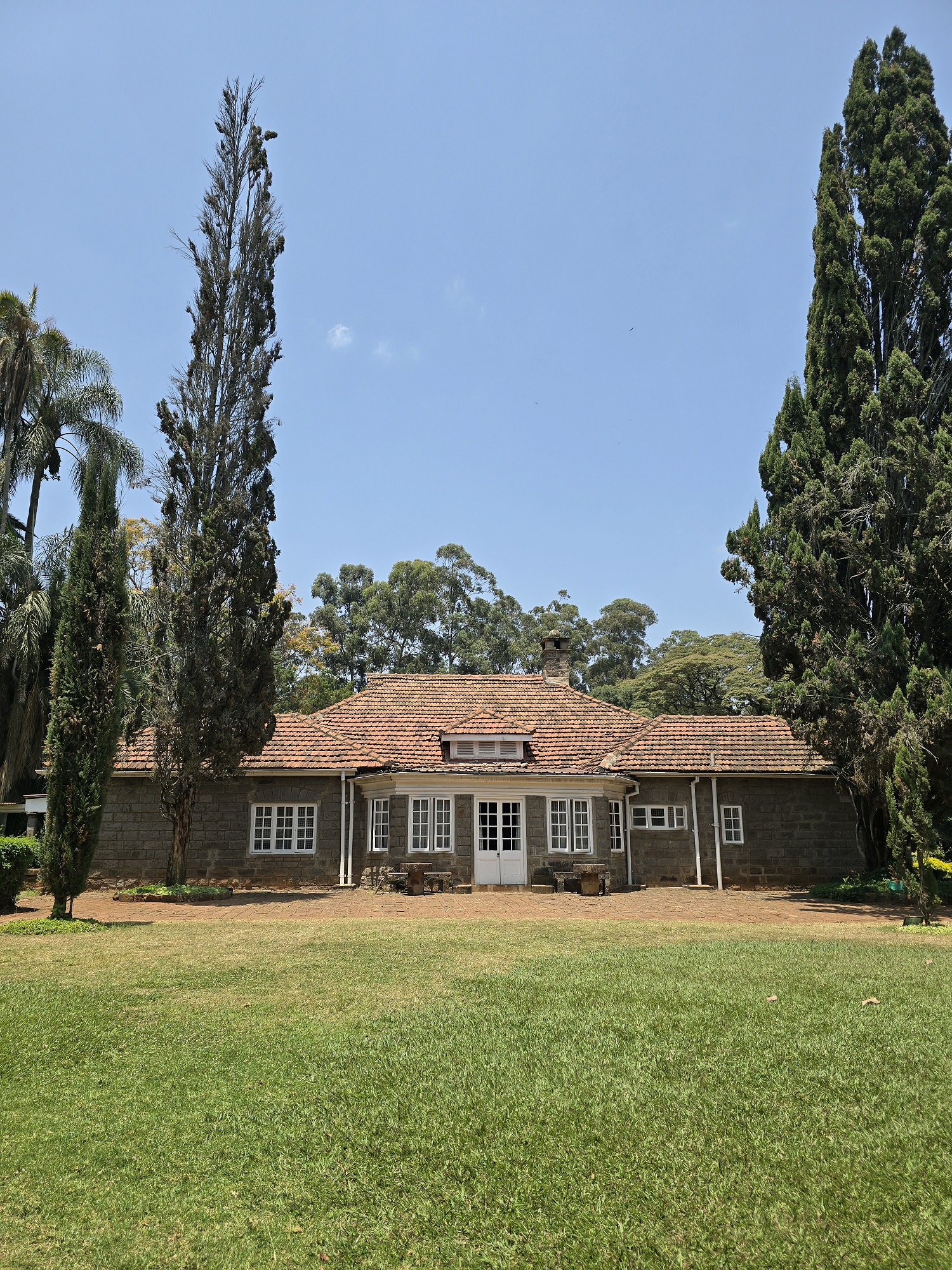 Я её очень понимаю, потому что как только попадаешь на огромную территорию усадьбы, уходить не хочется. Лужайки, зелень, открыточный скандинавский домик с коллонадой, мягкое солнце, пение птиц, нега и спокойствие. Билет стоит 1200 KES, наличные не принимают, водитель оплачивал билет по Mpesa. В билет входит экскурсия, и невысокий парниша из племени кикуйу (то самое, которое жило здесь при Карен), повёл меня вовнутрь, снимать фото в доме запрещено. Дом — маленькая Скандинавия на экваторе, внутри облицован тёмными деревянными панелями, мебель из северной Европы, привезённая или сделанная на месте. Хорошая библиотека, много книг, много подлинных вещей. Как принято в те времена, раздельные спальни и у каждого — узкая односпальная кровать. Ванная и туалет внутри дома, но без коммуникаций, их чистила и наполняла водой прислуга. Отдельная кухня с основным домом соединена галереей. С большим удовольствием я провела здесь пару часов