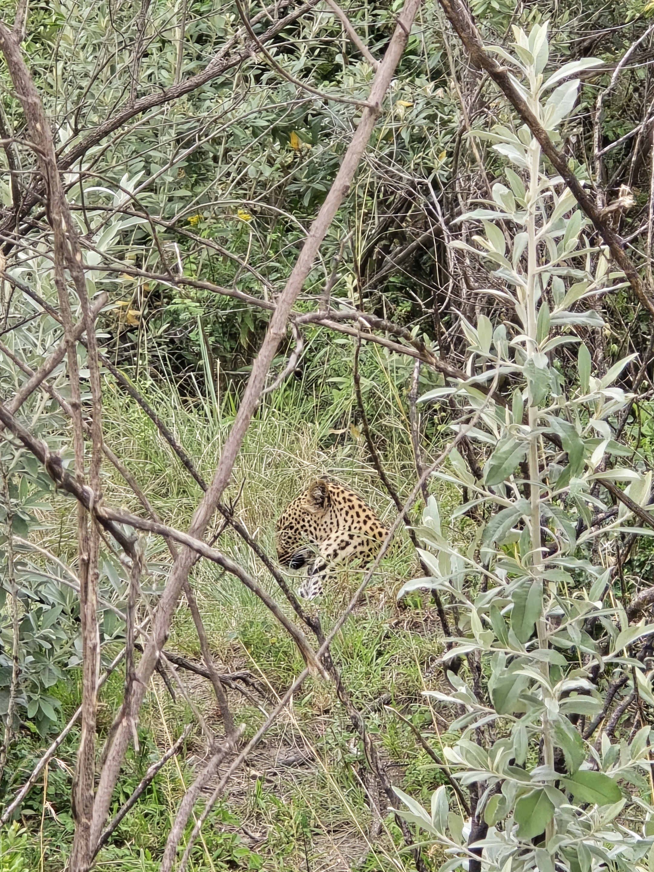 Сафари — очень азартное занятие, это охота, но глазами. Водитель включил рацию, и постоянно переговариваясь, куда-то полетел. По дороге мы остановились посмотреть на зебр, буйволов, жирафов, сказочно прекрасных. Но нас ждал ОН! Далеко у дерева столпилось пара десятков джипов. Видите — сказал гид — леопард затащил на ветки антилопу, поужинал, и пошёл куда- то отдохнуть. Джипы окружили овраг, заросший кустами. Он тут! Перед кустами стояла пара джипов, туристы щёлкали затворами камер, джип освободил нам место и мы встали на точку. В кустарнике, мало различимый, лежал леопард, была видна только голова. «Леопарды скрытные одиночные животные, их очень сложно найти. Они терпеть не могут шум, и не выходят и укрытия. Нам повезло». Одна галочка была поставлена.