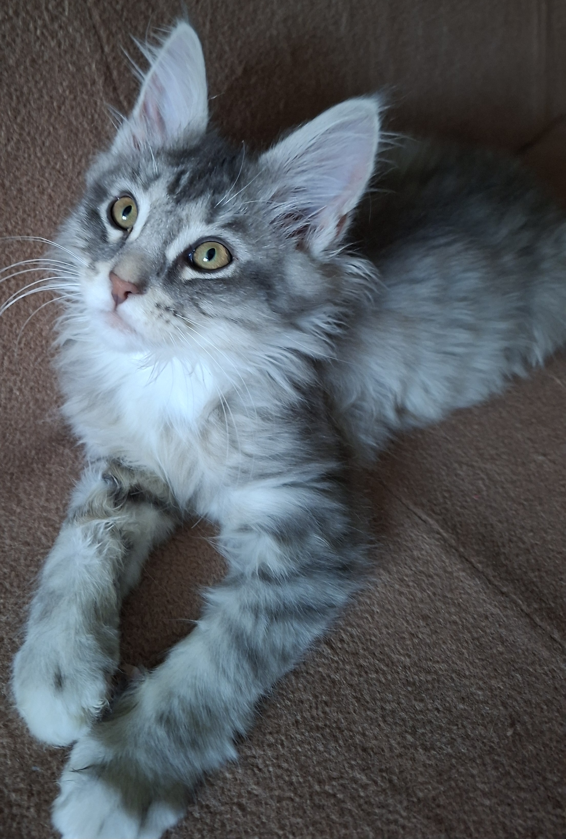 Фото питомца: котенок Иней вальяжно лежит на диване