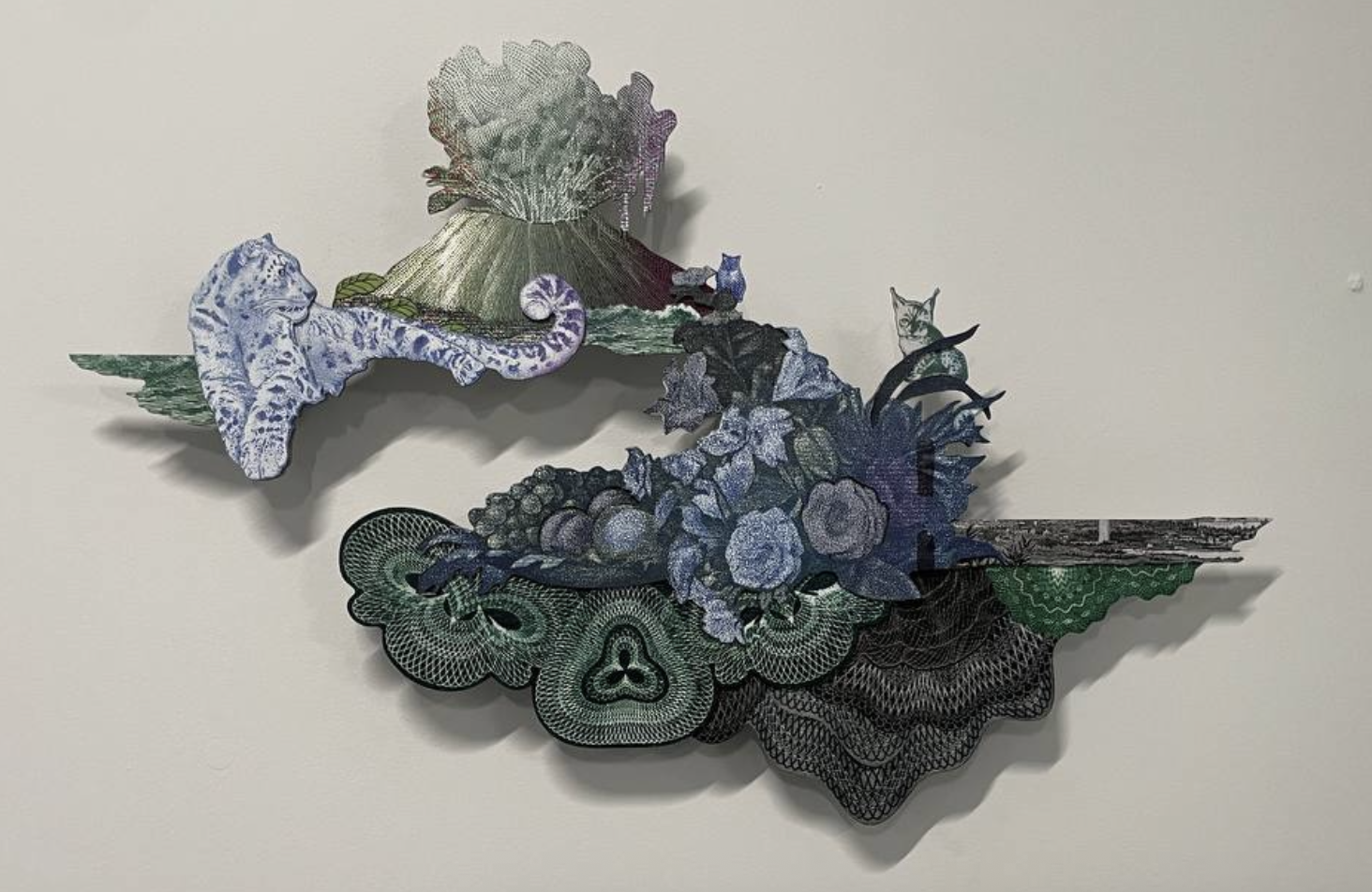 Cat is lava — еще одна работа, выполненная с использованием металла. С помощью УФ-печати на форму наносится многослойное изображение, в котором образы смешиваются в “сбалансированную визуальную синергию”.