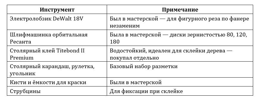 Прежде чем точить лобзик, я составил список. Часть инструментов у нас в мастерской всегда под рукой, часть пришлось докупить.