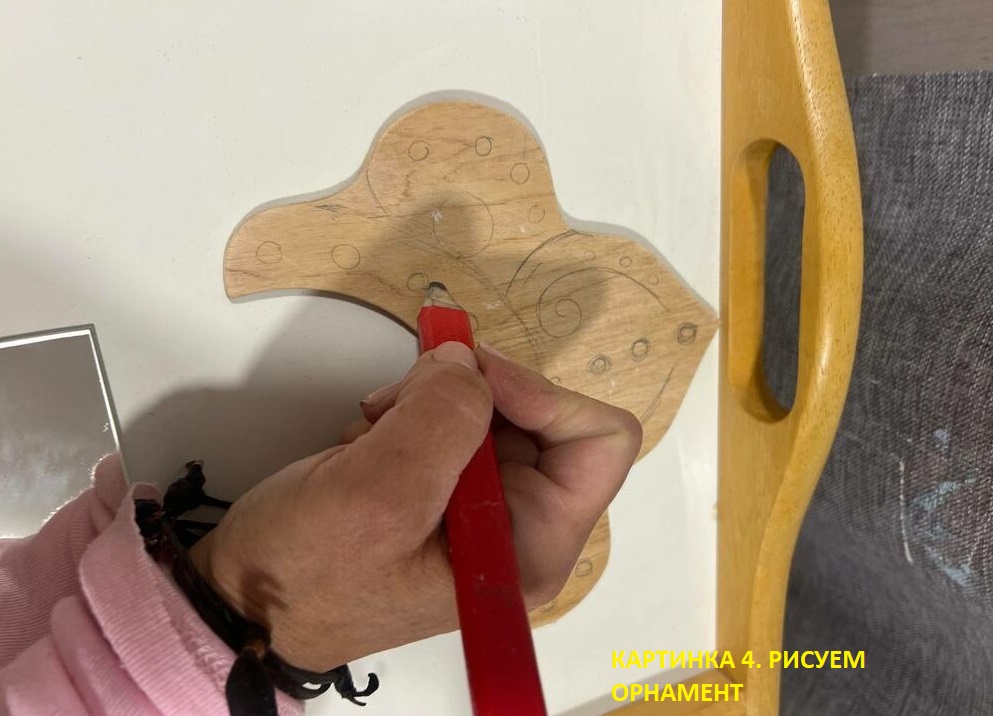 Вот тут начинается самое интересное. Мы с Антониной взяли столярный карандаш и прямо на отшлифованной фанере начали рисовать орнамент: завитки, точки, плавные линии — всё от руки. Это не резьба, а роспись, которую потом подчеркнёт краска.