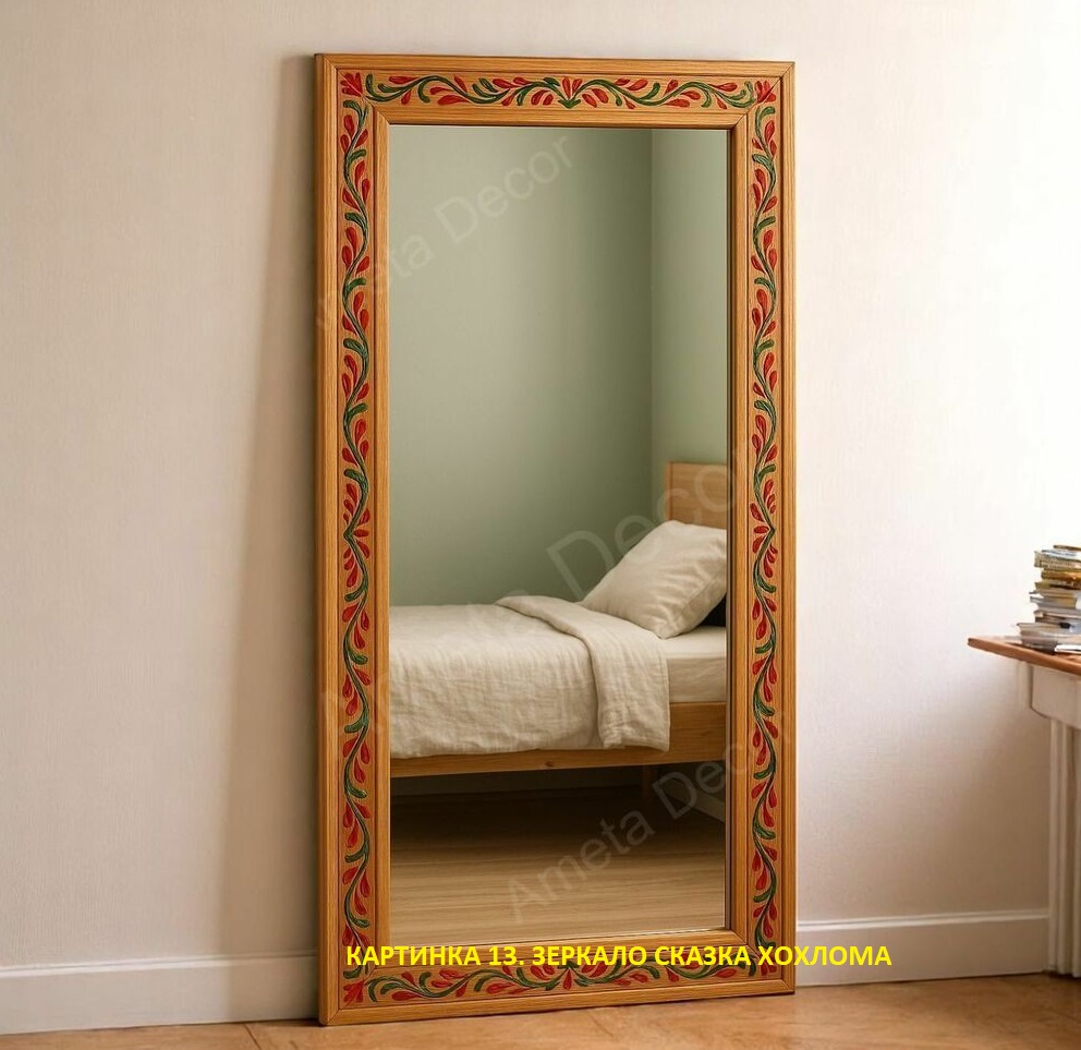 У нас в мастерской есть и другие зеркала в русском стиле — например, напольное зеркало «Сказка хохлома» с росписью по массиву,