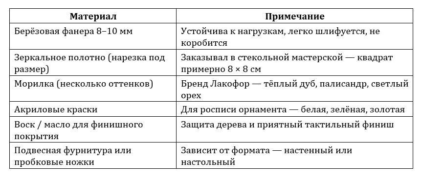 Берёзовую ФК толщиной 8–10 мм. Она плотная, хорошо шлифуется, не расслаивается при фигурном резе и красиво проявляет текстуру под морилкой. Сосновая фанера мягче и может дать сколы на тонких элементах. МДФ — вариант, но он тяжелее и не даёт той живой текстуры дерева, которая делает зеркало ручной работы по-настоящему тёплым.