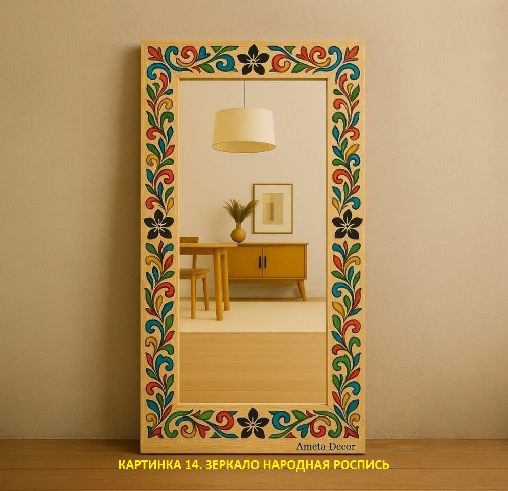 Подойдёт, если выбрать сдержанный декор и нейтральные цвета: белый, натуральное дерево, серый. Я делал вариант в стиле сканди — гладкая берёза, минимум орнамента, матовый воск. Смотрелось отлично рядом с IKEA-полками. Зеркало в этно-стиле не обязательно должно быть пёстрым.