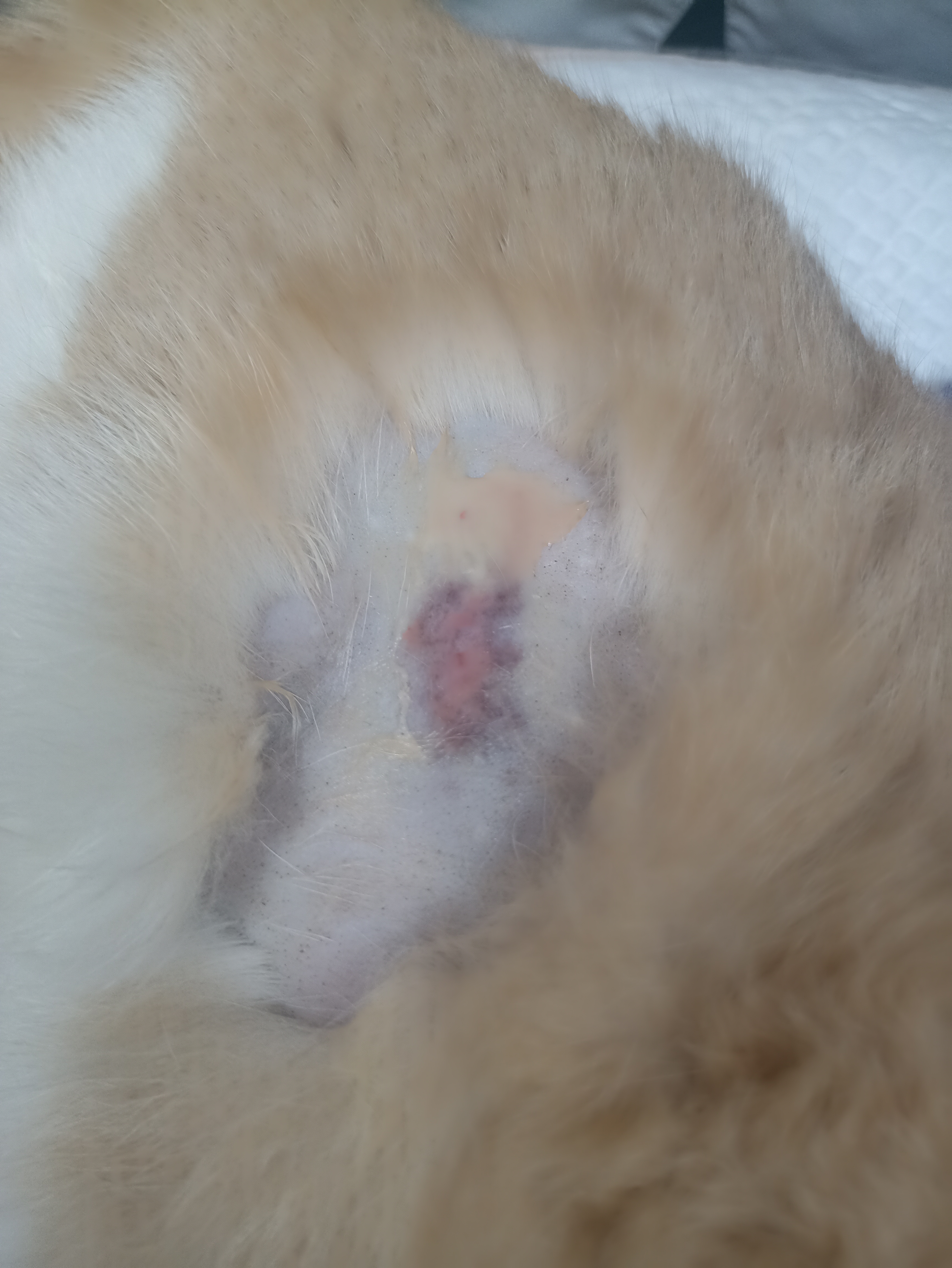 А вот по какой причине она не встает, сначало понять не смогли. Сделали рентген, кости целы. И только при пульпации на правом бедре нашли довольно большую опухоль. Оказалось, это абсцес. Вскрыли. Гноя откачали два 50гр шприца. Возникло опасение о проведении в брюшную полость, но всё обошлось. Стенка брюшины цела. Из за большого срока беременности и обширного абсцесса, стерилизовать нельзя. Ждем прибавления. Ария стала 79 животным в моем доме.