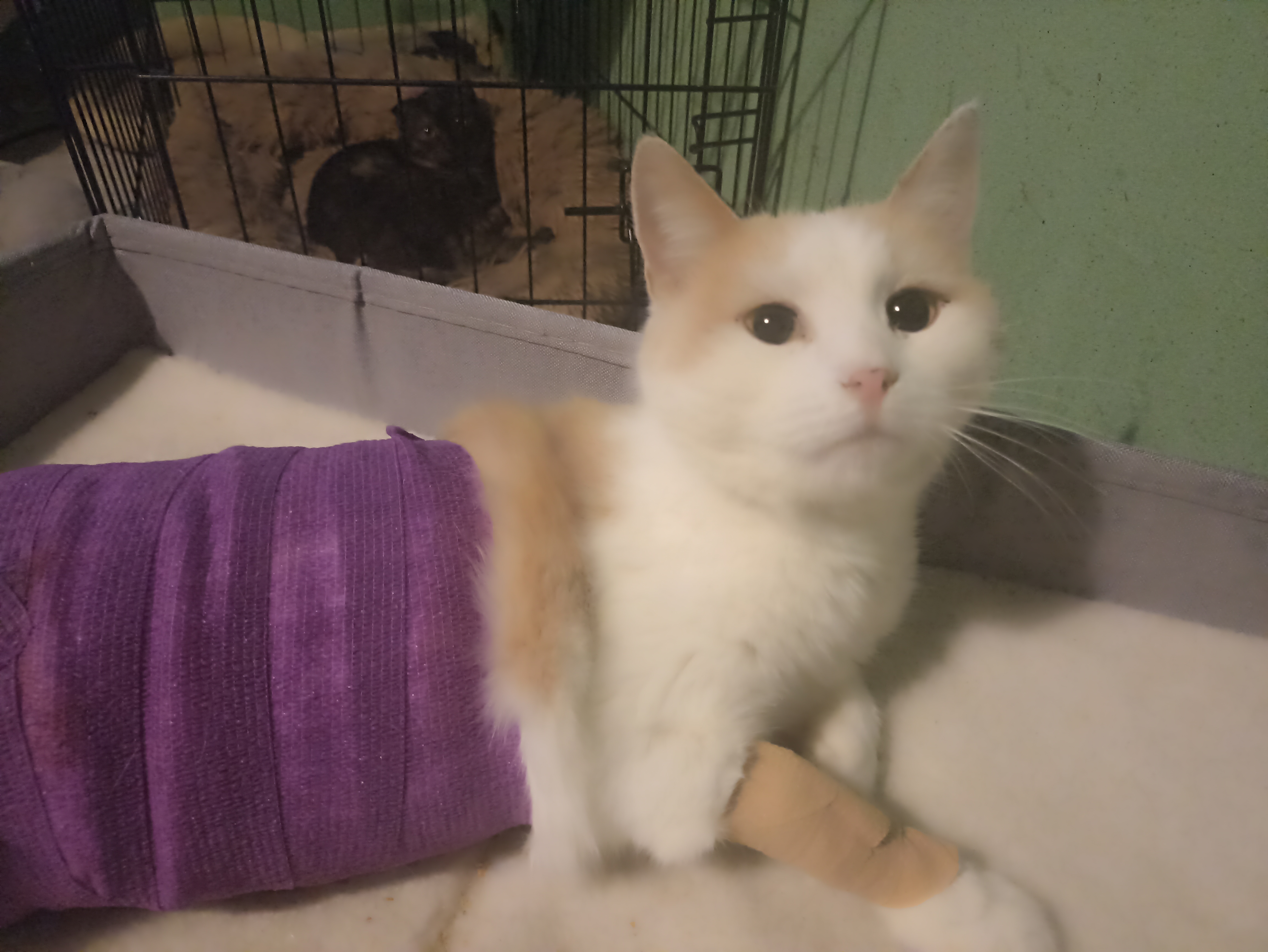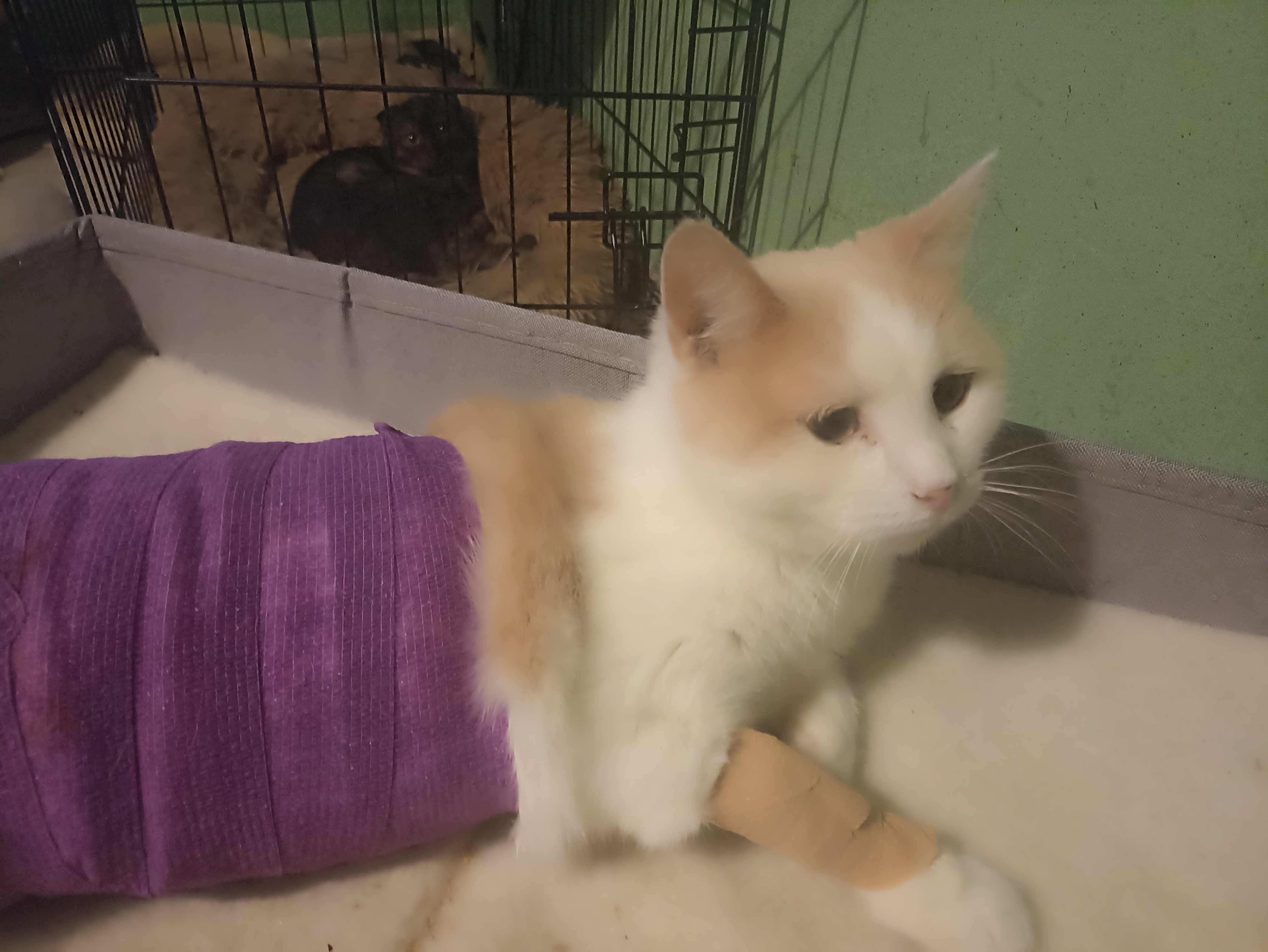Сейчас Ария в тепле, получает усиленное питание, так как очень худенькая. Еë перемещение ограничено клеткой. Ей ещё больно вставать и ходить. Но она усердно снимает повязку, которую я накладываю каждый день.
