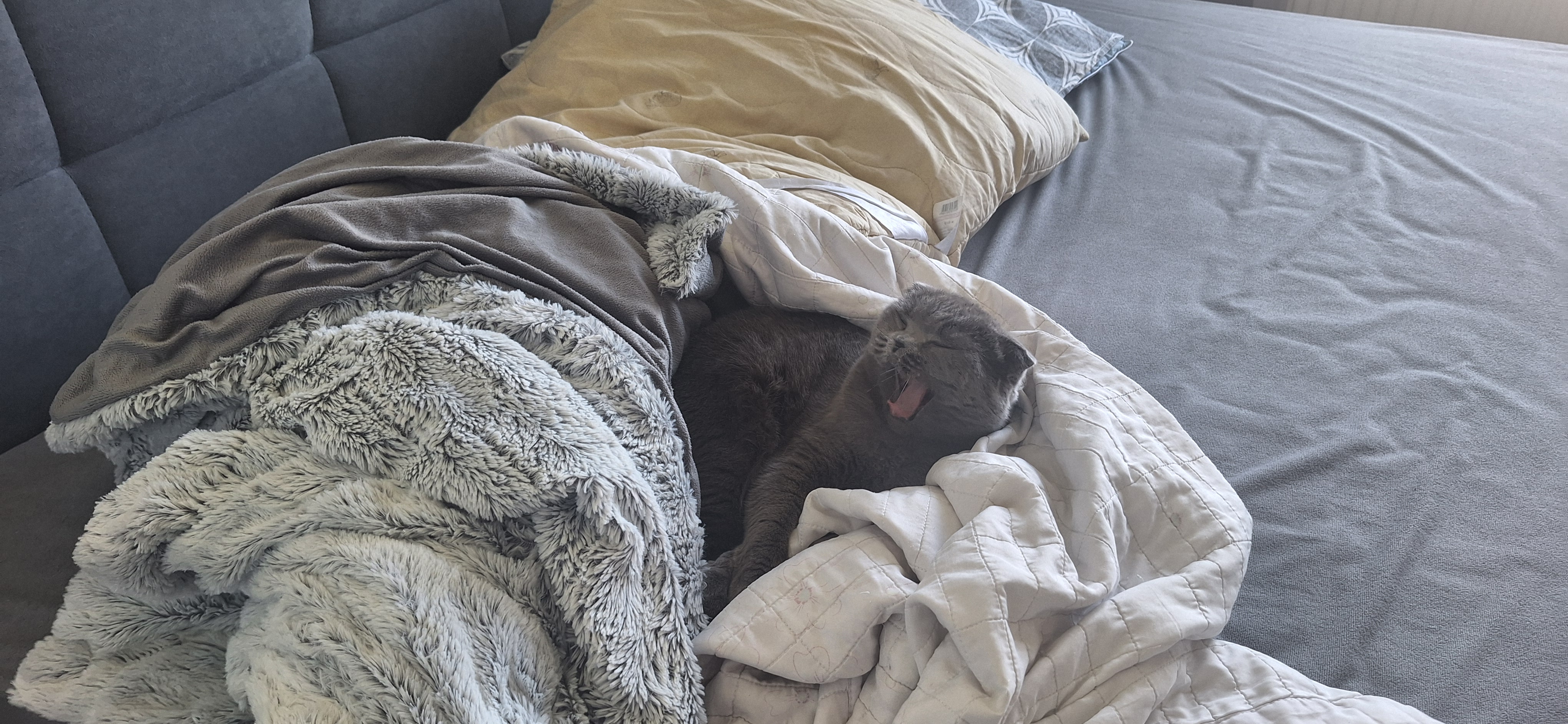 Эта деловая кошка пришла на кровать, а там лежали в куче одеяла. Так она взяла запрыгнула на них и сделала себе кокон