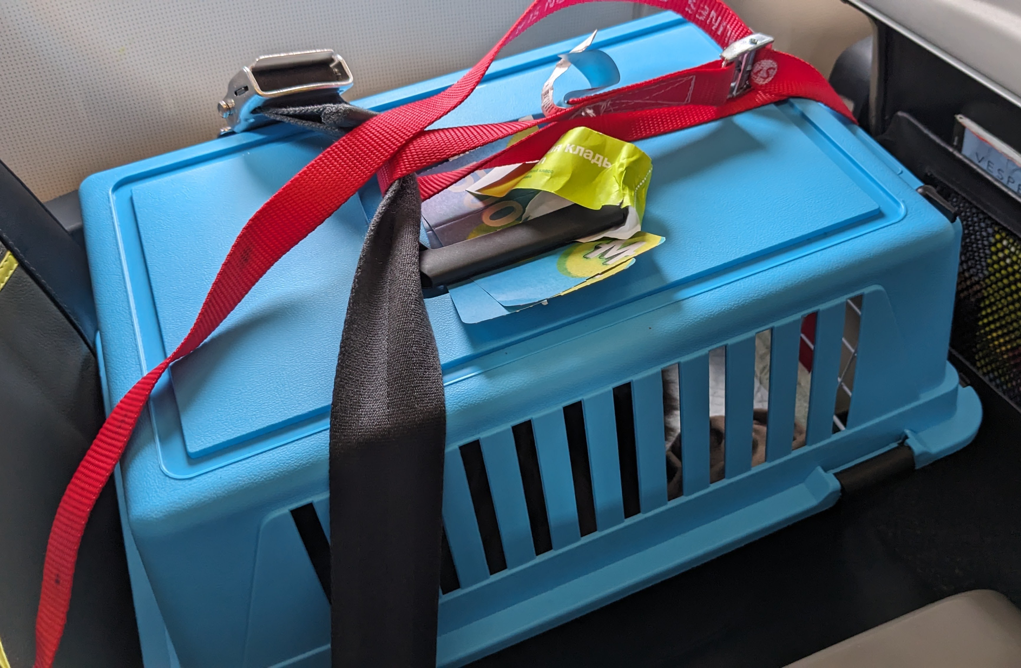 В самолёте стюард принёс мне специальный ремень для фиксации переноски на сидении, помог закрепить её, и мы полетели. Какое-то время кошка удивлялась шуму и, наверное, перепаду давления, но потом расслабилась и остаток пути провела в полусне.