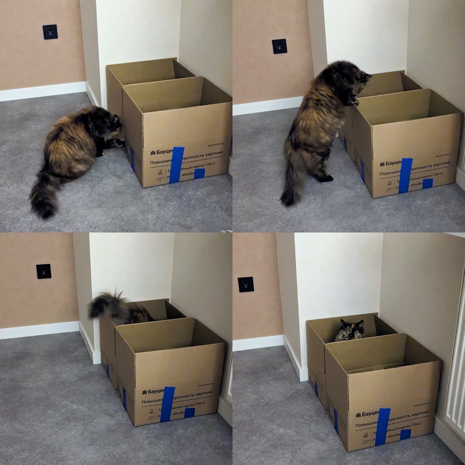 Как только мы зашли в новый дом, я поставила ее переноску в комнате, чтобы она немного привыкла, не стала её выпускать. В это время я разложила по квартире ее любые лежанки, когтеточки и игрушки — вещи с ее запахом — и включила в розетку "Феливей", успокаивающий феромон.