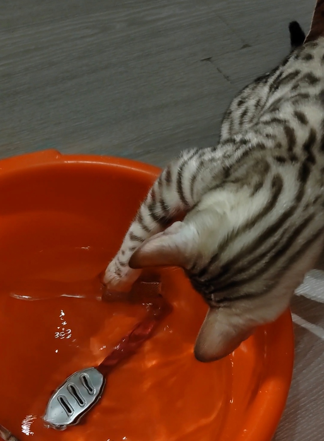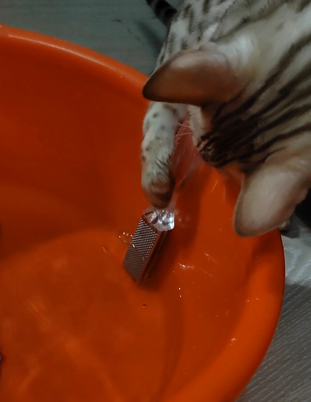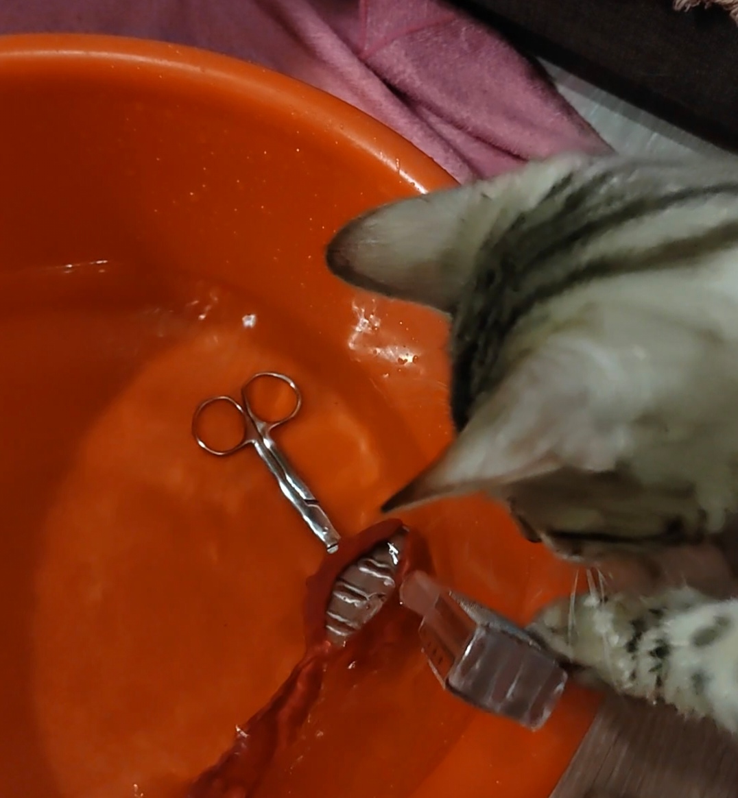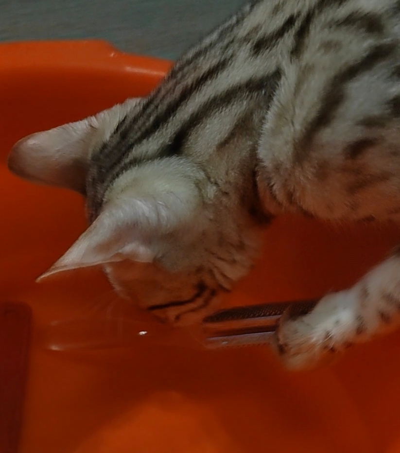 Решил себе почистить пятки. Подготовил две емкости, для ступней и тазик с водой для ополаскивания. Кэсси тут как тут! Сначала залезла в пустую ёмкость, потом в тазу начала "рыбачить", благо подбросили ей инструменты. И ведь поймала! Воды совершенно не боится!