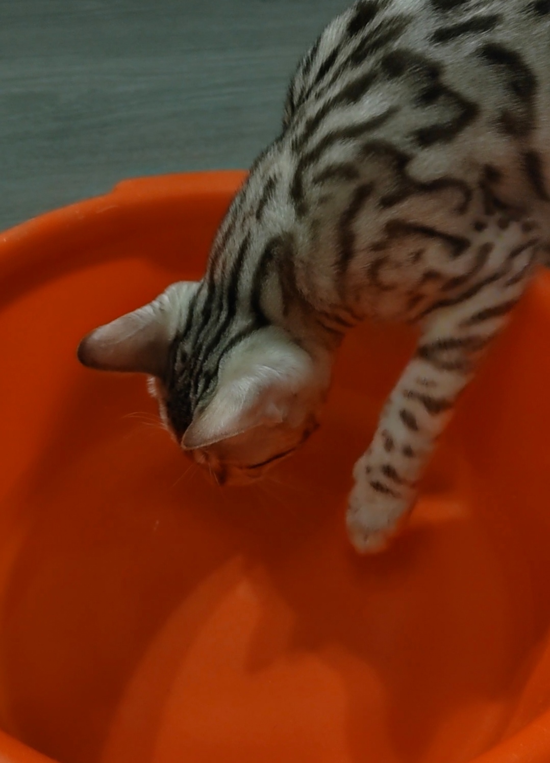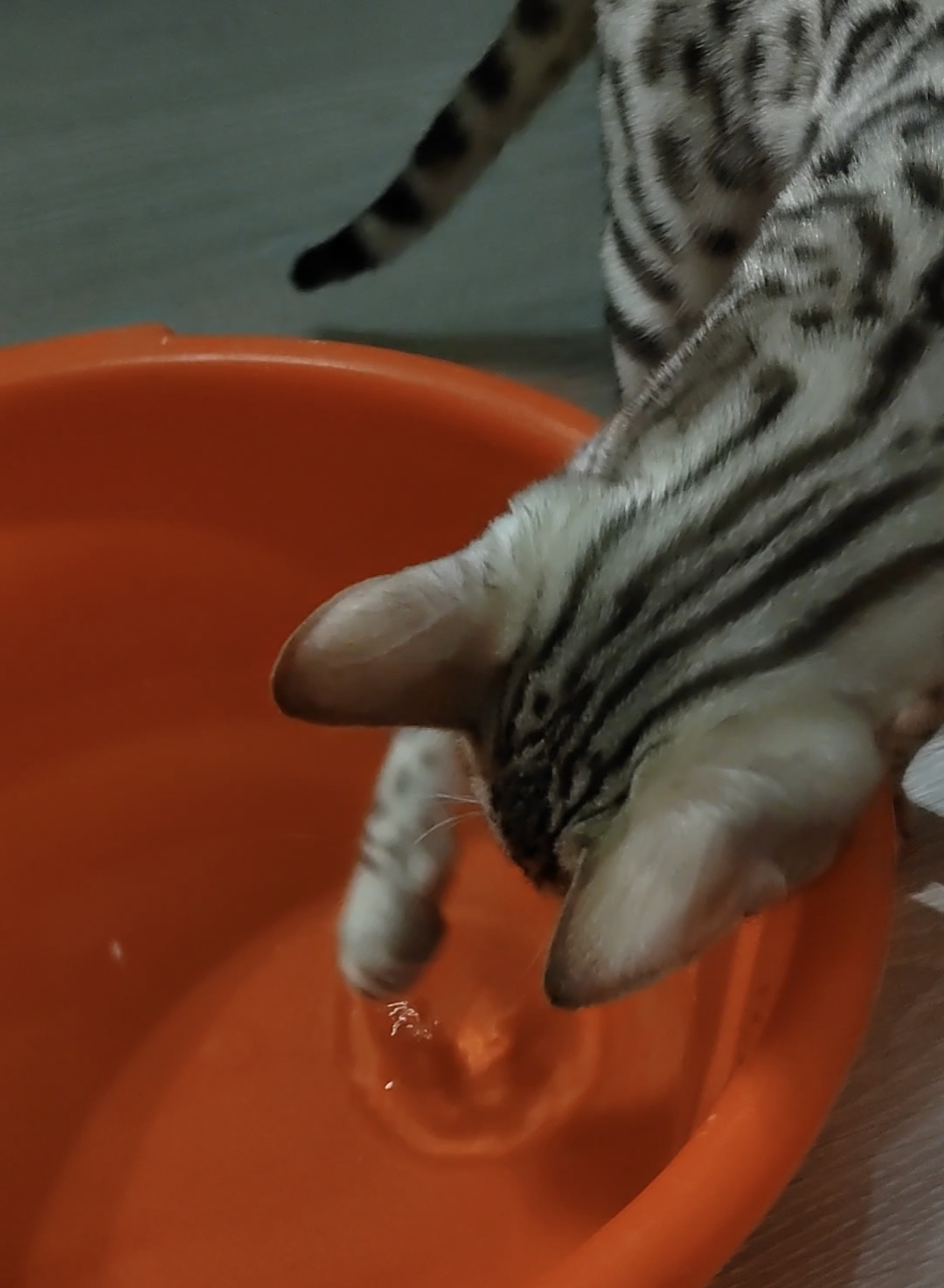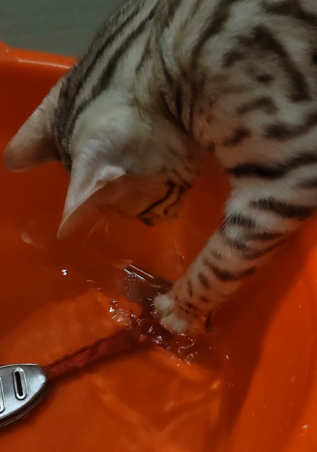 Решил себе почистить пятки. Подготовил две емкости, для ступней и тазик с водой для ополаскивания. Кэсси тут как тут! Сначала залезла в пустую ёмкость, потом в тазу начала "рыбачить", благо подбросили ей инструменты. И ведь поймала! Воды совершенно не боится!