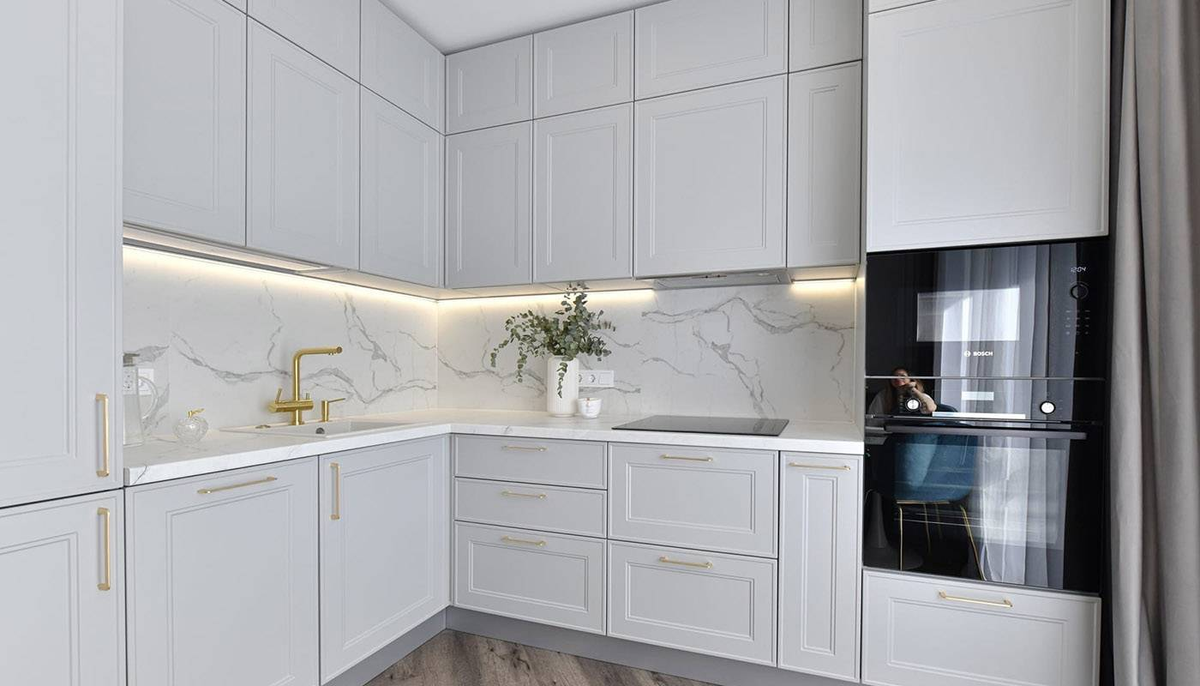 Белые матовые фасады не лучше — со временем пористая структура забивается пылью и микрочастицами жира, из-за чего кухня приобретает сероватый оттенок, который трудно отмыть.