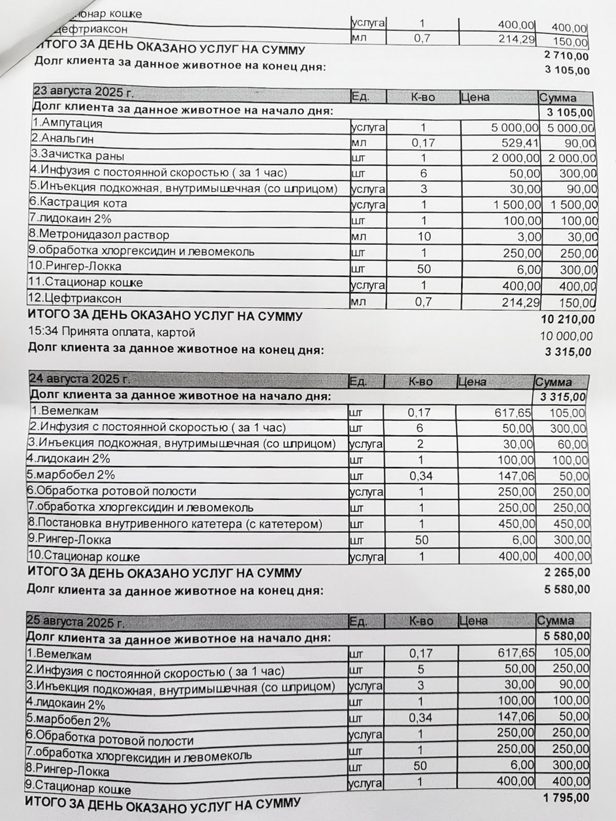 Мы не вели учет расходов — целиком сосредоточились на лечении кота. Неделя стационара в первой клинике стоила 24 000 ₽. Последующие ампутации в другой клинике и еще один стационар — 16 000 ₽. Кроме этого, покупали препараты, мази, бинты, антисептики, пеленки и оплачивали питание в ветклиниках. Сумму из первой клиники поделили на троих — помог папа. Все остальные траты делили с мамой пополам.