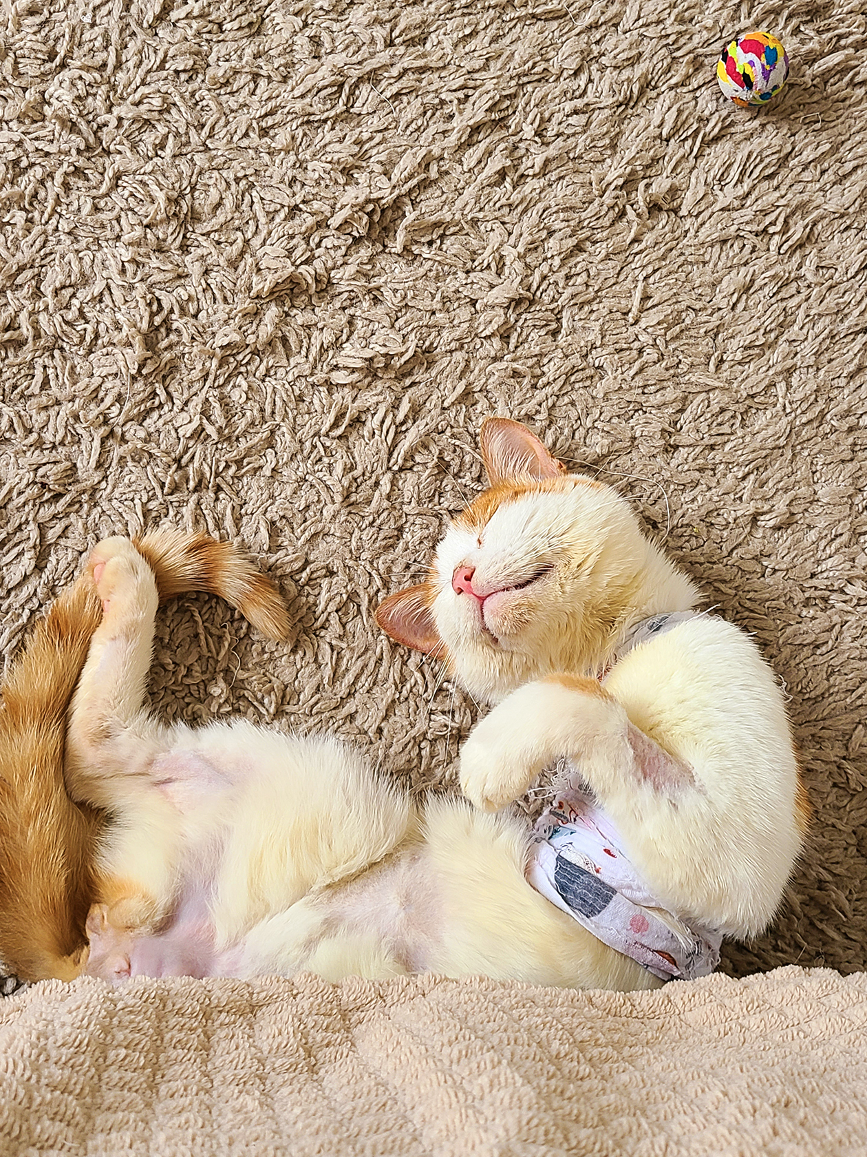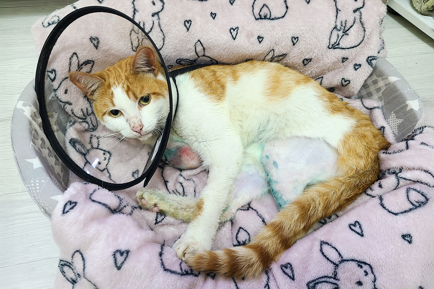 Кот провел в стационаре неделю. Ему ампутировали сломанную переднюю конечность, зашили заднюю лапу и удалили на ней пару пальчиков, сделали УЗИ внутренних органов и кастрировали. Все это время Персику вкалывали кучу антибиотиков, ставили капельницы, ухаживали за ним и кормили.