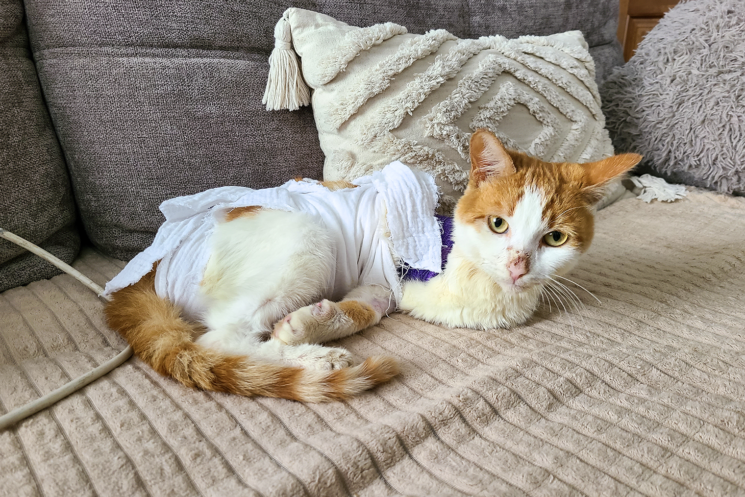 Кот хорошо перенес операцию и быстро отошел от наркоза. Мы забрали Персика домой и в течение трех недель занимались его реабилитацией. Один держал кота и помогал с повязками, а другой накладывал мазь, перевязывал и забинтовывал. Уколы антибиотиков и обезболивающего я делала Персику сама, так как мама немного боялась.