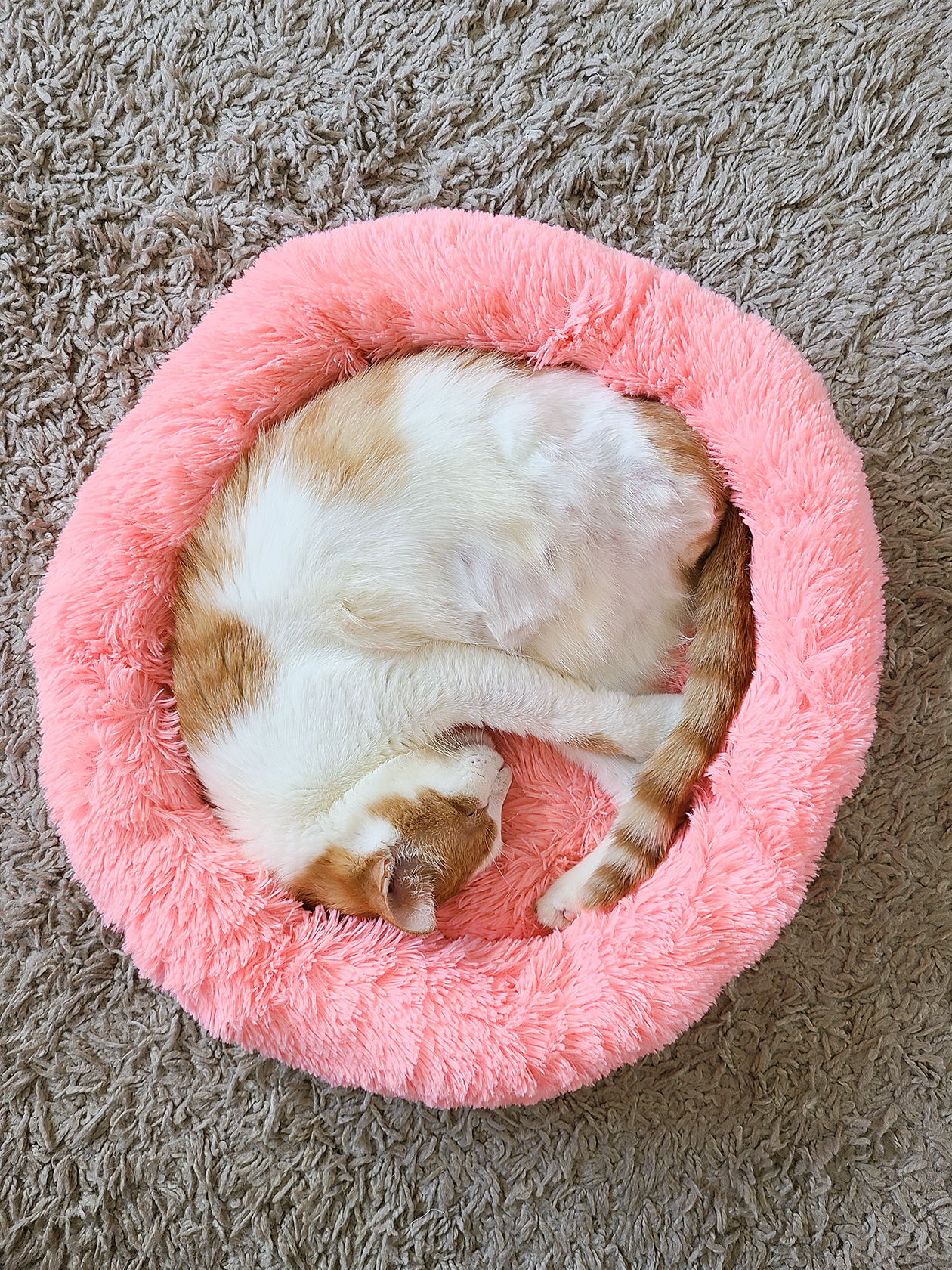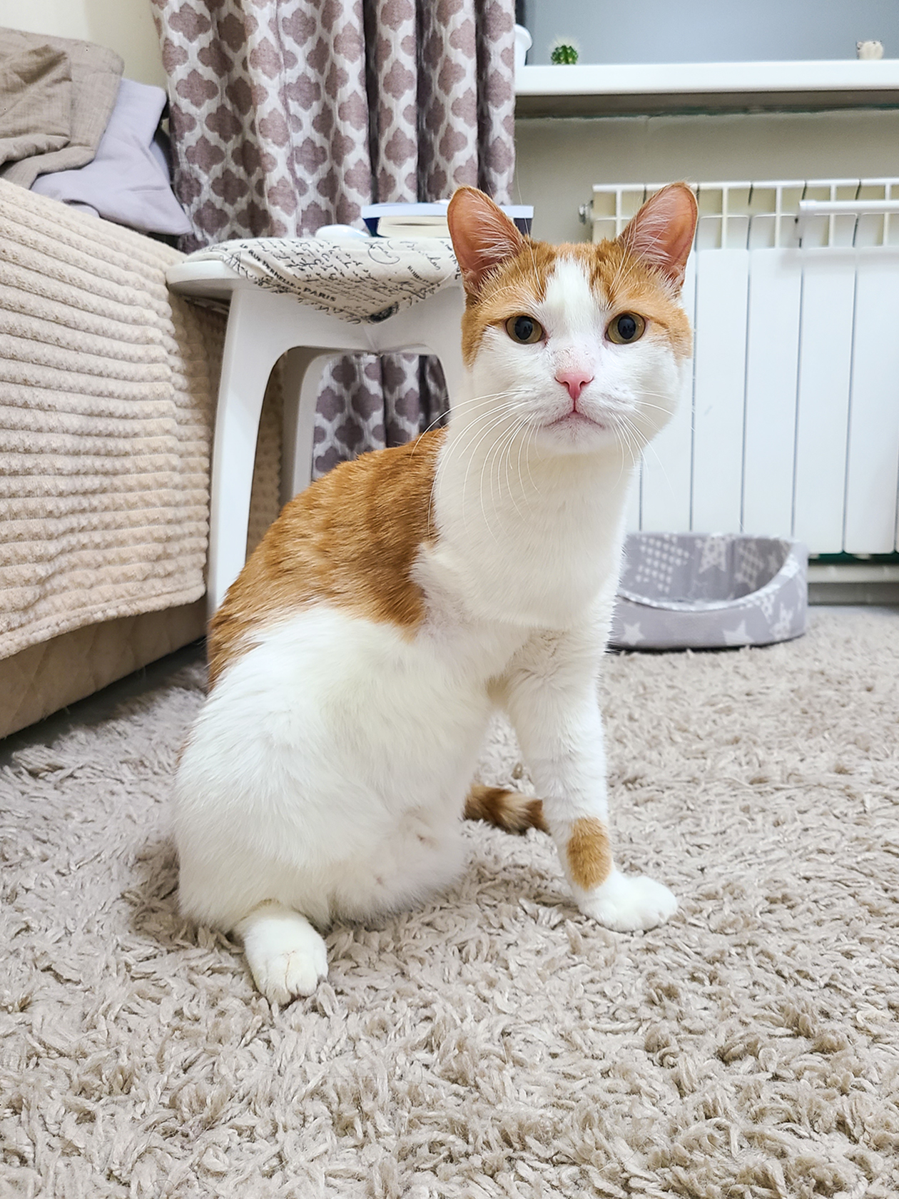 По Персику заметно, что он не привык к человеческому вниманию. Он не из котов, которые сами идут полежать на коленях или потереться об ноги. Персик абсолютно самодостаточен и предпочитает уединенное времяпровождение: часто отдыхает в своей лежанке в отдельной комнате у батареи или на коврике в ванной.