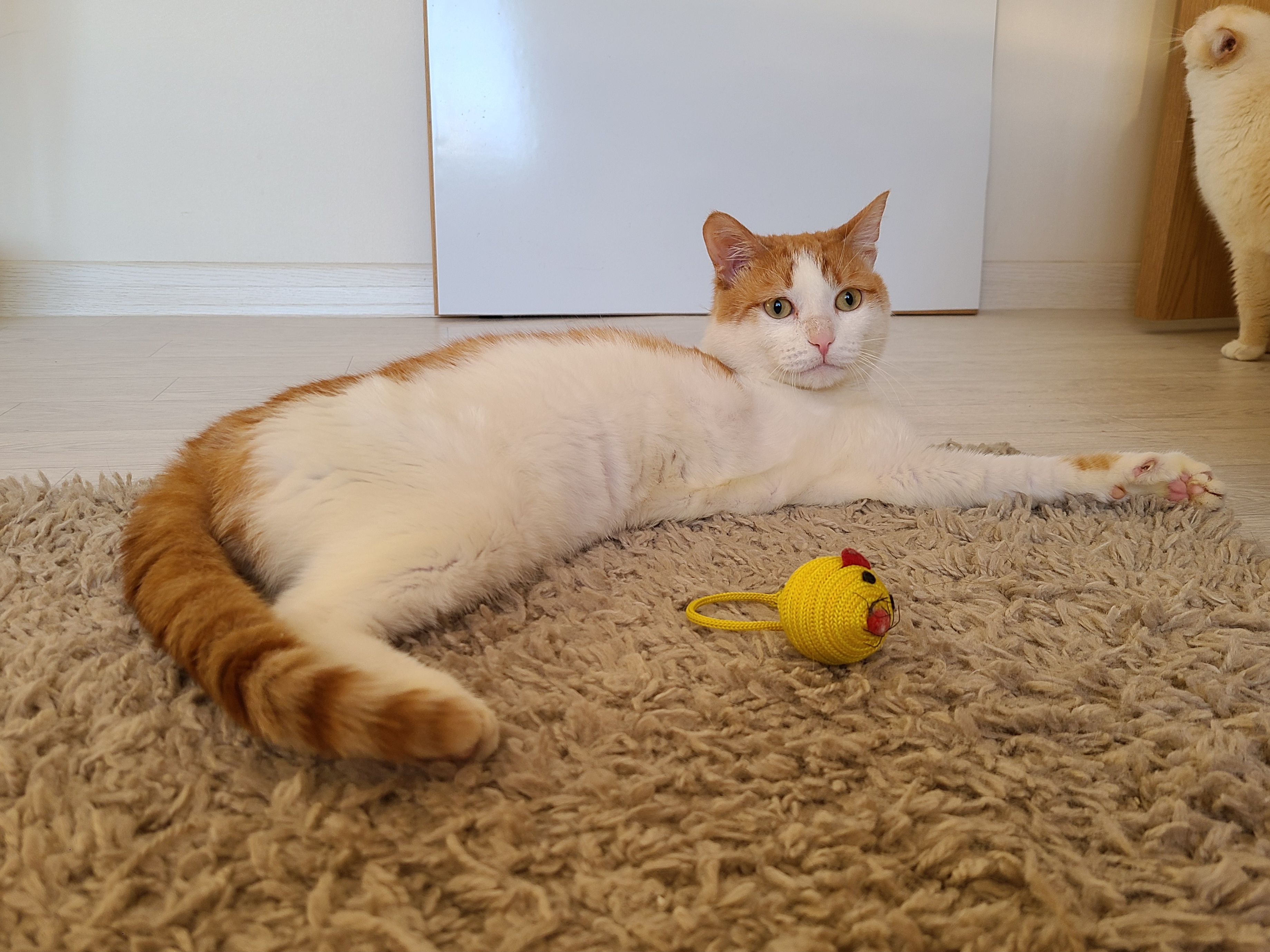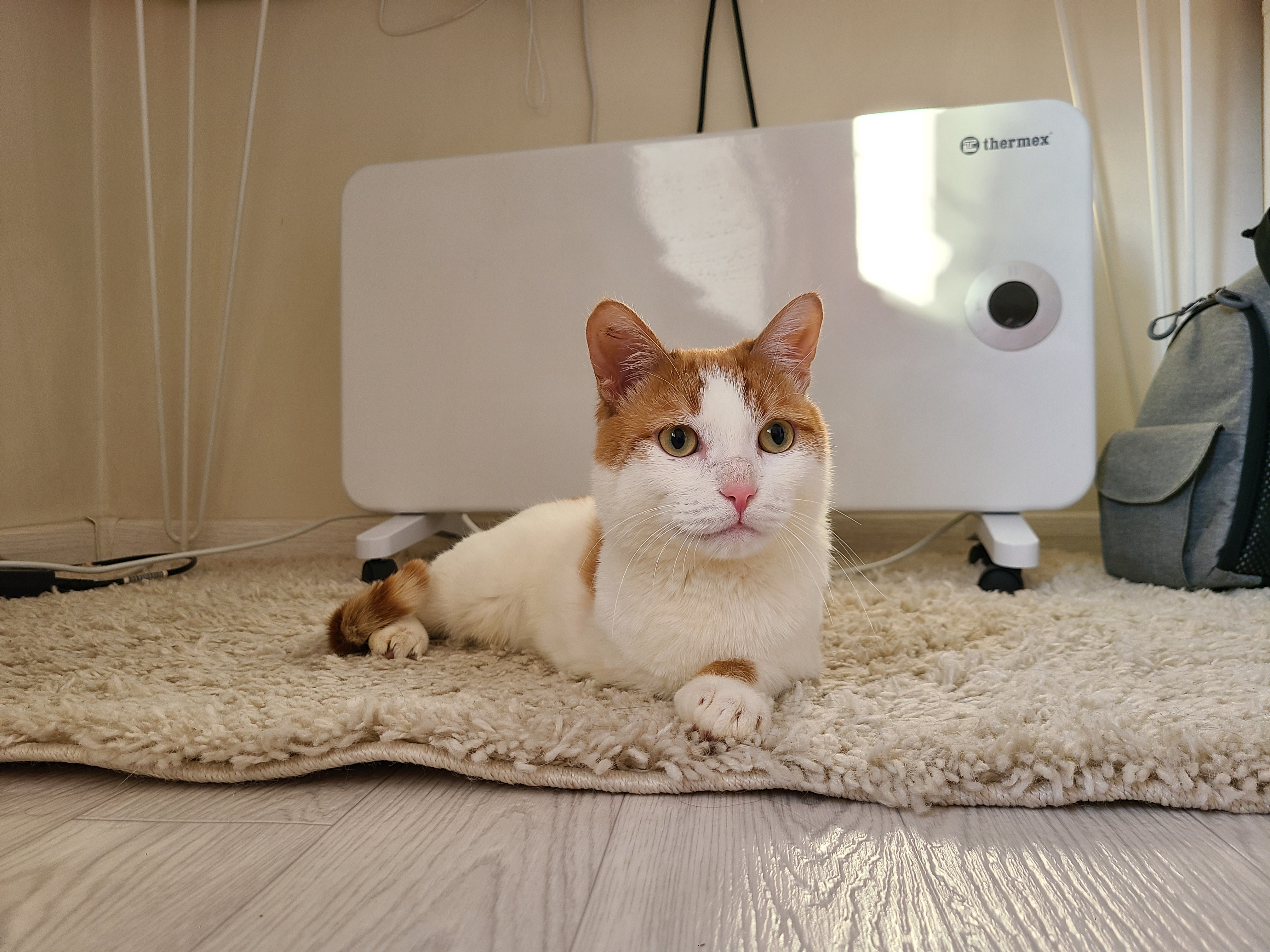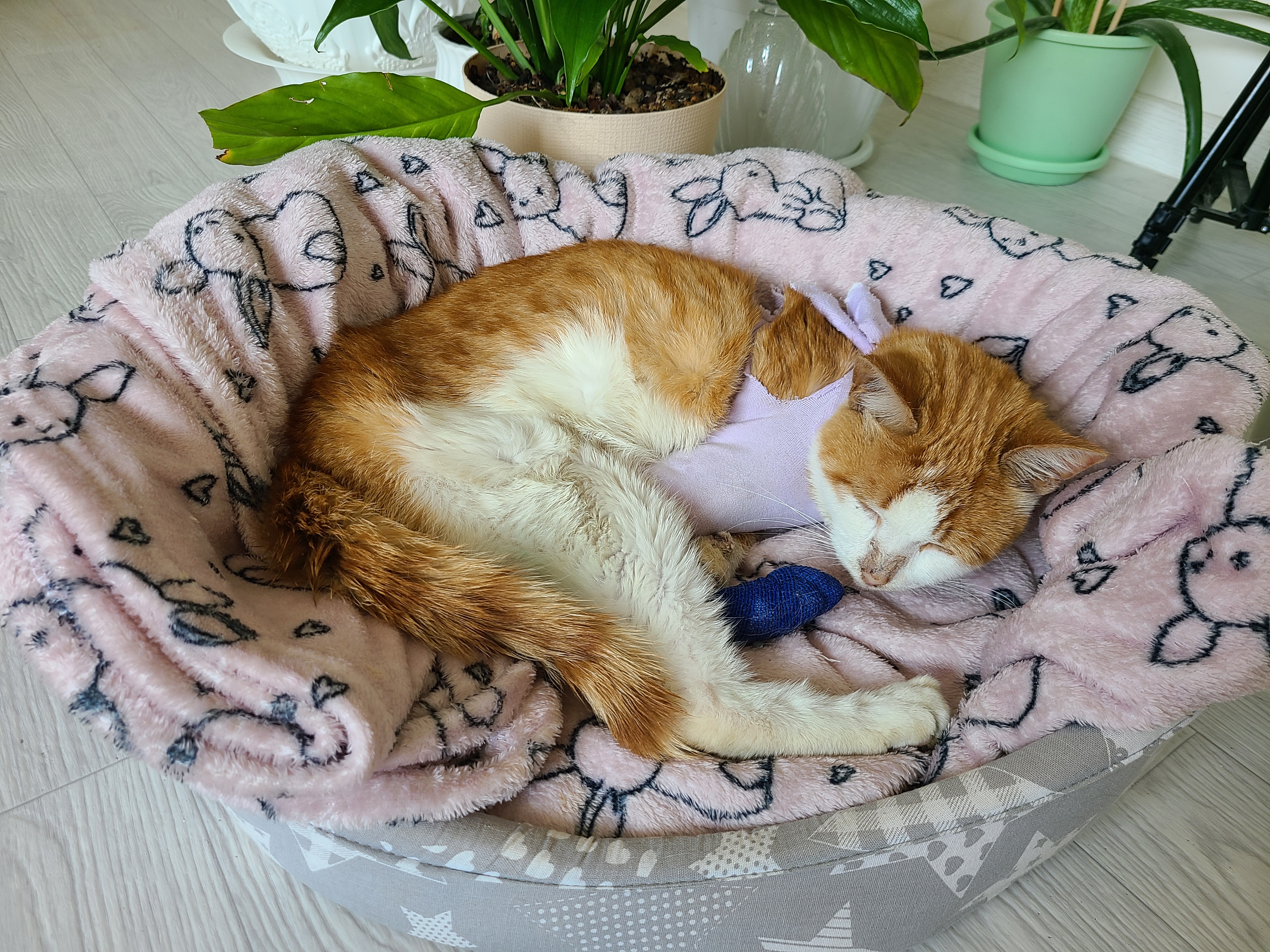 Сейчас Персик живет у меня в квартире, помимо него у меня есть еще кот и кошка, которые вполне мирно к нему относятся и даже спят рядом.
