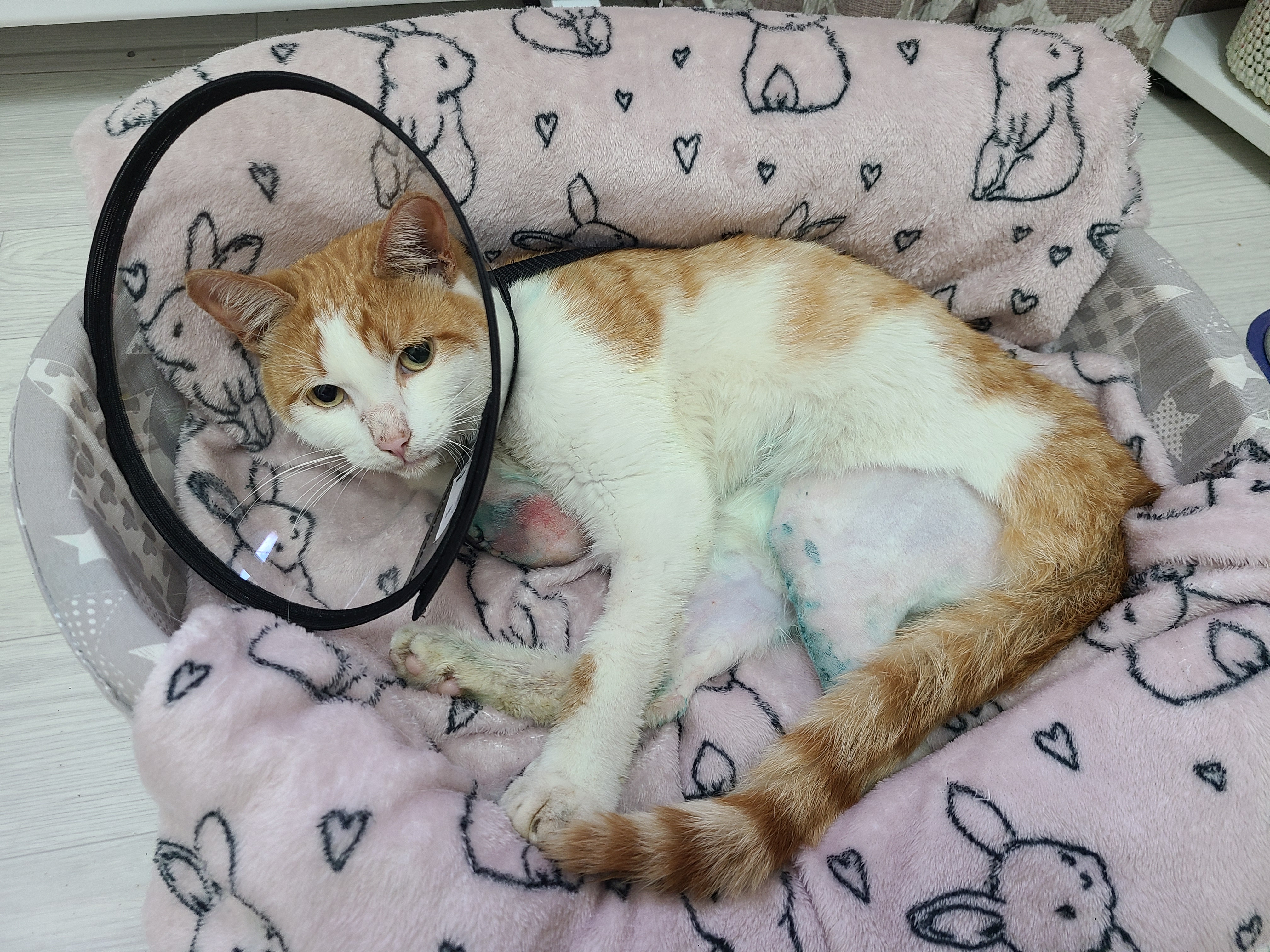 В итоге клиника оказалась со стационаром, так что кот неделю провел там. За неделю ему удалили сломанную лапу, также удалили пару пальчиков на задней лапе и зашили ее (она оказалась наполовину разодранной и кишела опарышами), пасть кота была также полна опарышей и крови, сделали узи внутренних органов (все оказалось в порядке), кастрировали кота и вкалывали кучу антибиотиков, ставили капельницы, ухаживали и кормили.