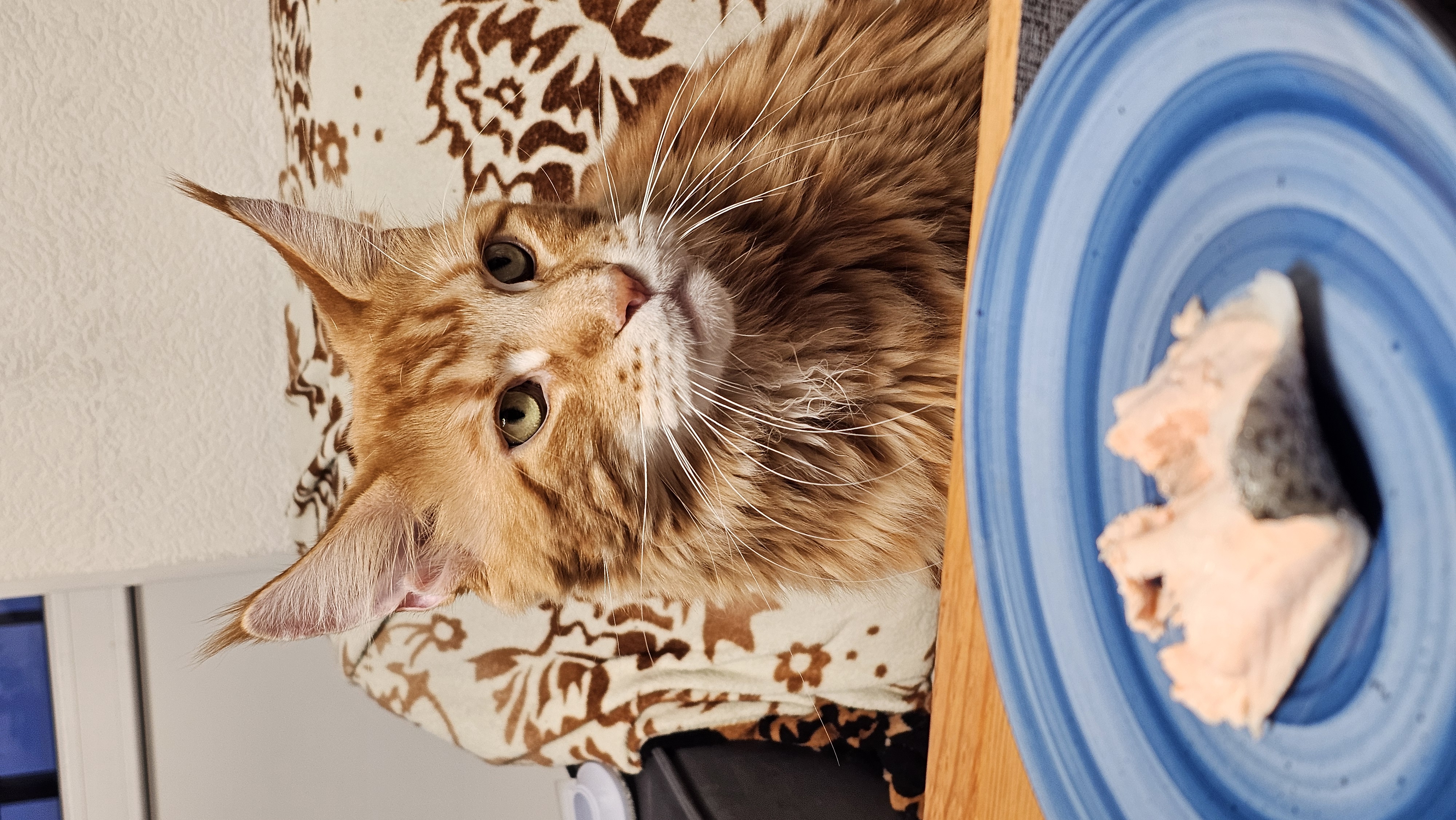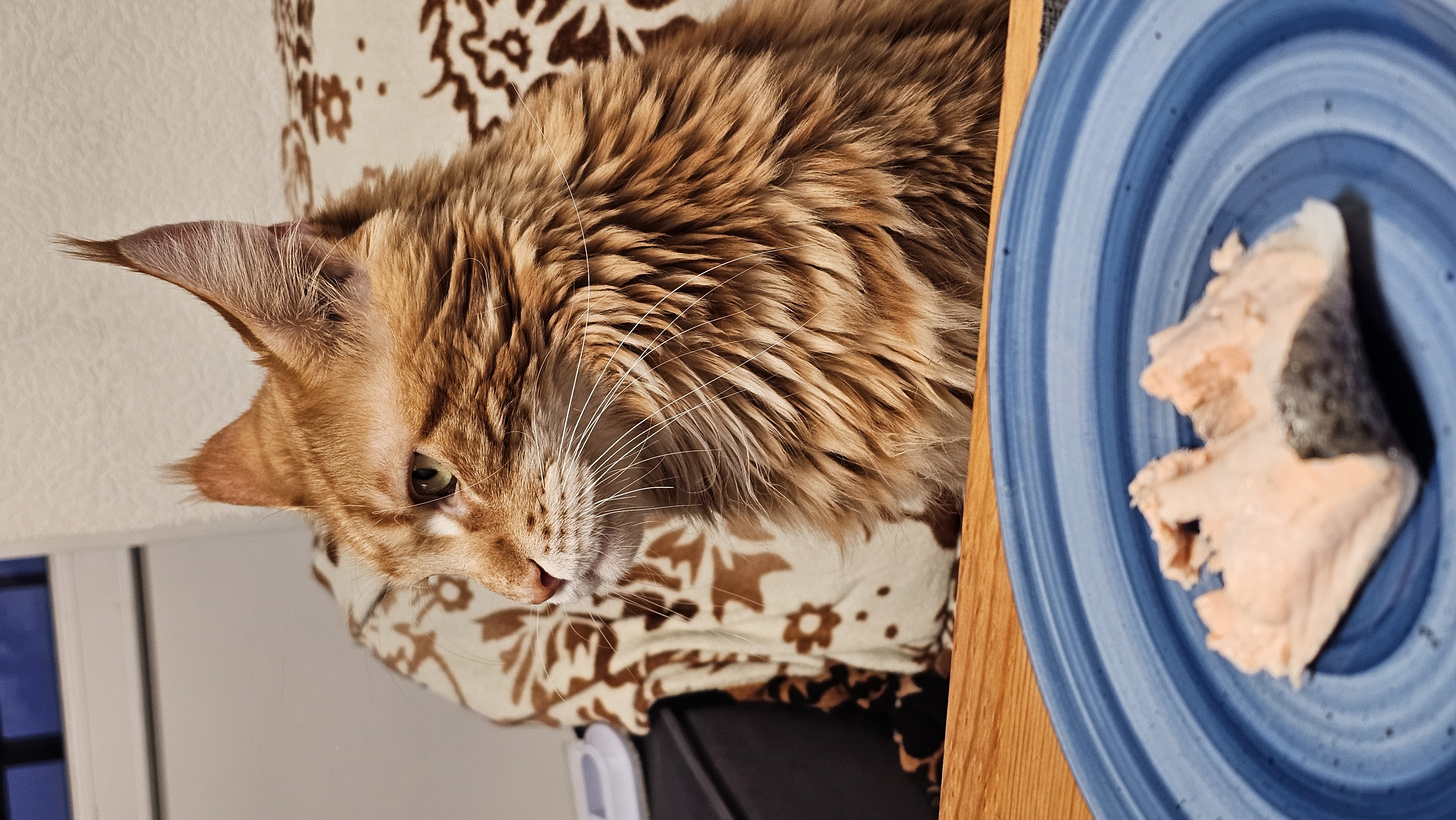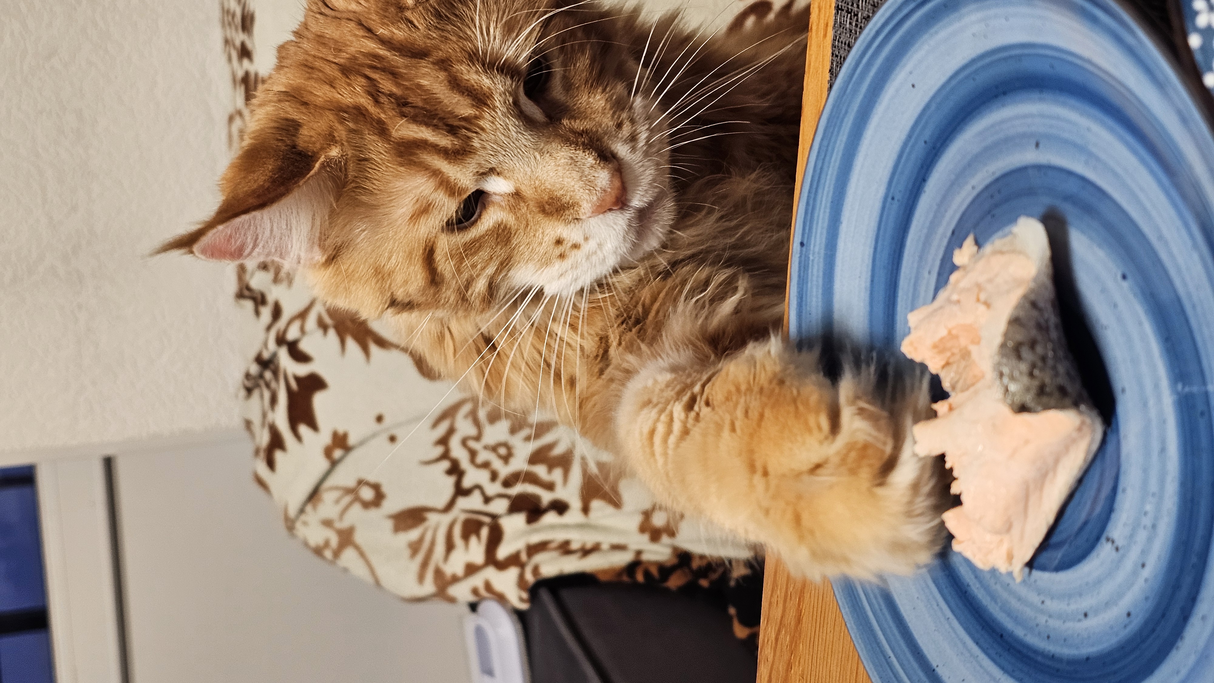Вообще кота зовут Iridium, Риди это сокращенное имя. Перед ужином он обязательно садится на диван или на стул и осматривает еду, особо приглянувшуюся он может украсть. В этот раз красная рыбка не давала ему покоя. Может показаться что он вечно голодный, но у него всегда полная миска его корма + обязательно каждый вечер вкусняшка.