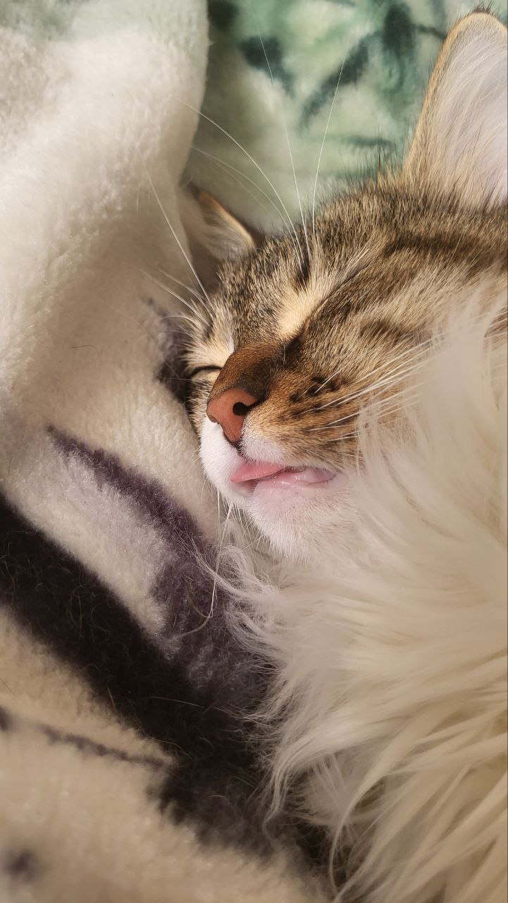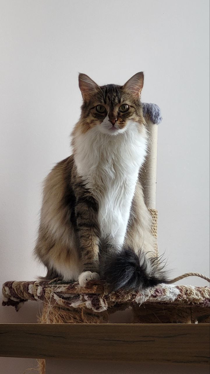 Сёма — абсолютно необычный кот. Каждый, кто с ним знакомится, говорит одно и то же: «Я никогда таких котов не встречал». Он невероятно общительный и постоянно разговаривает. Не просто мяукает — а именно общается. Если вы видели видео, как мейн-куны «болтают» с людьми, — это один в один про Сёму. Не зря наш ветеринар сказал, что он, скорее всего, полумейн-кун.