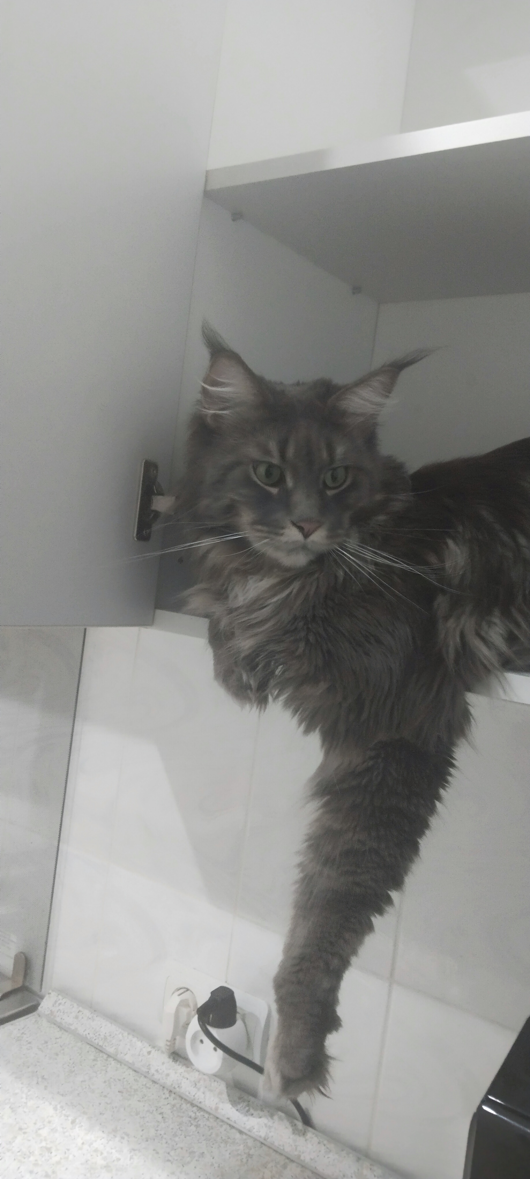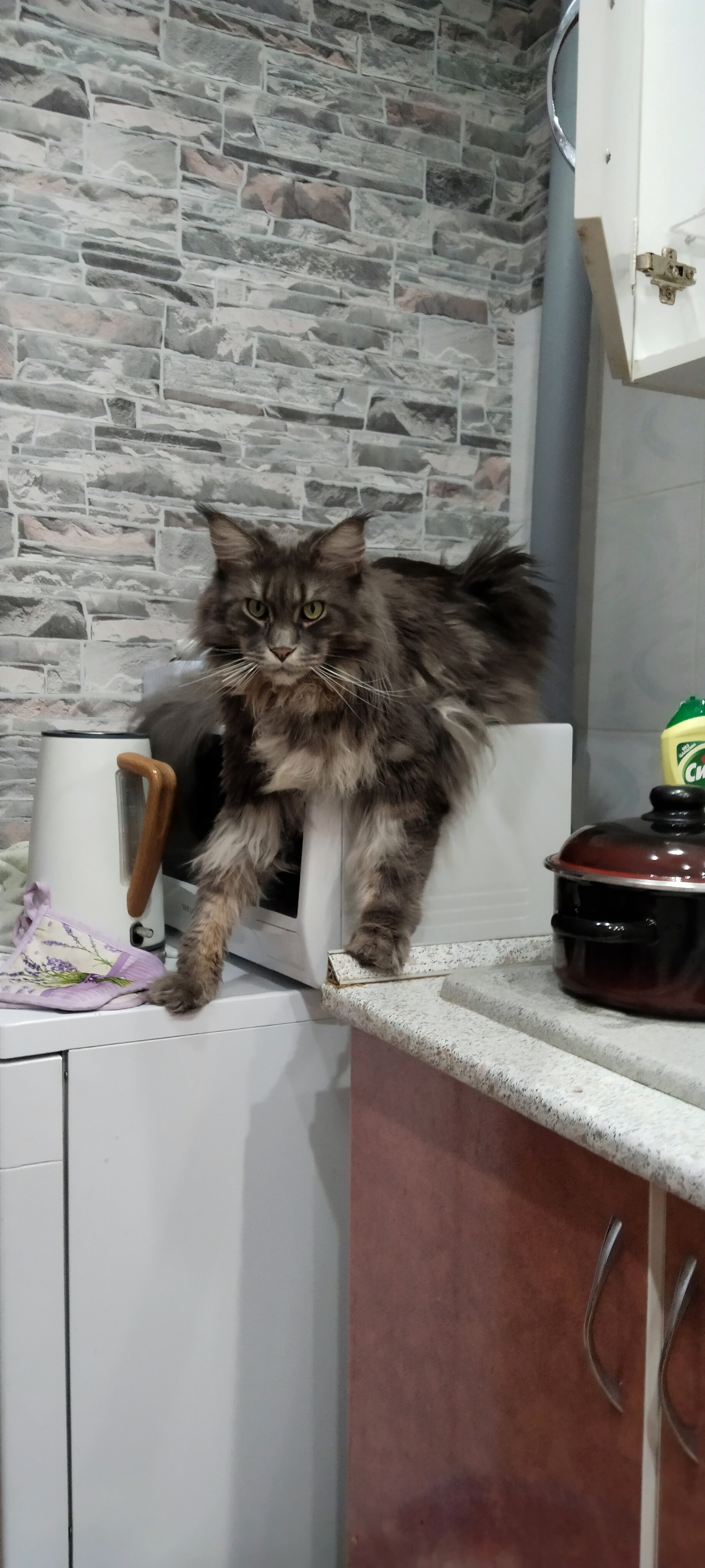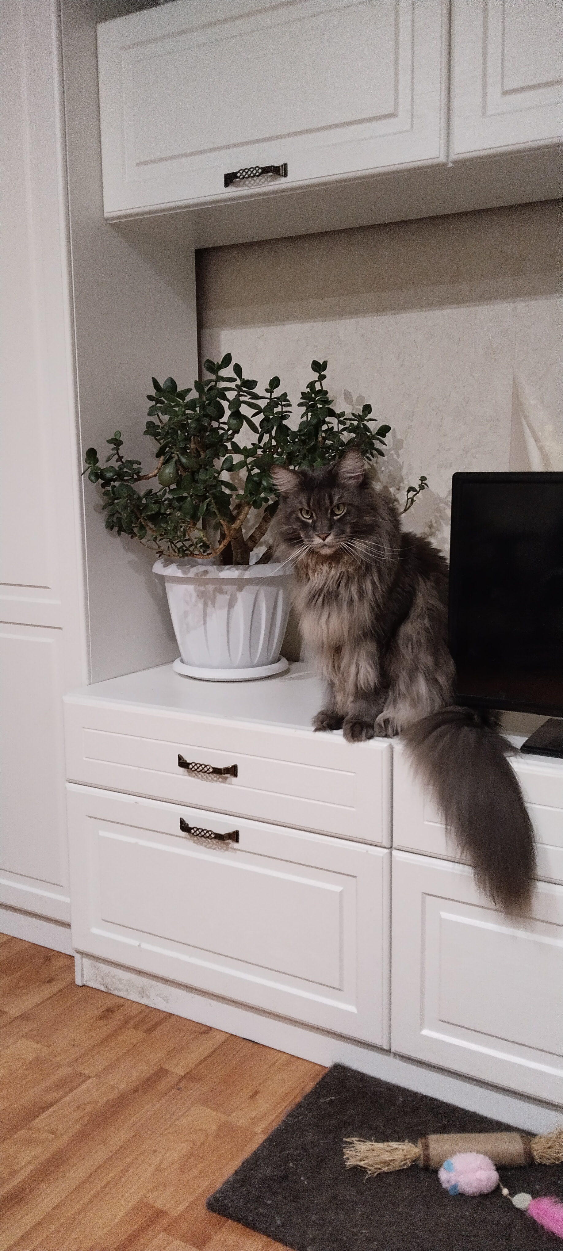 Это мой не первый котик, до Василия был Степан порода дворовая прожил 22 года, год я не хотела заводить животное, а потом как то в доме не хватает морды которую можно погладить, посмотреть как шалит, посоветовалась с сыном и решили взять не дворовую кошку, а выбрать понравившегося. Выбор пал на котенка 4 месяца, долго выбирали кличку, наверное пол года, сына забрали в армию и вот тогда я дала ему имя Василий. У кого есть коты породы Мейн Кун знают их плюсы и минусы, самый большой минус это шерсть, если не вычёсывать, то можно ходить в натуральных шерстяных вещах, у меня дома робот пылесос он хорошо справляется с чисткой пола. Плюсы он ласковый, ходит по пятам, идёшь купаться мяукает под дверью, приходишь с работы встречает тебя с мышью которая лежит в твоём тапочке. Василию наверное был год когда я пришла с ночной смены, встречает меня и хромает на одну ногу, я быстро телефон на зарядку, давай искать вет клиники, телефон зарядил а немного вызвала такси и поехала к ветеринару, мало ли вдруг ногу сломал, его посмотрели сделали УЗИ, сказали что это ушиб, заплатила я тогда 3500 руб. Для меня был шок, что осмотр стоит так дорого. Много можно писать о своем питомце, думаю, что этого достаточно.