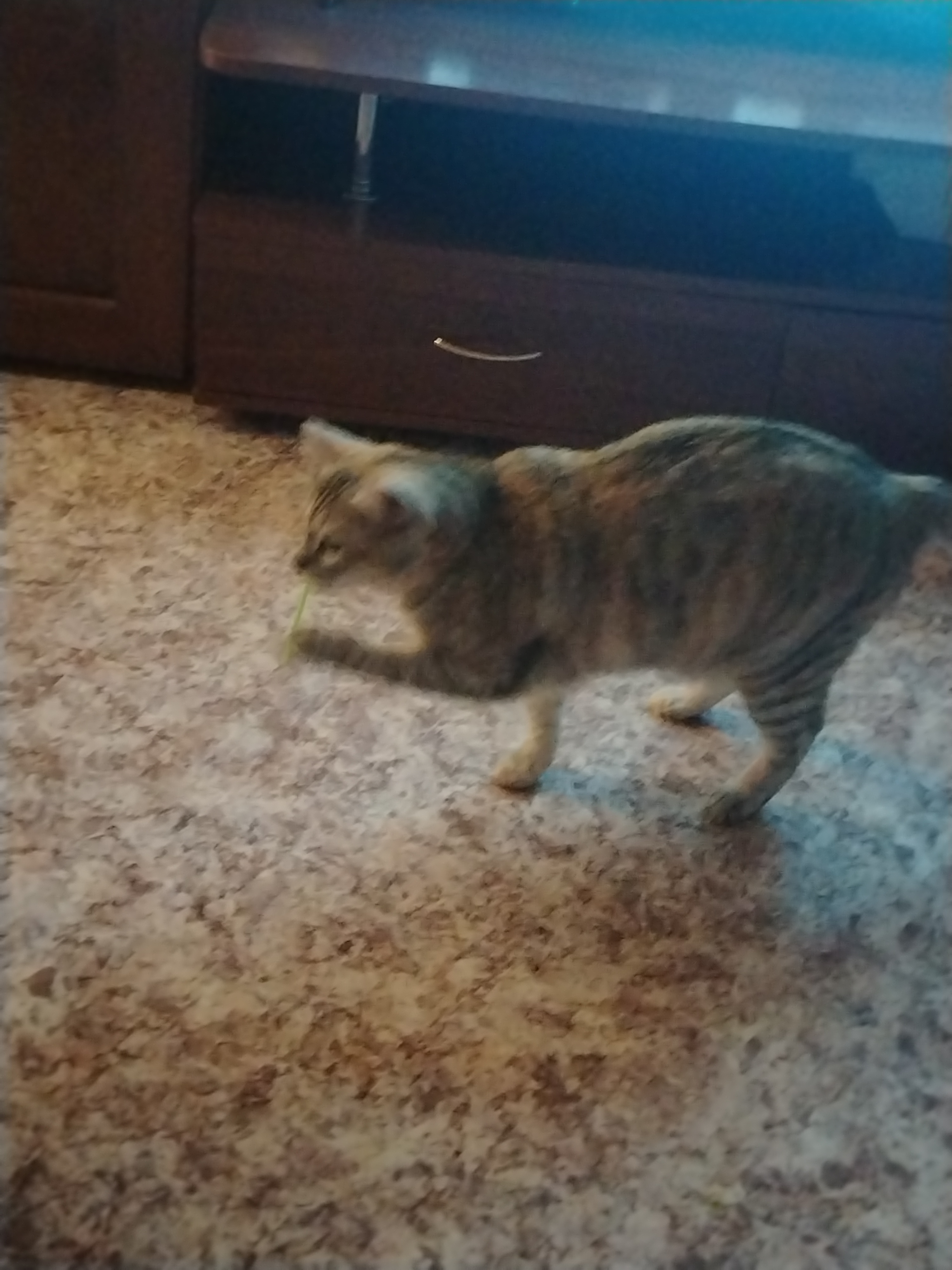 Мария приша к соседке за котёнком. На тот момент осталось три котёнка трехмесячного возраста. Один рыжий котёнок был очень шустрый и пополз к ней. Но Маша взяла серого котенка, который никак не реагировал на неё, но был очень симпатичным. Она думала, что это был котик, но она ошиблась.