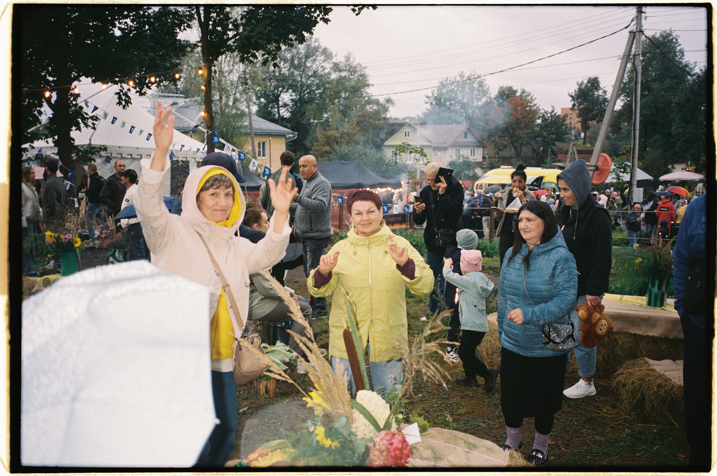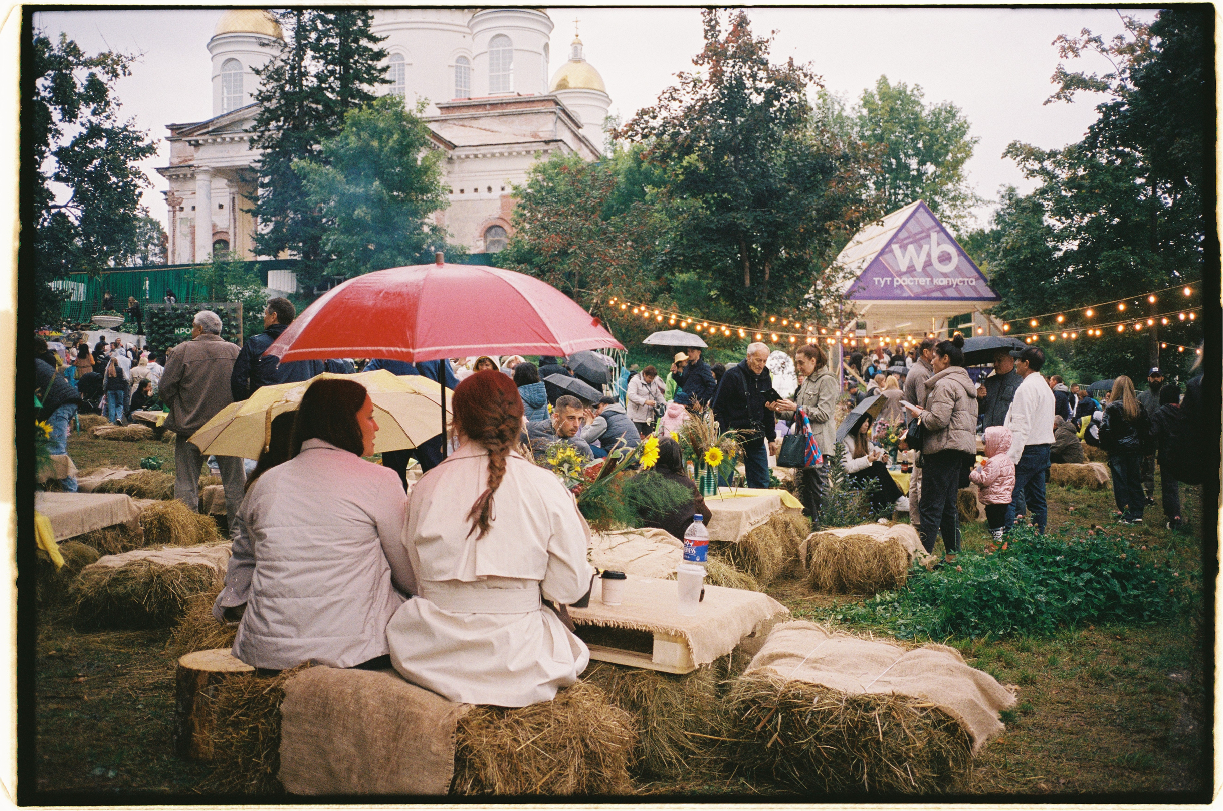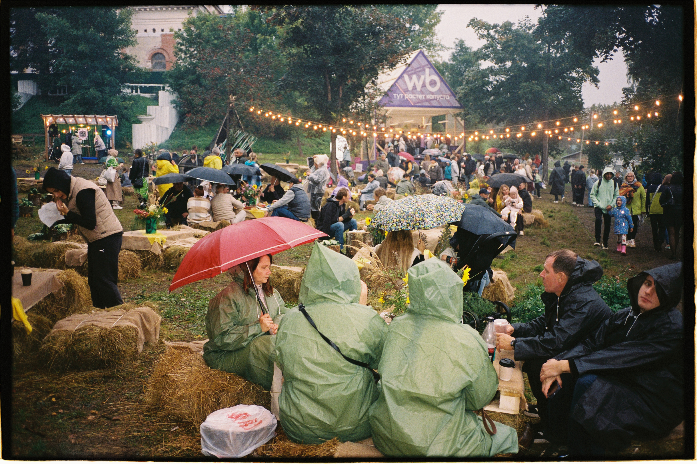 🥬 Посетителей не испугала непогода. В середине дня в городе начало моросить. Но люди не покидали праздник — они кутались в дождевики и продолжали пикниковать, расположившись на промокших тюках сена.
