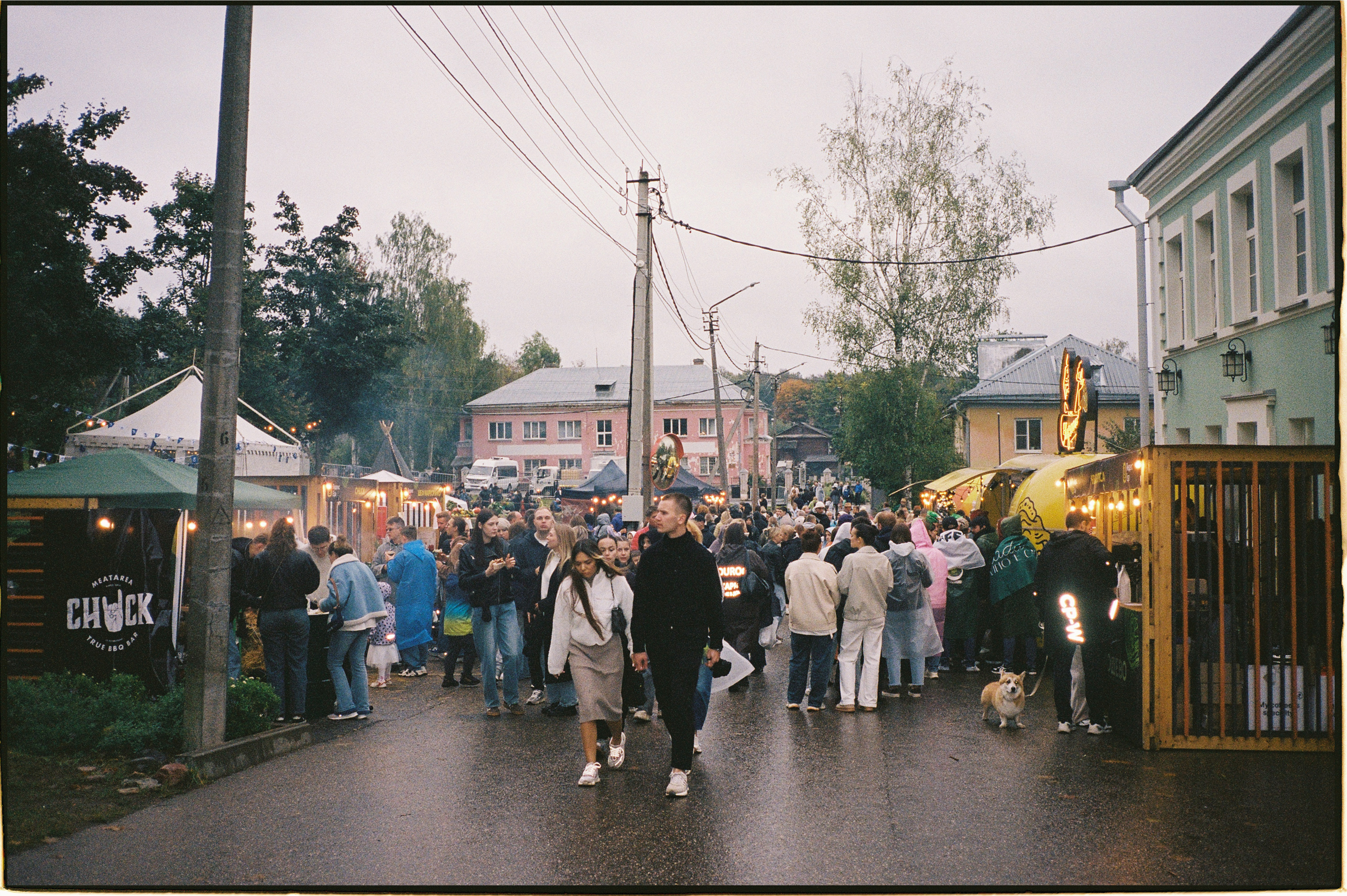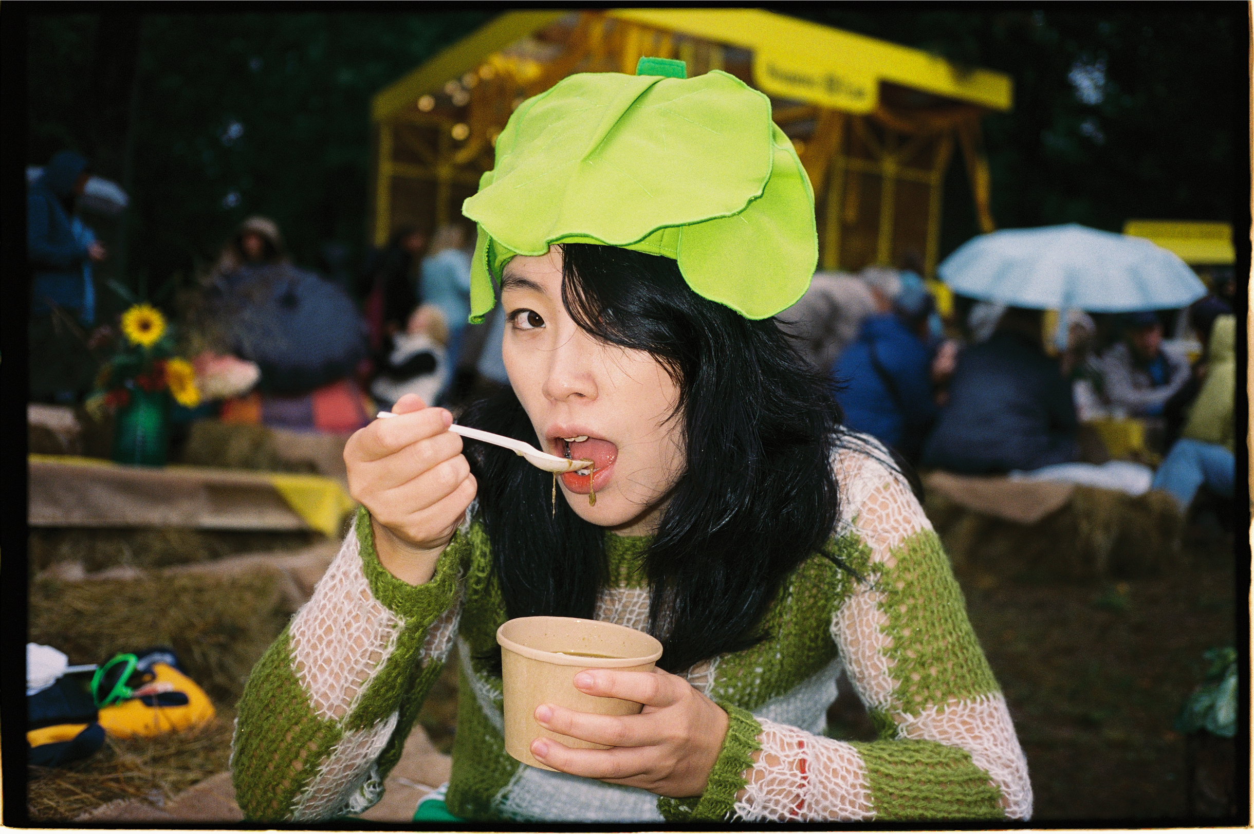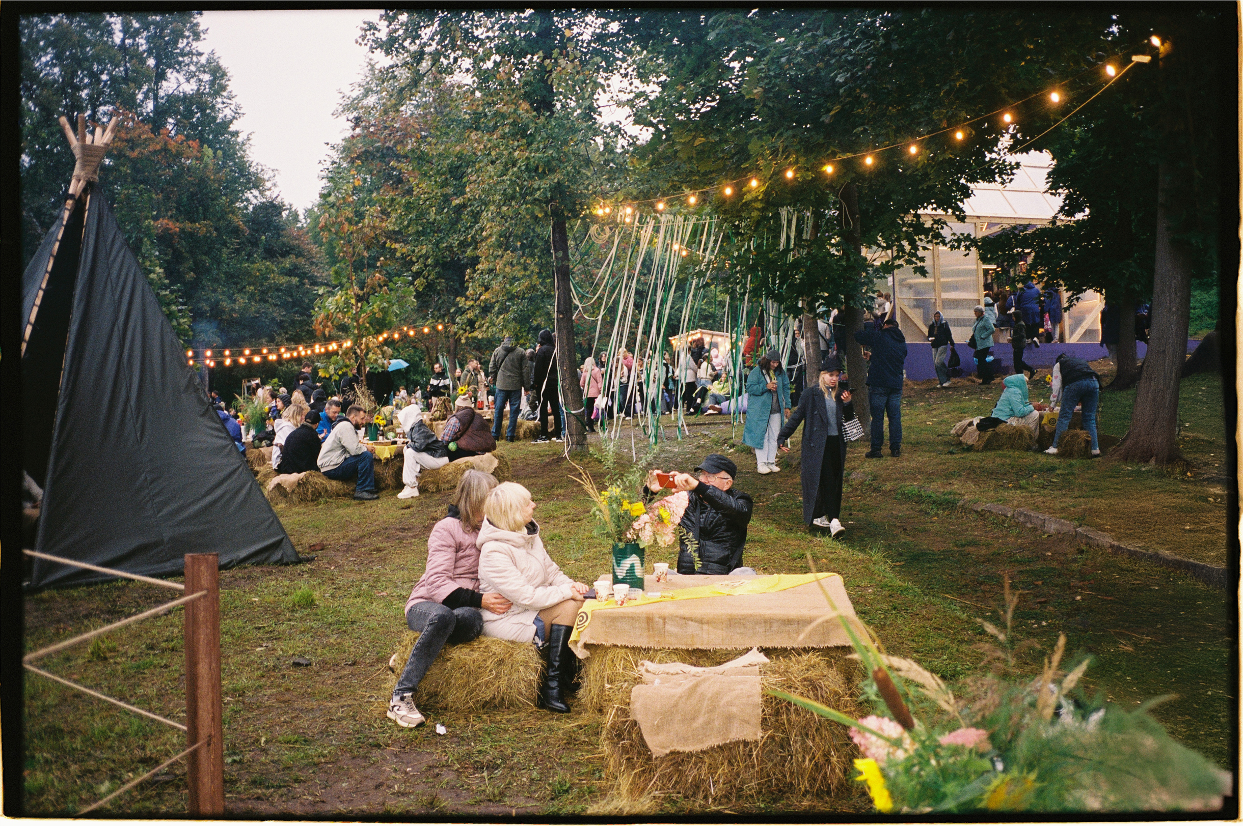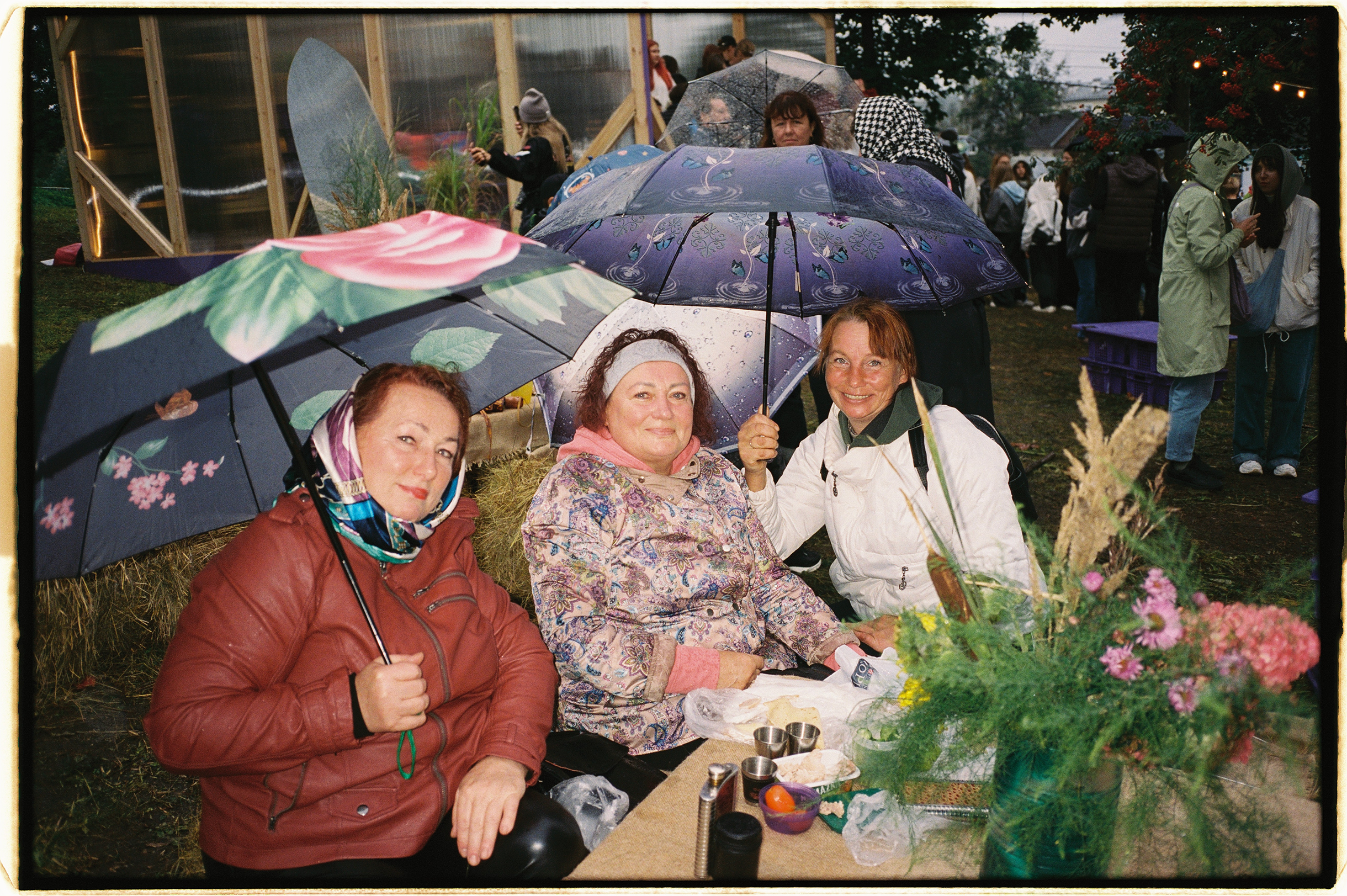 🥬 Посетителей не испугала непогода. В середине дня в городе начало моросить. Но люди не покидали праздник — они кутались в дождевики и продолжали пикниковать, расположившись на промокших тюках сена.