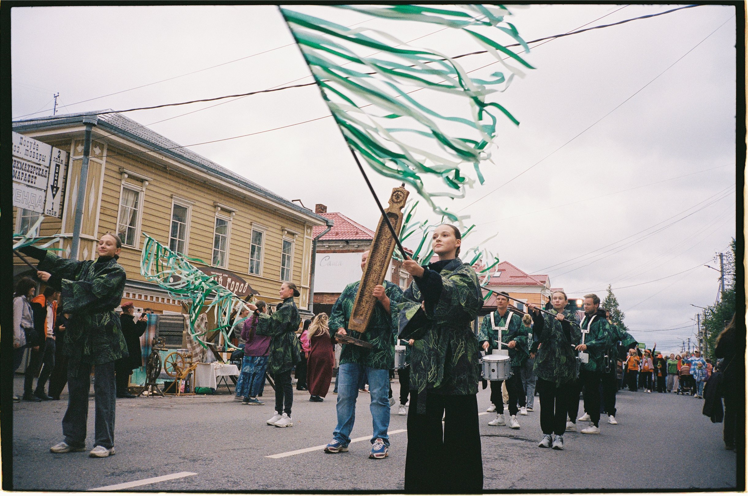 🥬 Праздник начался с парада «крошефов». Так называют участников соревнований по рубке капусты. Для команд не было дресс-кода, но многие дали волю фантазии. Одни облачились в костюмы как с детского утренника, другие выбрали стиль «коттеджкор». Жители Боровичей тоже принарядились: на улицах были замечены пожилые мужчины в цилиндрах, дети в образе Шрека и человек с плюшевой индейкой на голове.