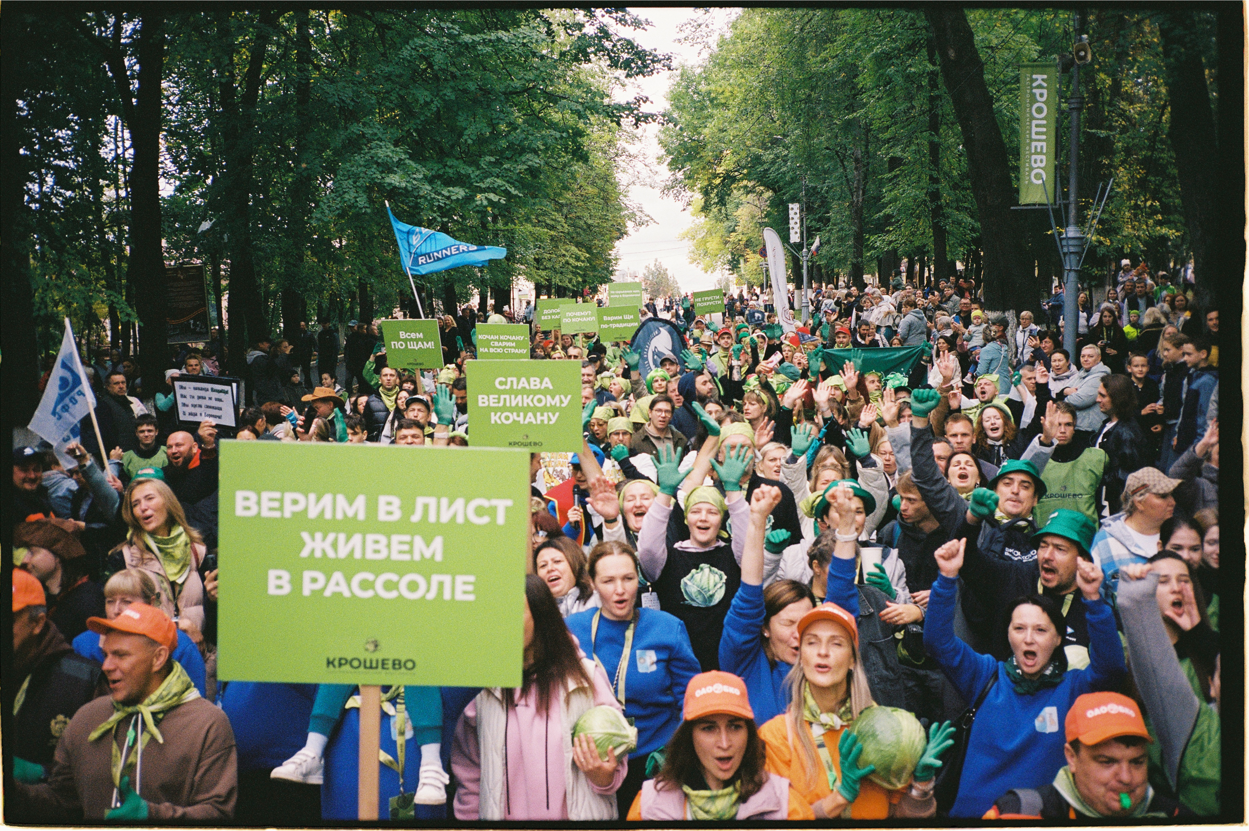 Перед колонной участников двигались трактор с прицепом, барабанщики в кимоно и девушки с транспарантами. На каждой табличке — своя капустная аффирмация: «Слава великому кочану», «Долой супы без капусты» и «Верим в лист, живем в рассоле».