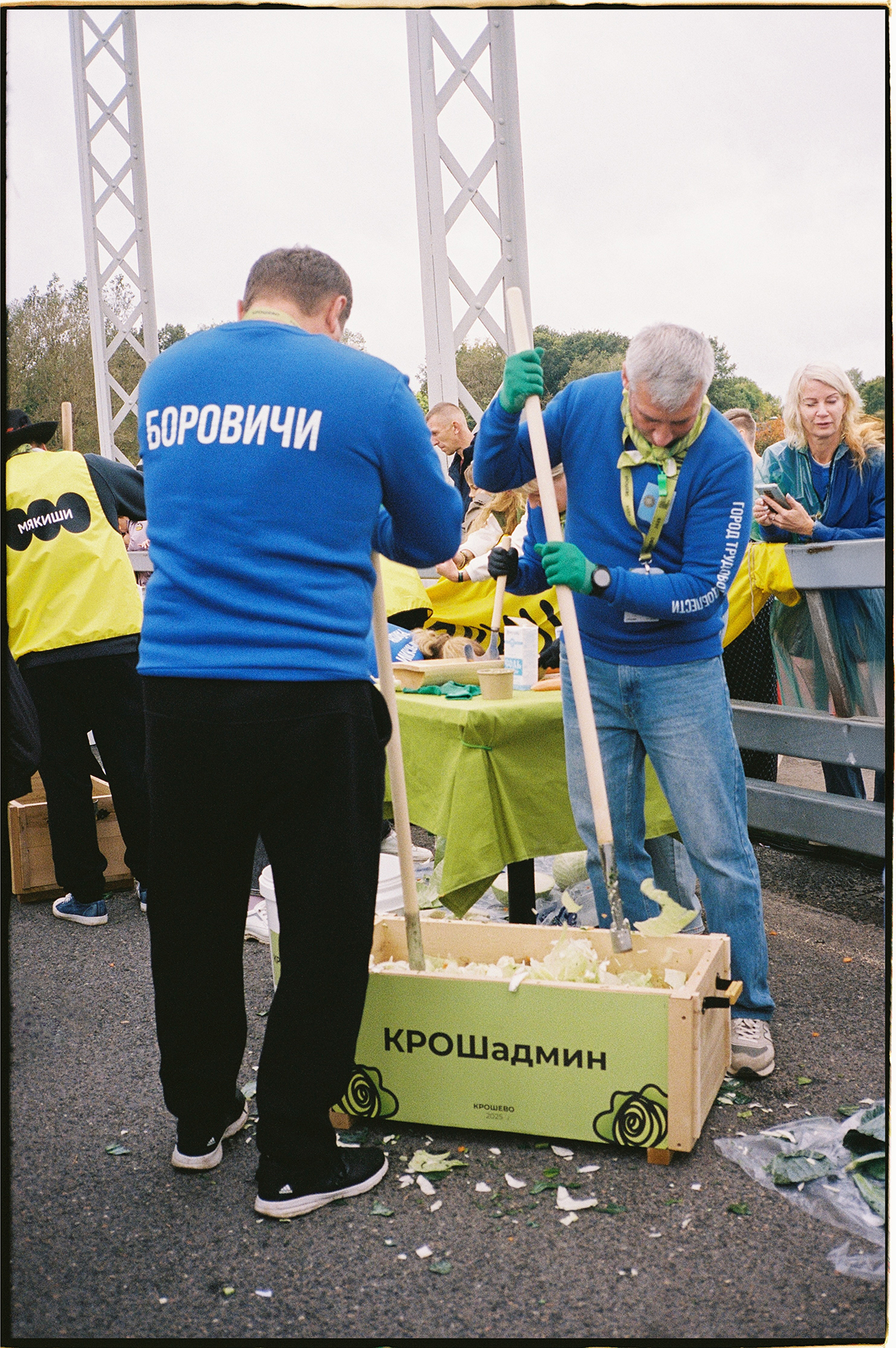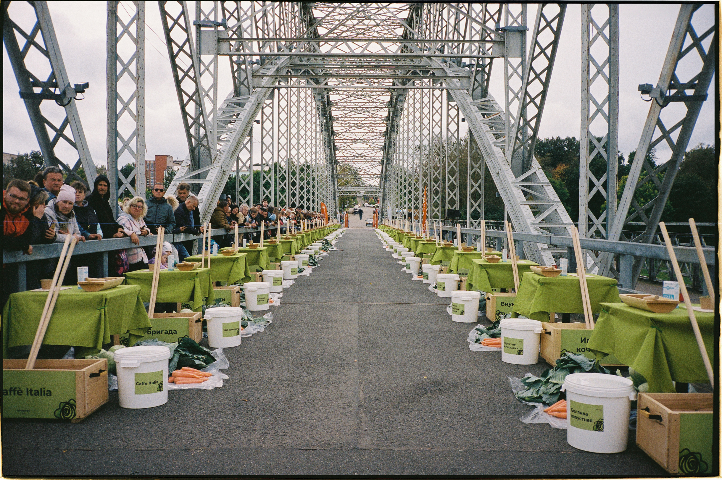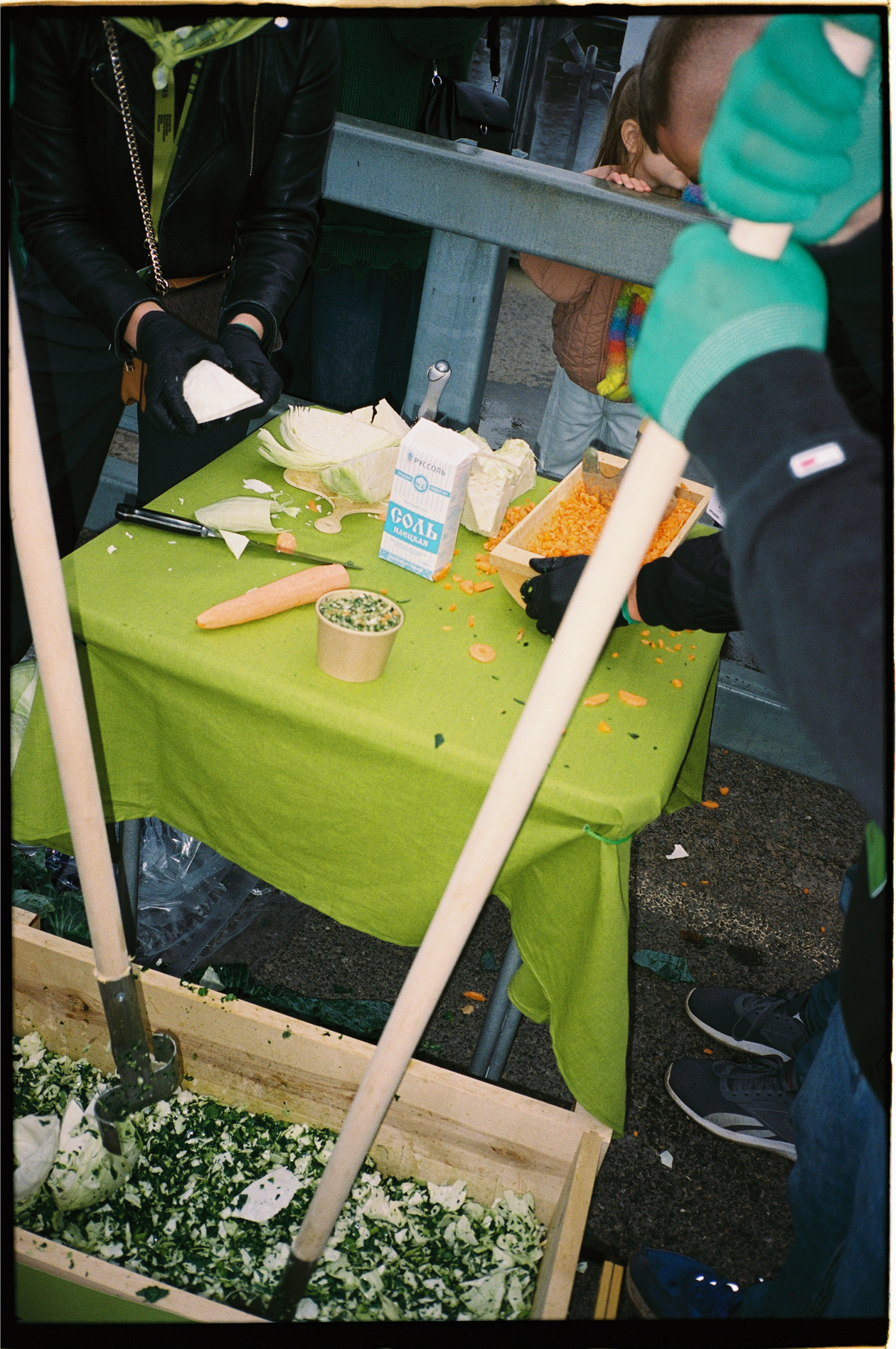 Почти две сотни людей, яростно орудующих огромными ножами и сечками, со стороны выглядели устрашающе. Но на мосту чувствовался здоровый соревновательный дух, а летящие со всех сторон ошметки капусты и моркови напоминали радужное конфетти. Особенно умилили бабушки-зрительницы, которые подсказывали участникам, как лучше измельчать капусту.