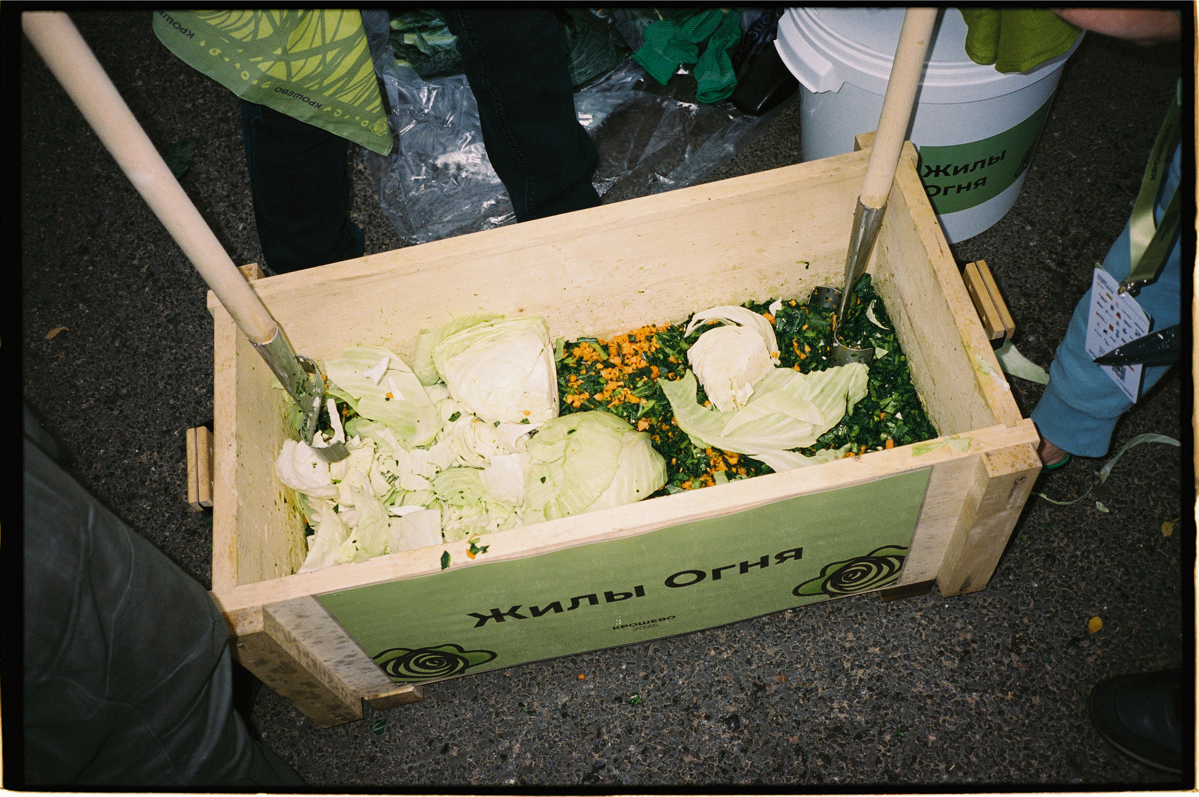 🥬 Главное событие праздника — капустная заруба. В этом году на соревнование заявилось 45 команд по четыре человека. Все участники разместились на мосту Белелюбского, который полностью перекрыли на время фестиваля. Цель команд — изрубить верхние капустные листья, целые кочаны и морковь быстрее и качественнее соперников. Делают это в деревянном корыте при помощи сечек — металлических инструментов с длинными деревянными ручками. Жюри оценивало скорость рубки, фракцию, цвет и вкус крошева.