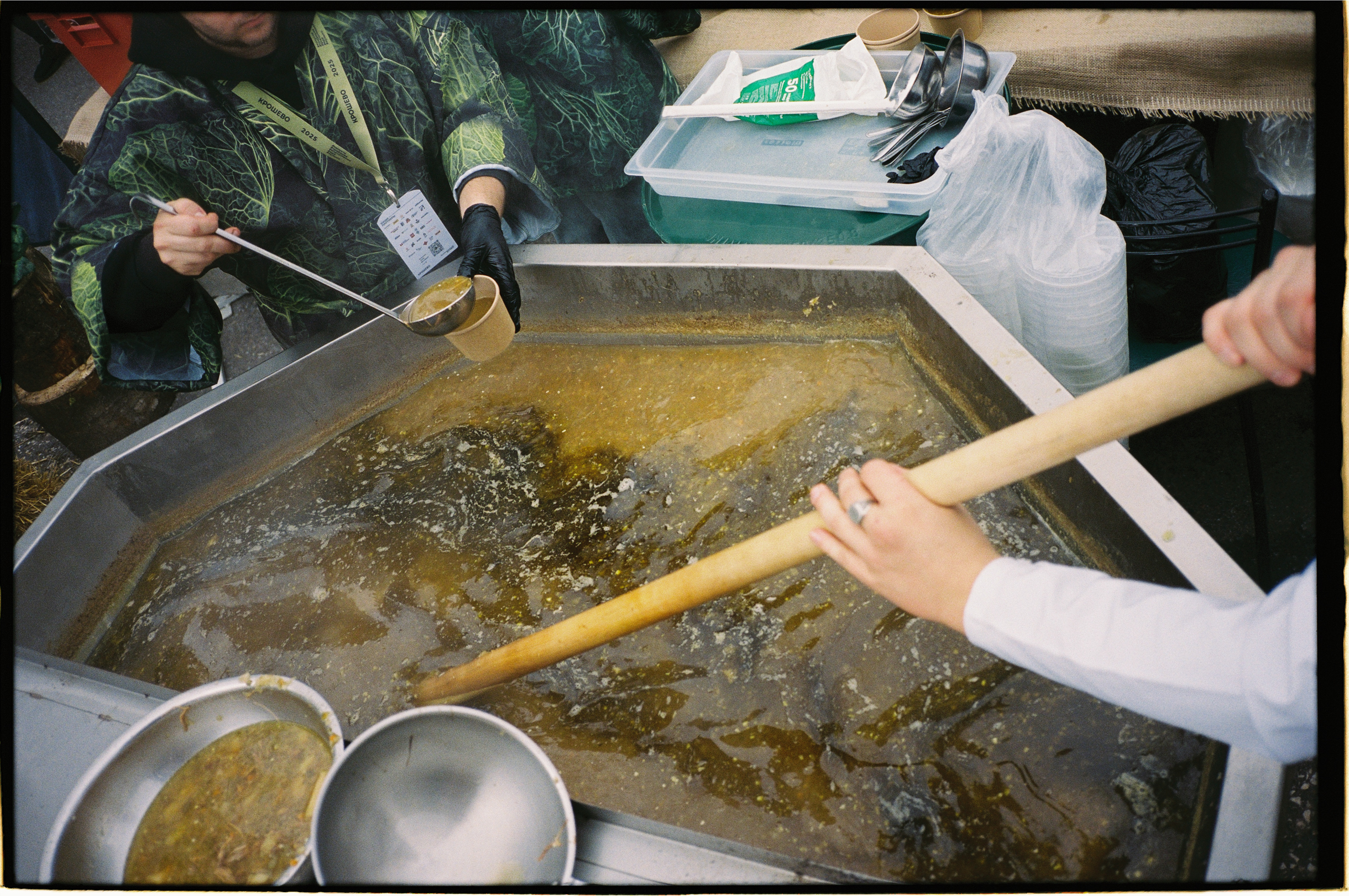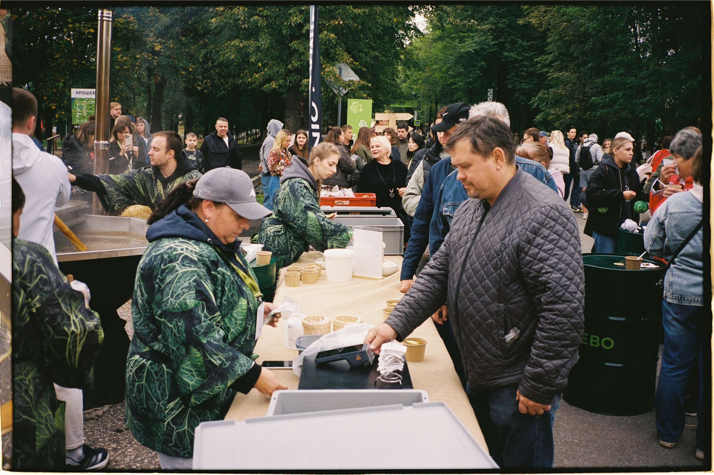 🥬 За серыми щами из чана выстроилась огромная очередь. На фуд-корте работало немало лавок с едой, но гигантский котел капустного супа манил посетителей как магнит. Отнюдь не богатырская порция стоила 500 ₽, но попробовать те самые серые щи хотели все. Чтобы получить свою миску, пришлось отстоять под дождем 45 минут, но в очереди удалось поболтать с местными жителями.
