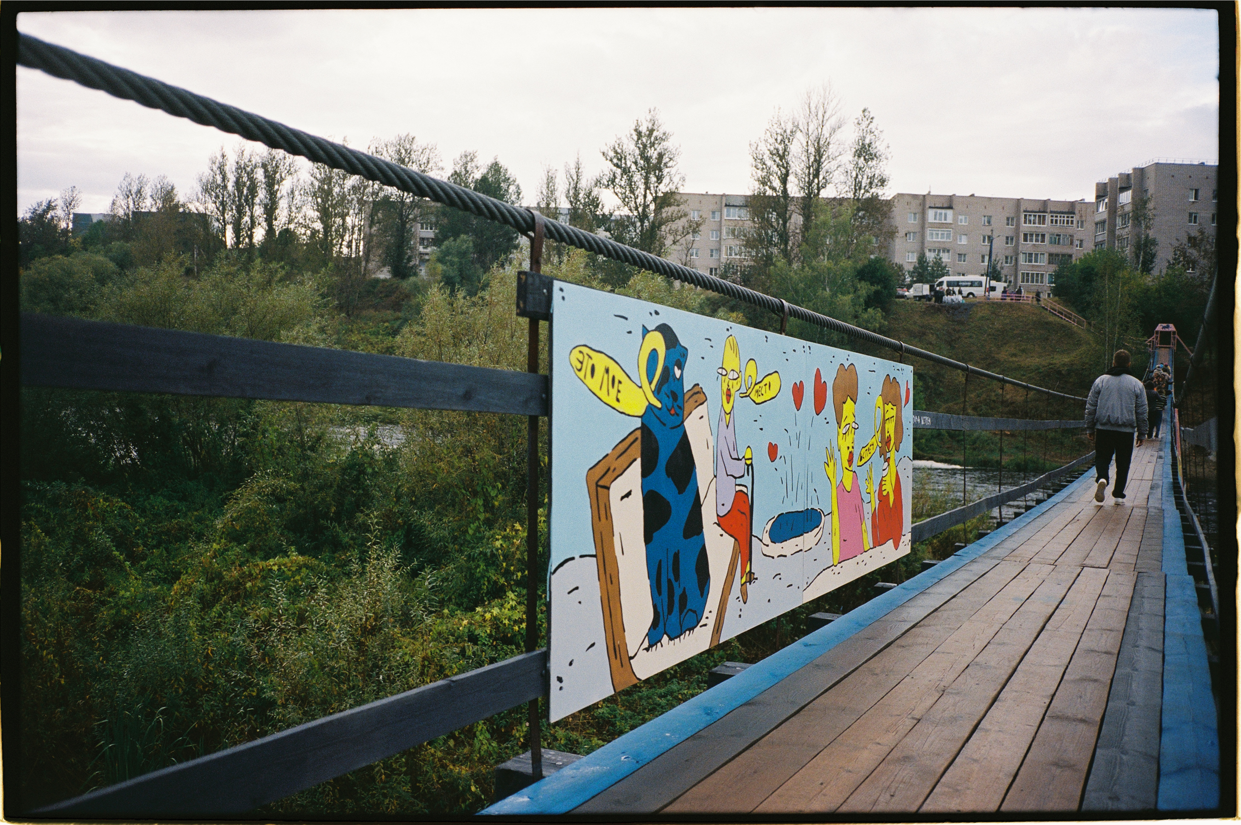🥬 В рамках фестиваля открыли выставку художника Вовы Цыгана. Десять работ разместили под открытым небом на подвесном мосту — получился арт-маршрут через реку. Все картины в ироничной форме рассказывают о прошлом и настоящем города, а княгиня Ольга на них соседствует с персонажами в стиле «Симпсонов» и фантазийными животными.