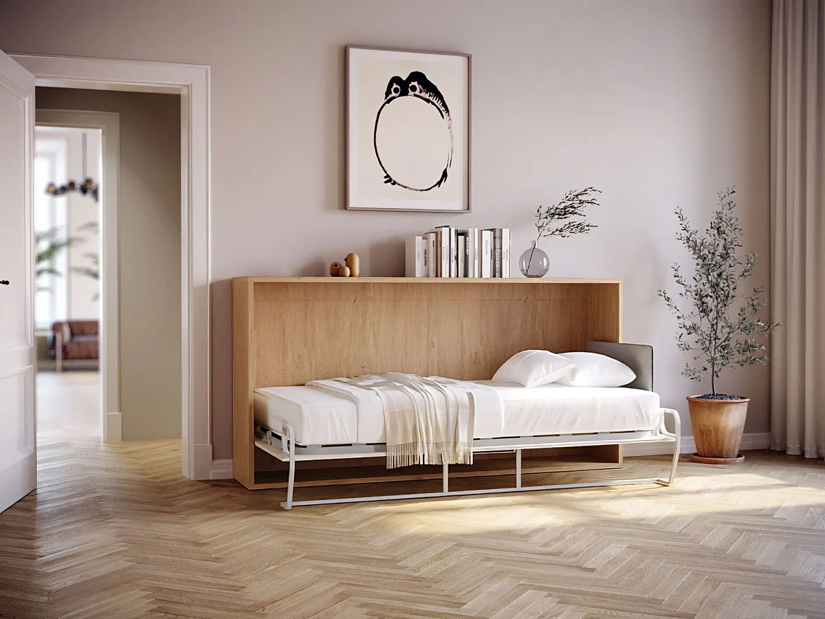 Кровать примыкает к стене боковой стороной. В сложенном виде она низкая, над ней можно повесить полки, телевизор или картины. Идеально для детских комнат или очень узких помещений (коридорного типа). Над такой кроватью остается свободное пространство стены, что визуально делает комнату просторнее.