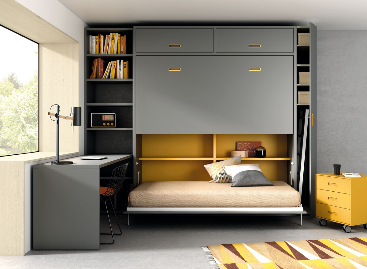 Вариант для детской или домашнего офиса. Когда кровать поднимается, рабочая столешница остается горизонтальной.