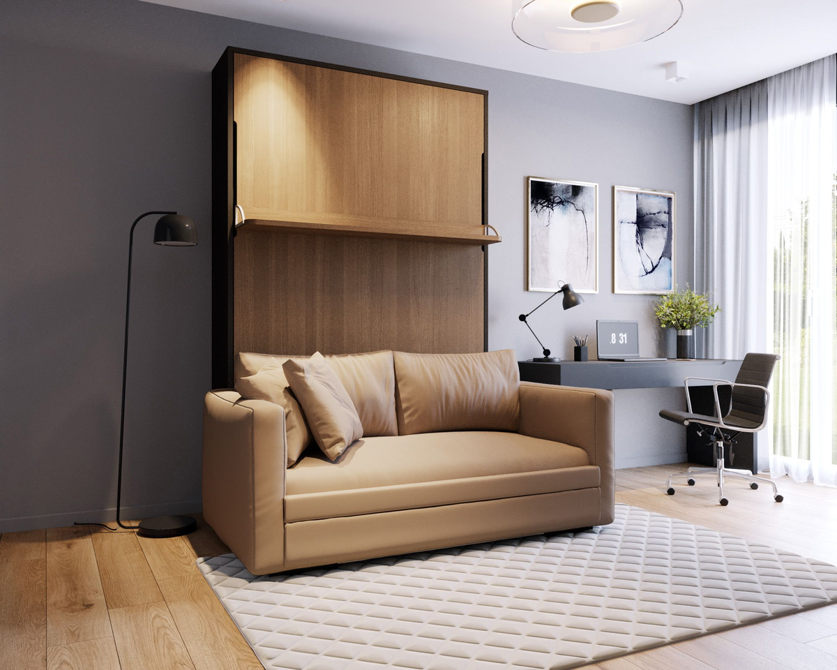 Мой любимый вариант для единственной комнаты в квартире. Снаружи это полноценный диван, а над ним — фасад шкафа. Когда вы опускаете кровать, она ложится прямо на диван (подушки спинки при этом либо убираются, либо уходят вниз). Это максимально функционально. У вас есть зона для отдыха днем и полноценное спальное место ночью.