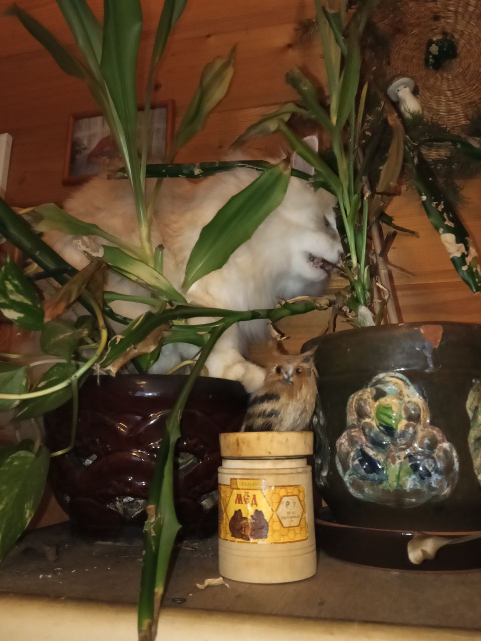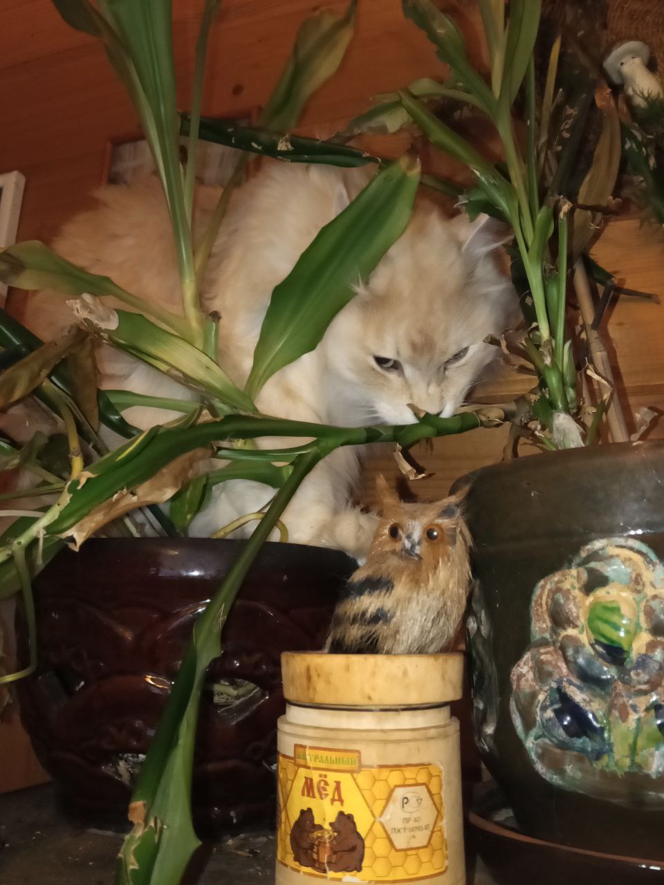 Фото питомца: курильский бобтейл Барон интересуется игрушечным совенком