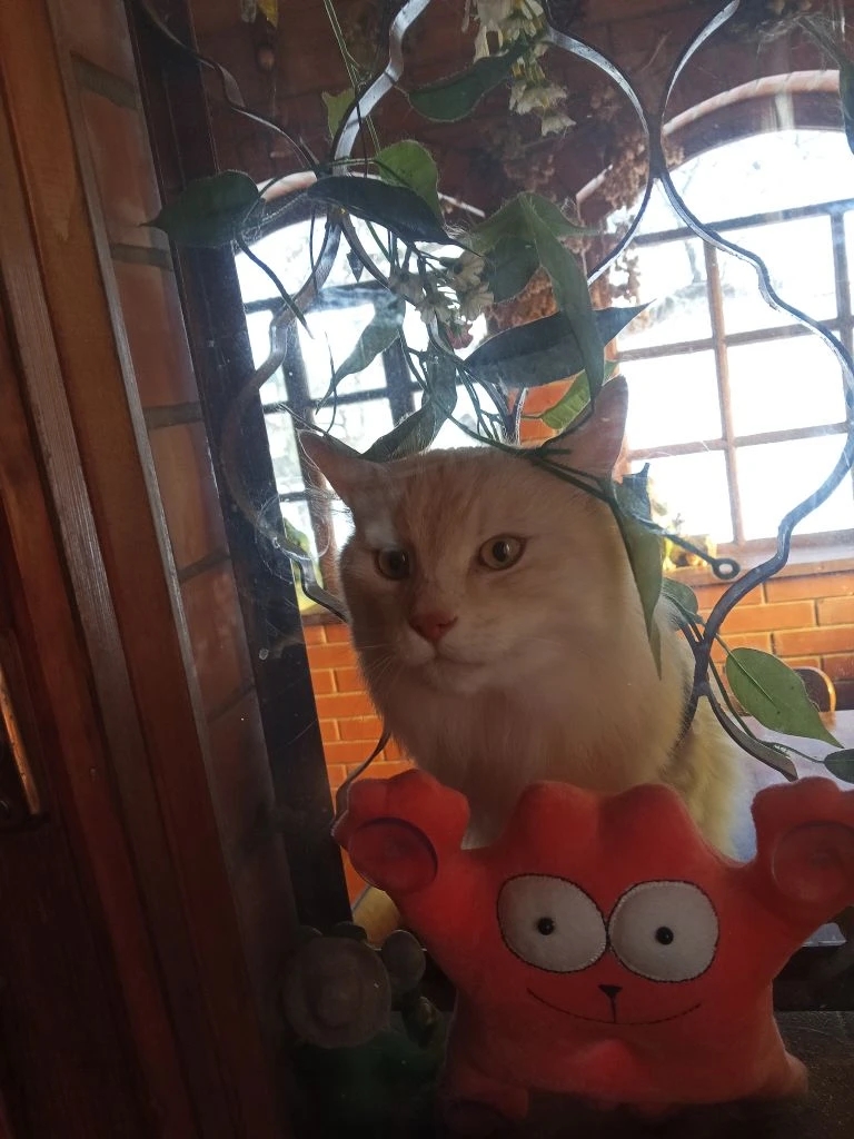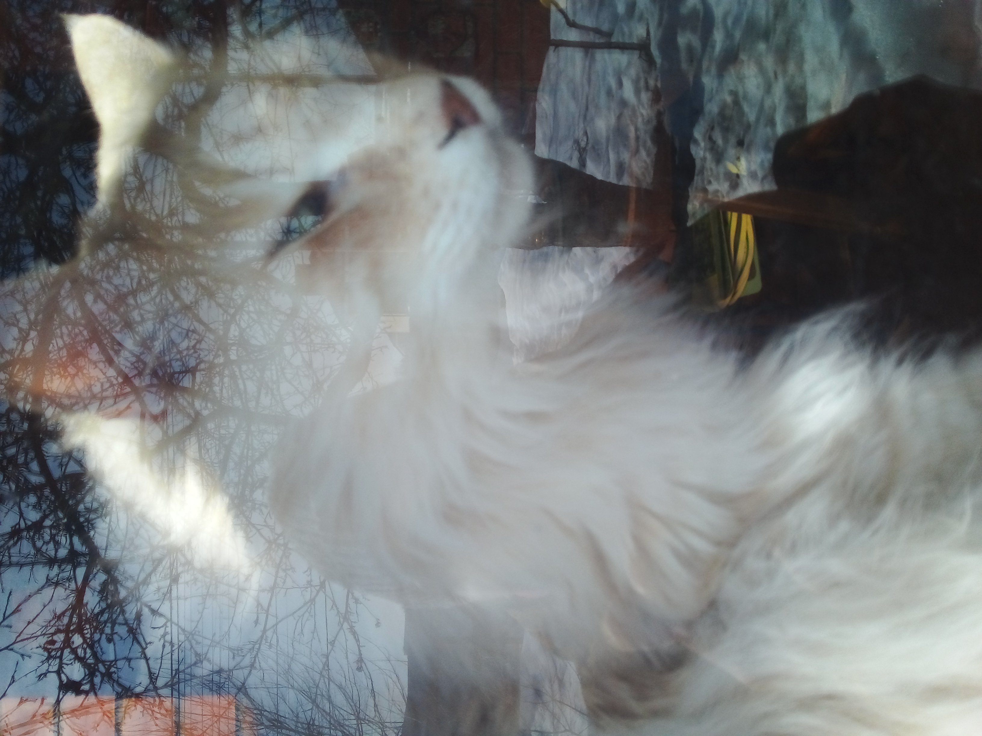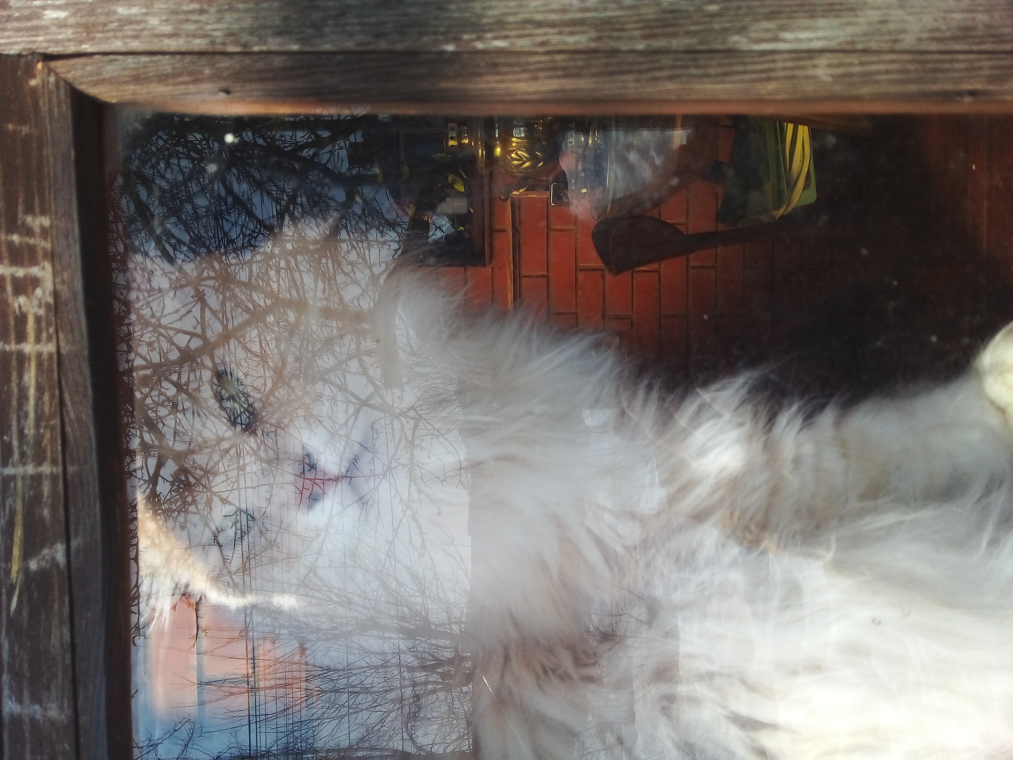 Батон смотрит в дом, и очень интересуется, какой обед у нас на столе, а Барон наслаждается видом природы из другого окна.