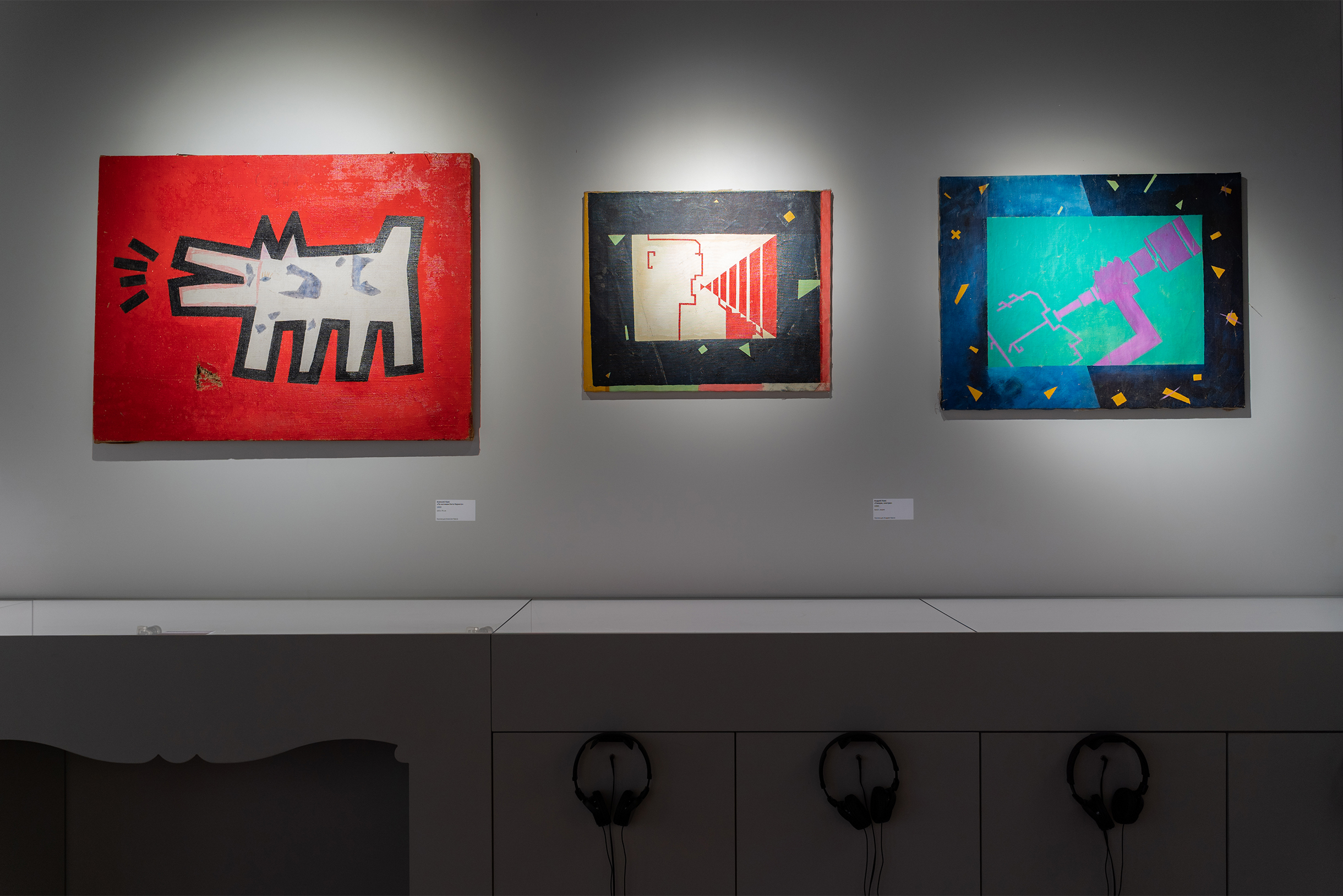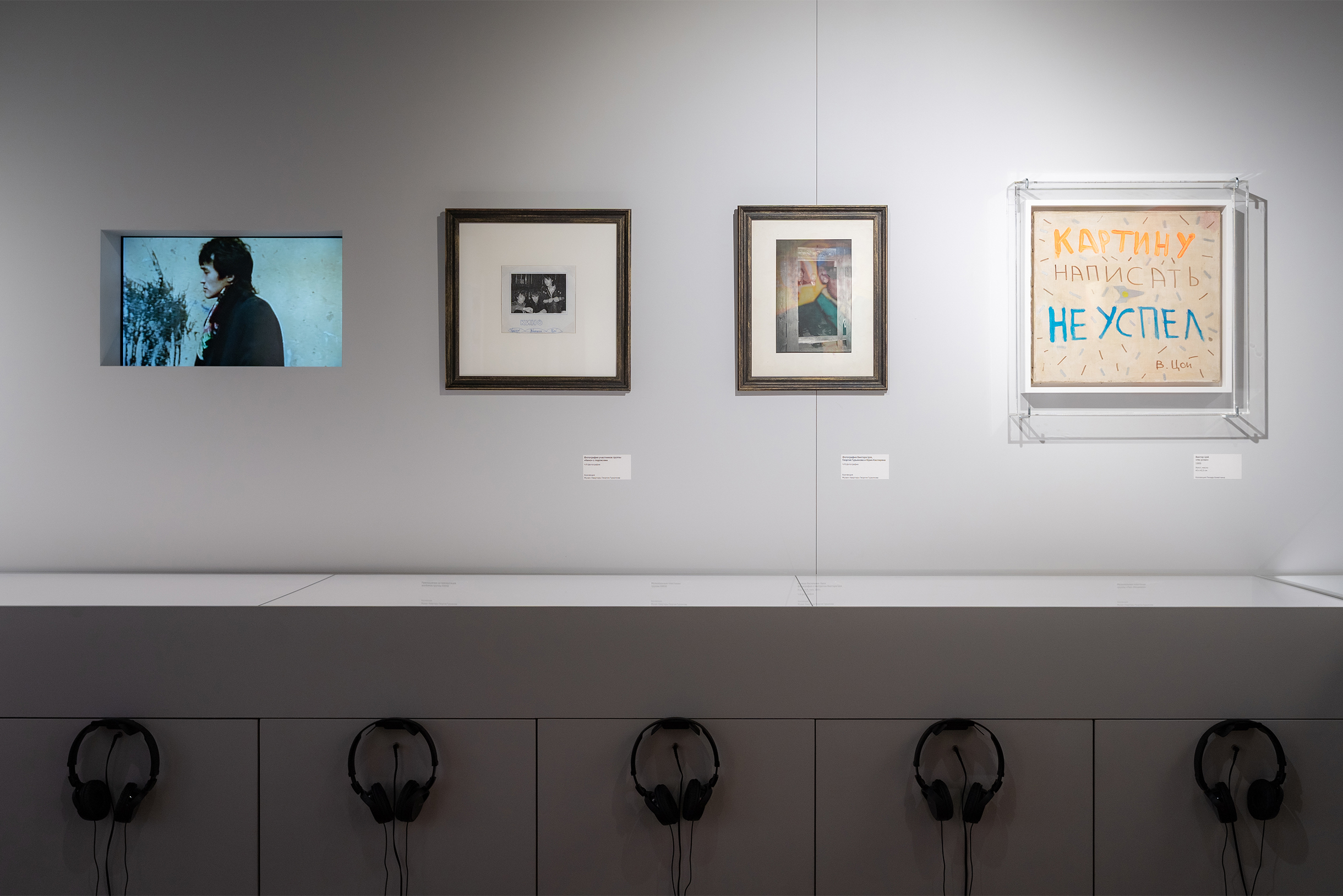 Следующий адрес посвящен фронтмену «Кино» — Виктору Цою. Кроме записей группы, которые можно послушать в наушниках, и фотографий выставлена работа «Картину написать не успел». Ее музыкант подготовил к выставке «Новых художников» — творческой группе Тимура Новикова, которой также посвящен отдельный зал.