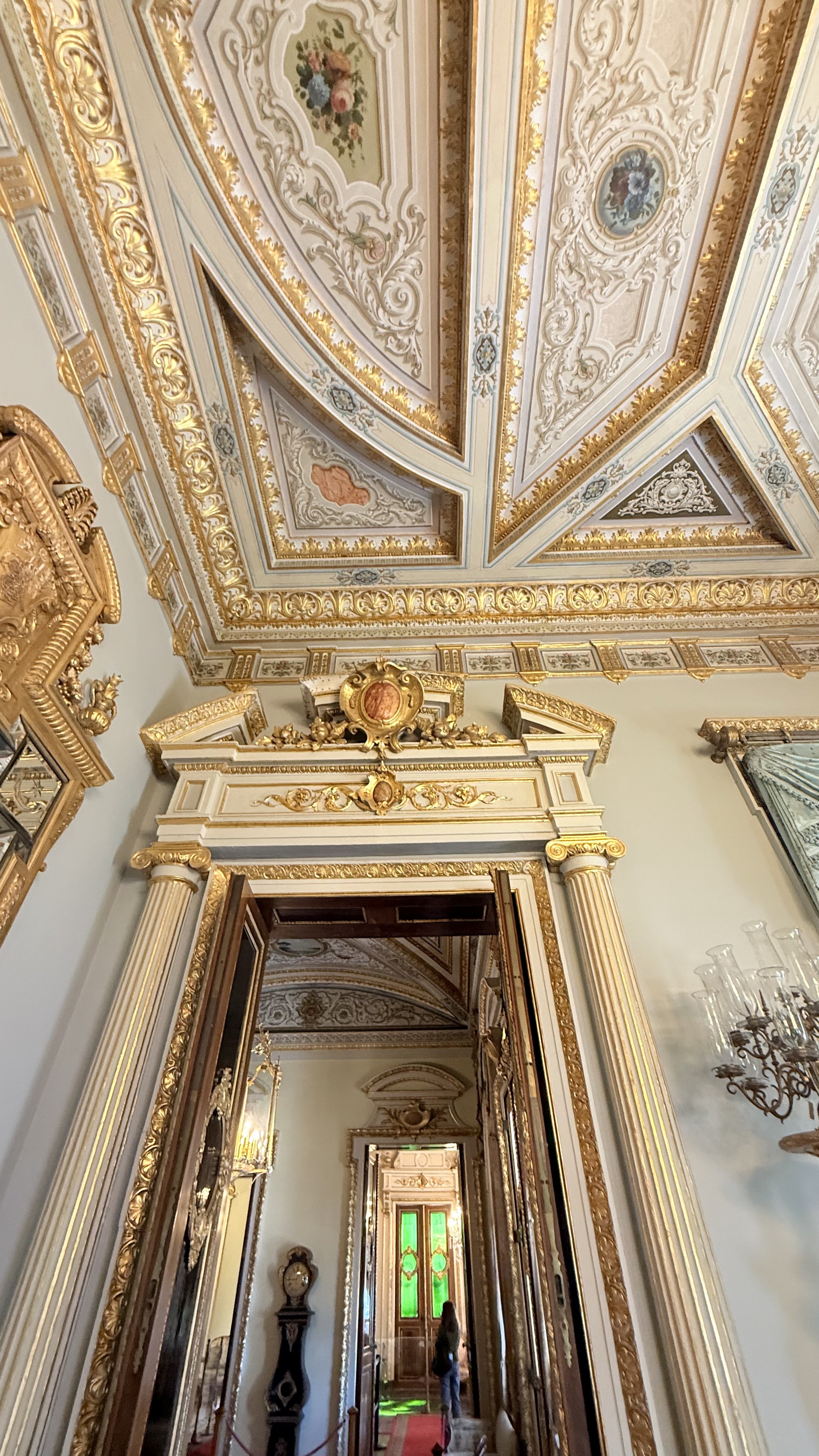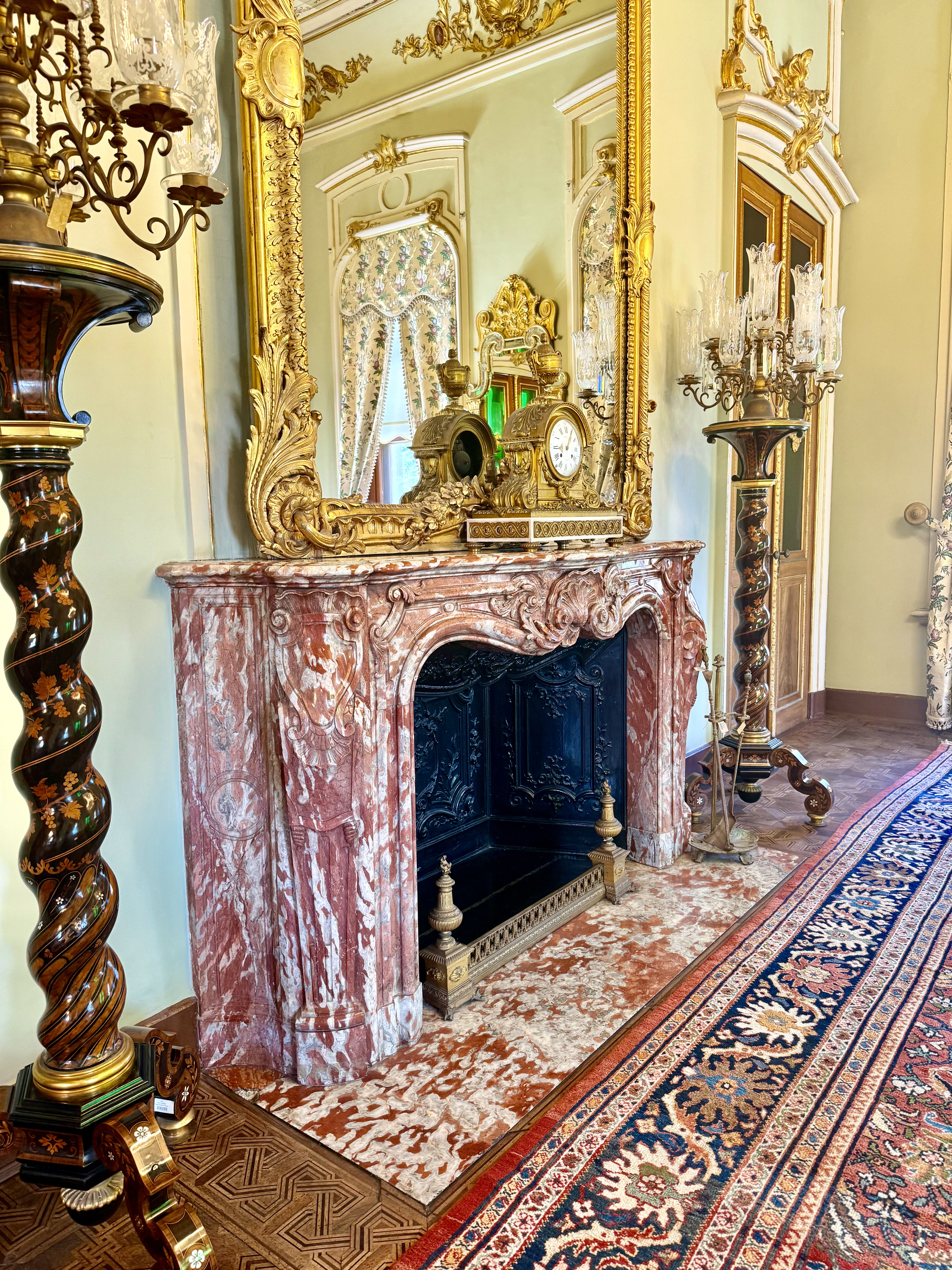 Дворец двухэтажный, на каждом этаже — по четыре комнаты. Потолки украшены лепниной и расписными декоративными мотивами, в залах — вычурные камины, паркетные узоры, зеркала, ковры, картины, европейская мебель. Честно говоря, среди такого блеска и золота жить, наверное, тяжело. Но любоваться всем этим можно бесконечно.