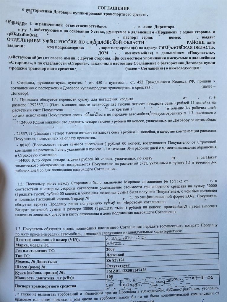Шаг 3. Переговоры и подписание соглашения о расторжении. После получения претензии автосалон пошёл на контакт. Начались переговоры. Мы жёстко стояли на своём: полное расторжение договора, возврат автомобиля, погашение кредита за счёт продавца.
