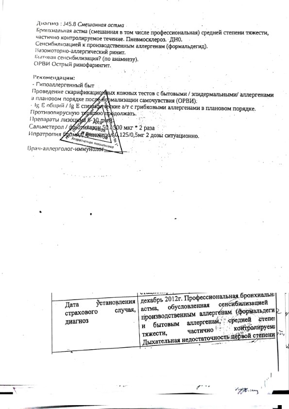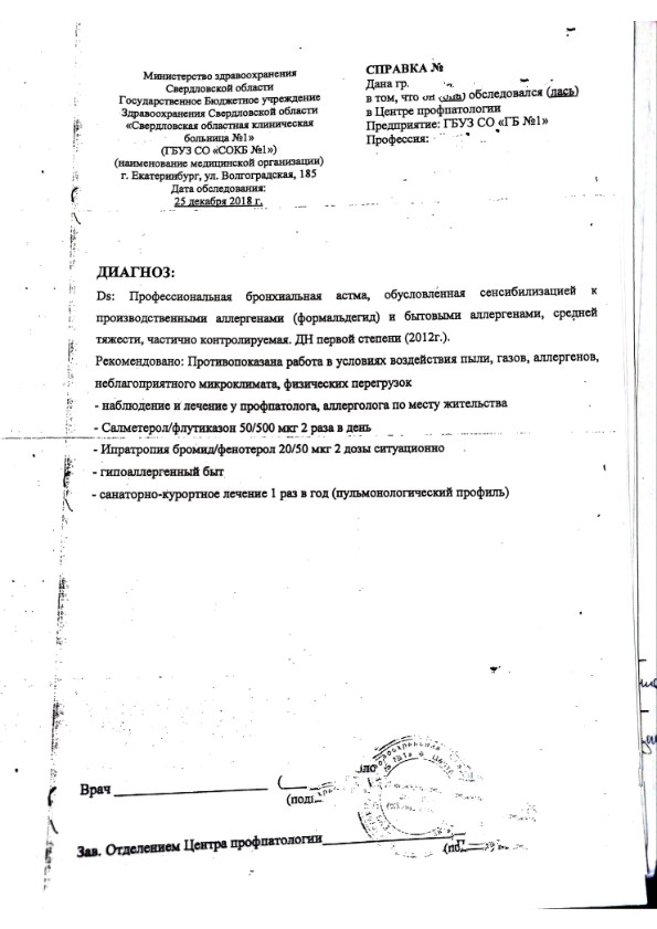 - Заключение Центра профпатологии. Врачи подтвердили: «Профессиональная бронхиальная астма, обусловленная сенсибилизацией к производственным аллергенам (формальдегид)». Противопоказана работа в условиях воздействия пыли, газов, аллергенов.